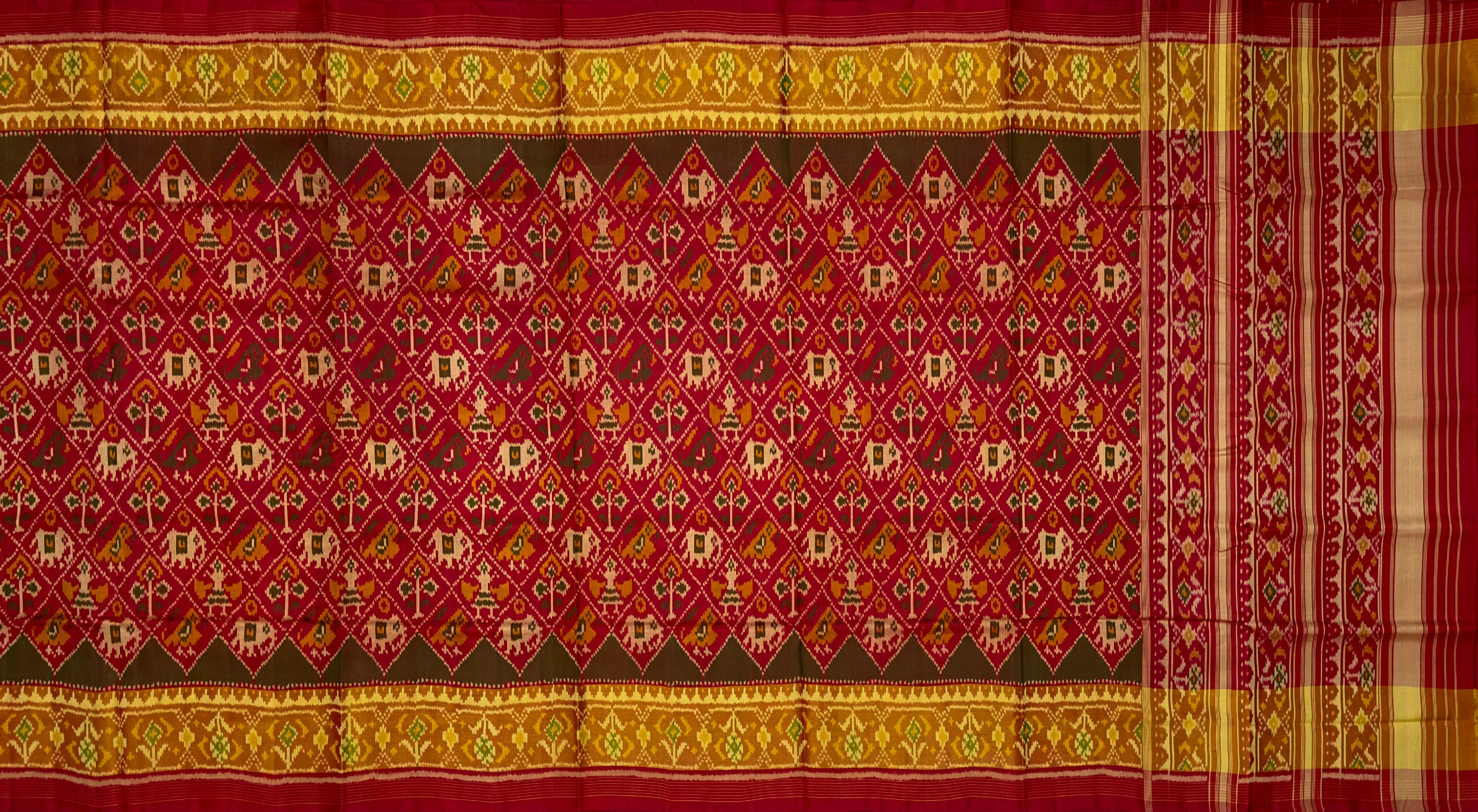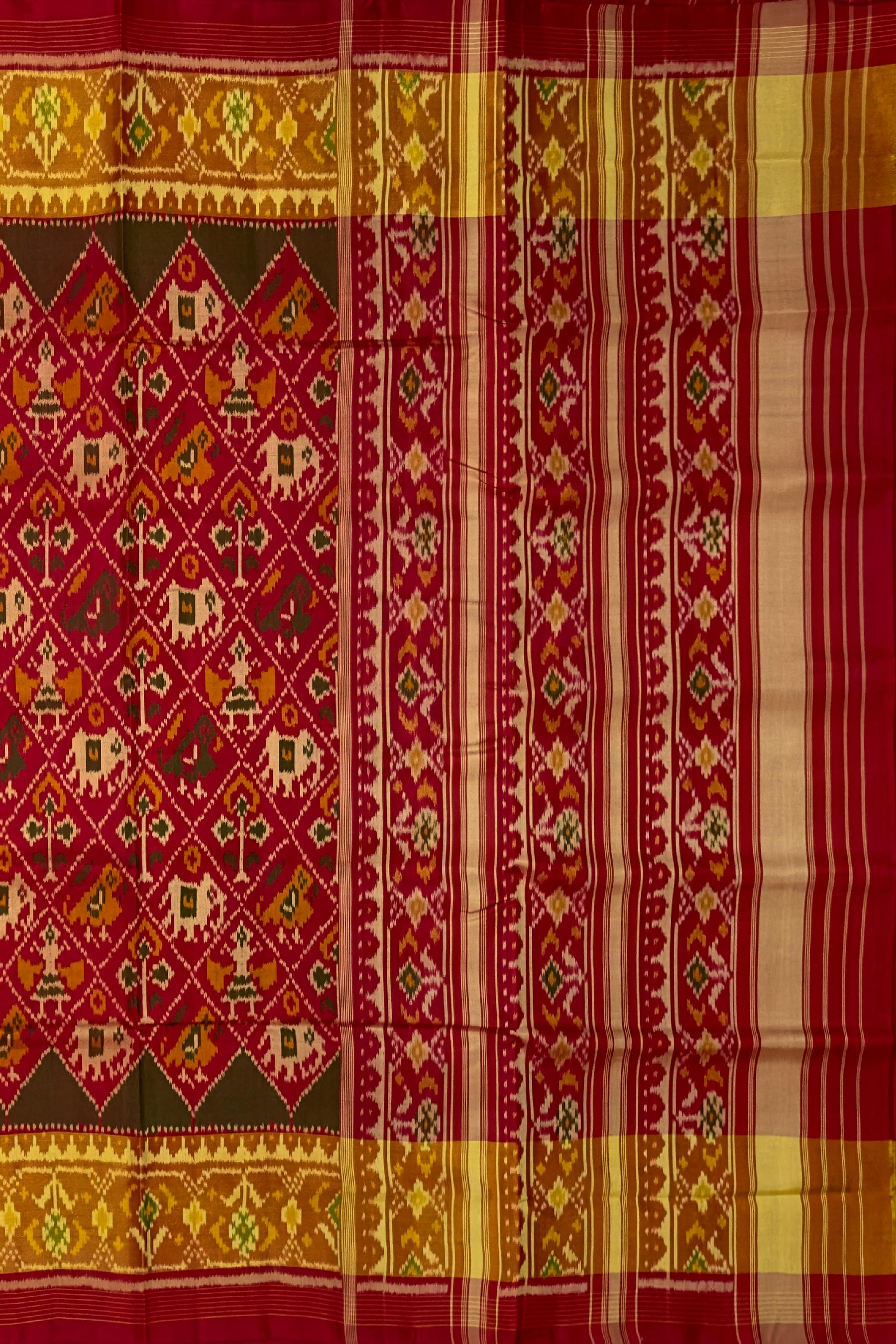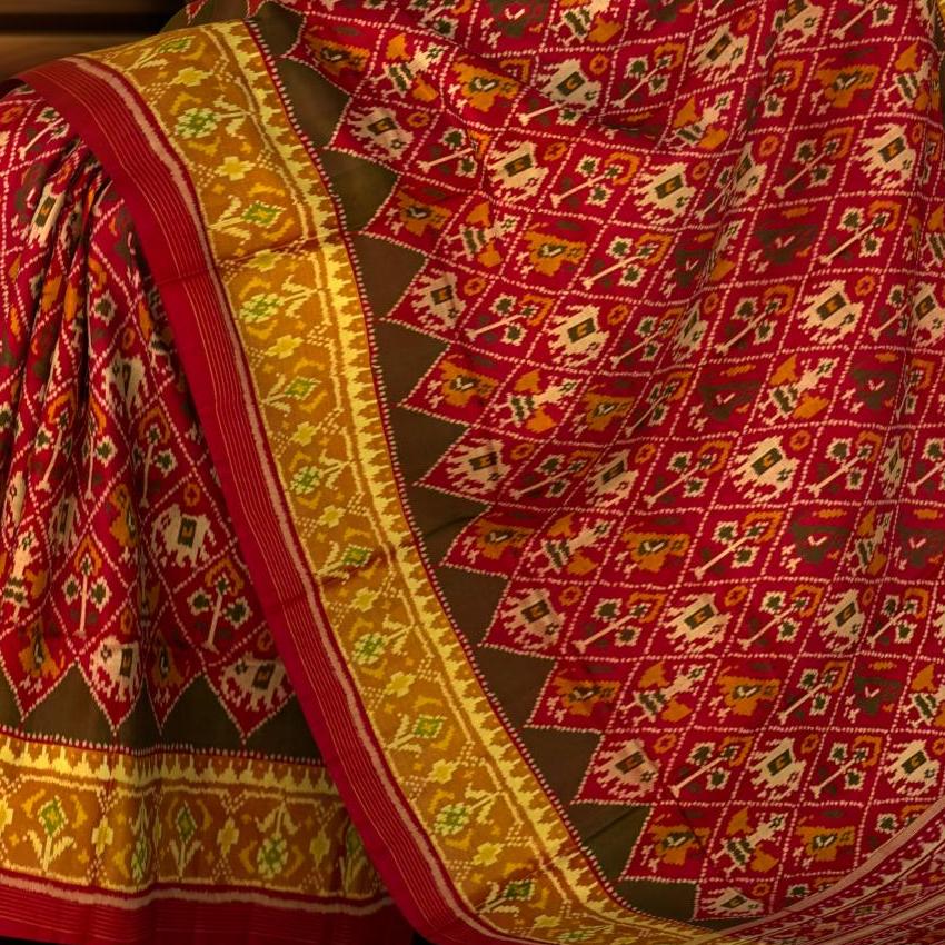 Experience the allure of the Red Maroon Nari Kunjar Patola Saree, a stunning embodiment of traditional Indian craftsmanship. Utilizing the single ikat technique, this saree features the intricate Nari Kunjar design, known for its detailed and elaborate patterns. The deep red and maroon hues provide a striking backdrop for the motifs that extend from the body to the pallu. The semi-lustrous finish adds a touch of sophistication, making it perfect for festive and cultural occasions. This saree is ideal for grand weddings, cultural festivities, and social gatherings. It embodies the rich heritage of Rajkot Patola, making each piece a unique narrative of tradition and pride. Adorn yourself with the Red Maroon Nari Kunjar Patola Saree, a timeless addition to your wardrobe that celebrates your roots with grace and elegance.