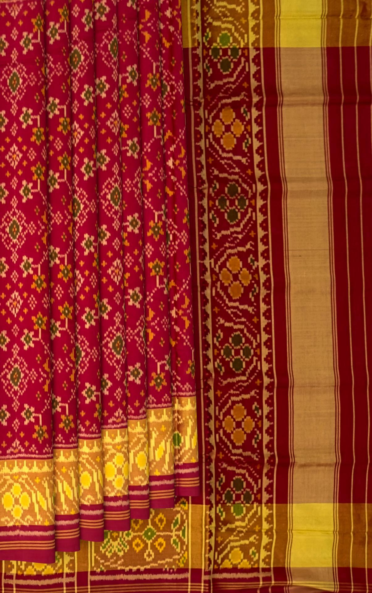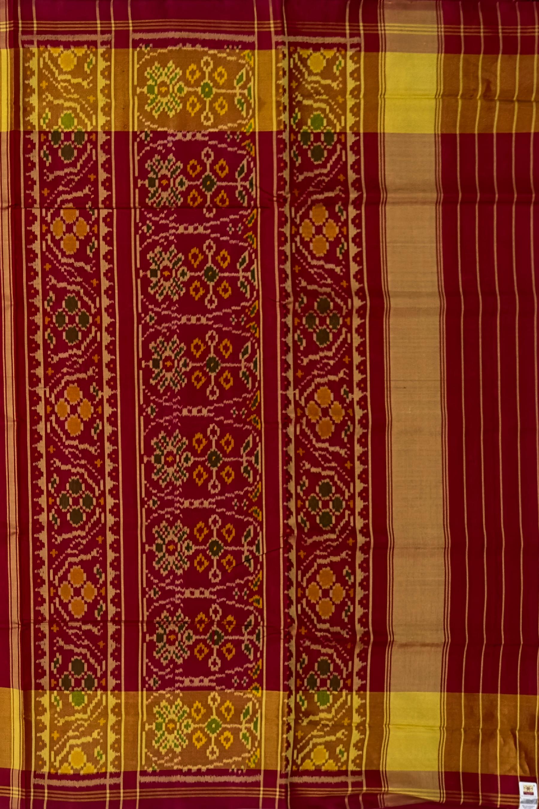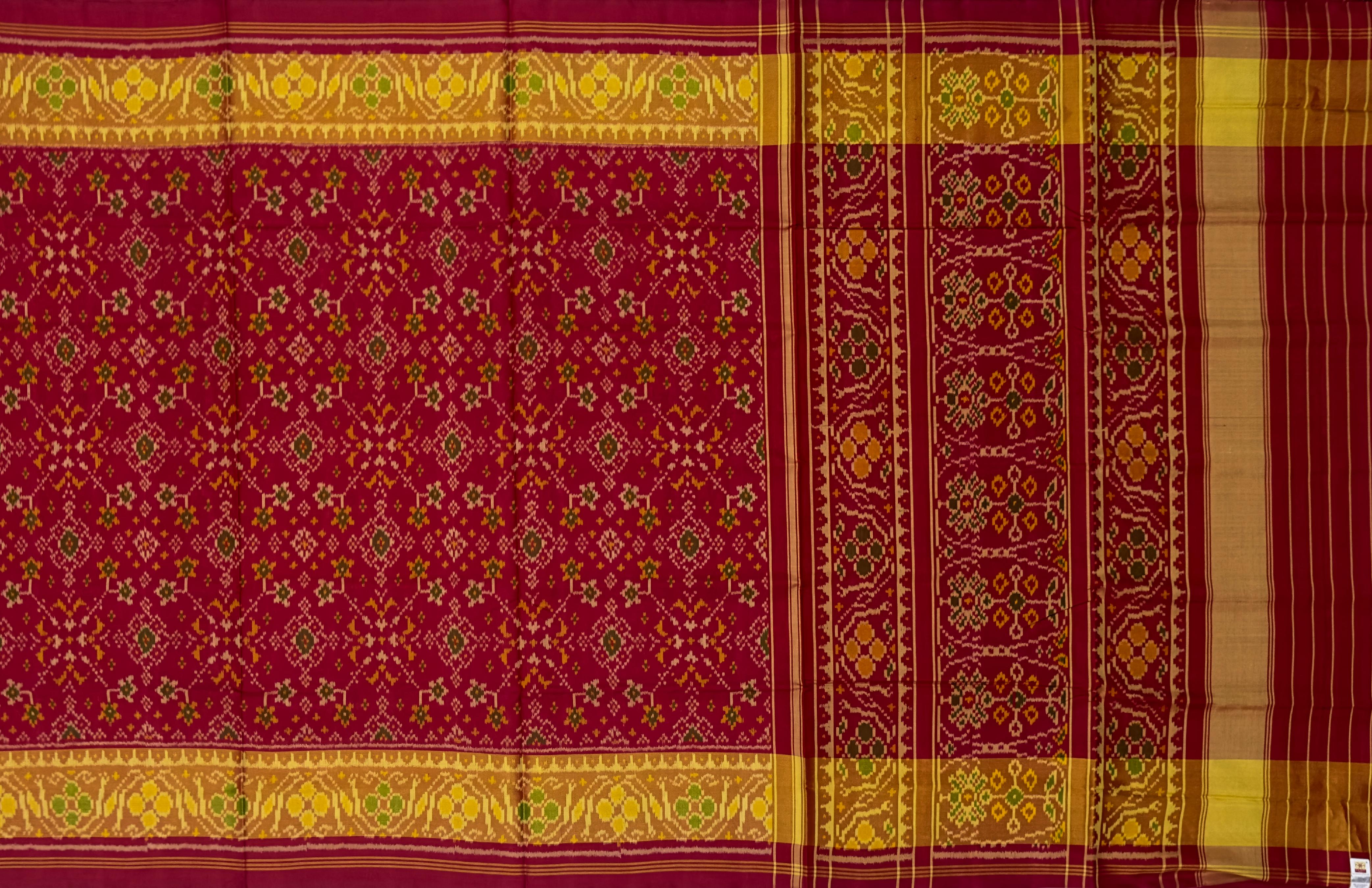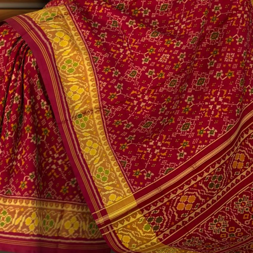 The Red Maroon Navratna Regular Rajkot Patola Saree is a rich blend of tradition and luxury, perfect for significant celebrations. Its intricate Navratna design symbolizes tradition and the craftsmanship of Rajkot.