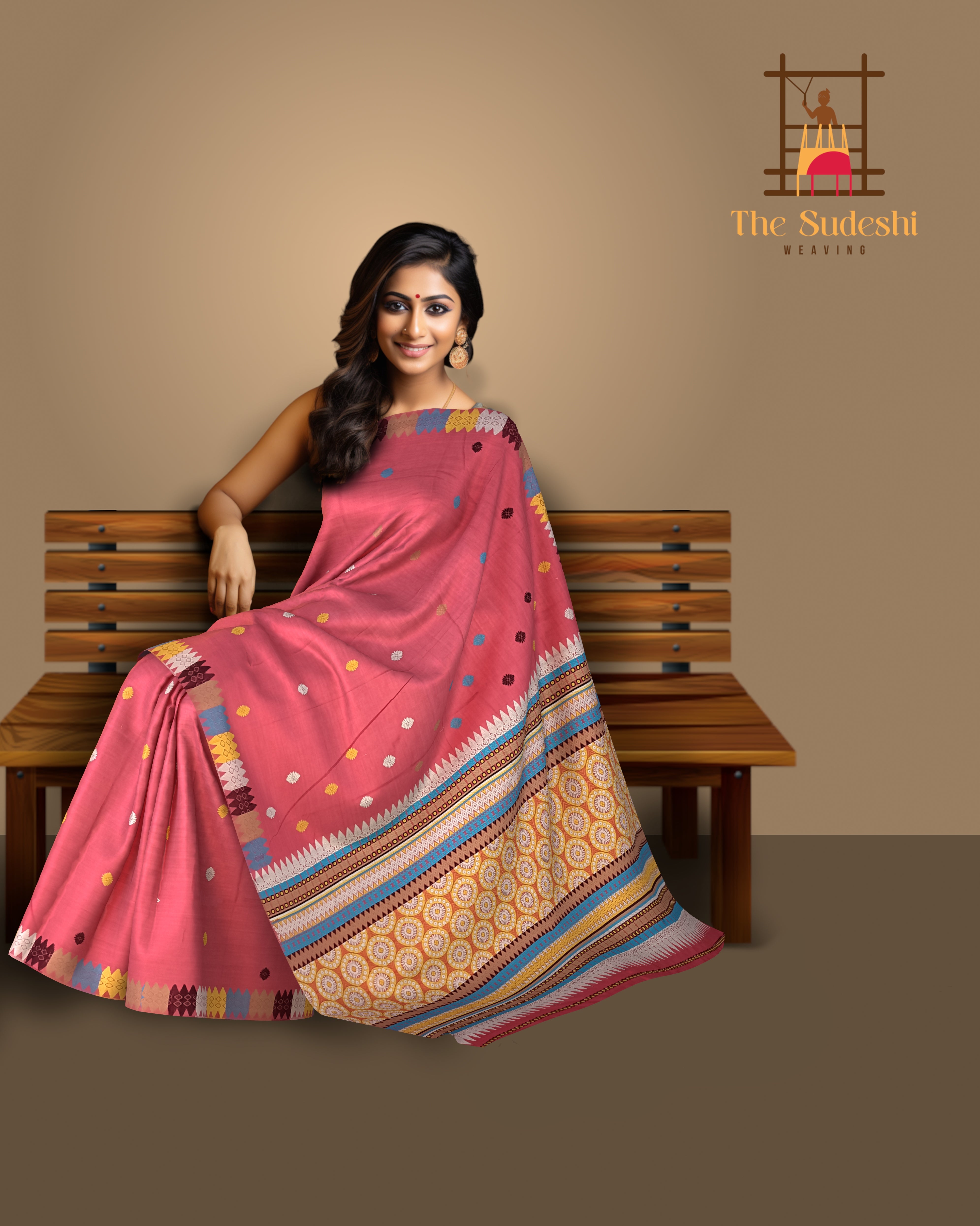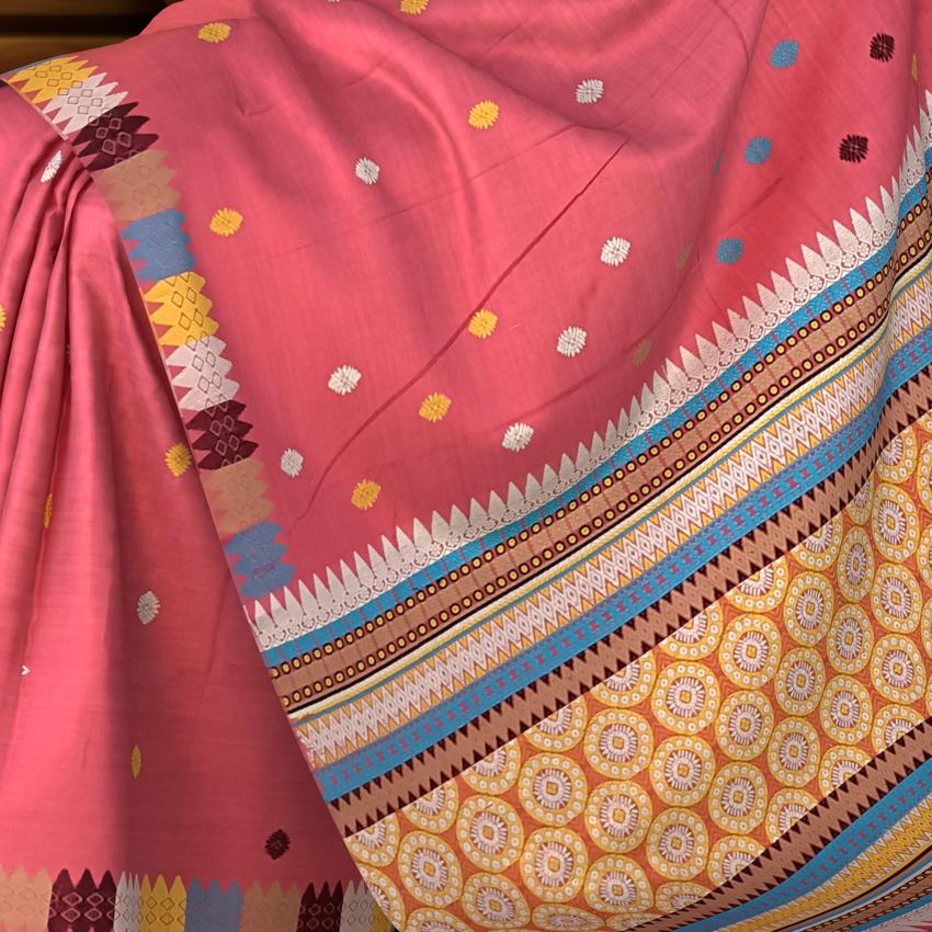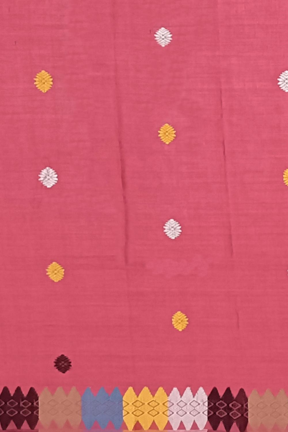 Celebrate vibrant tradition with this reddish pink Eri saree from Assam. The saree’s body is adorned with detailed buttis and motifs, creating a classic yet lively aesthetic. Its multicolor border and pallu add a touch of playful elegance, making it a standout piece in any wardrobe.