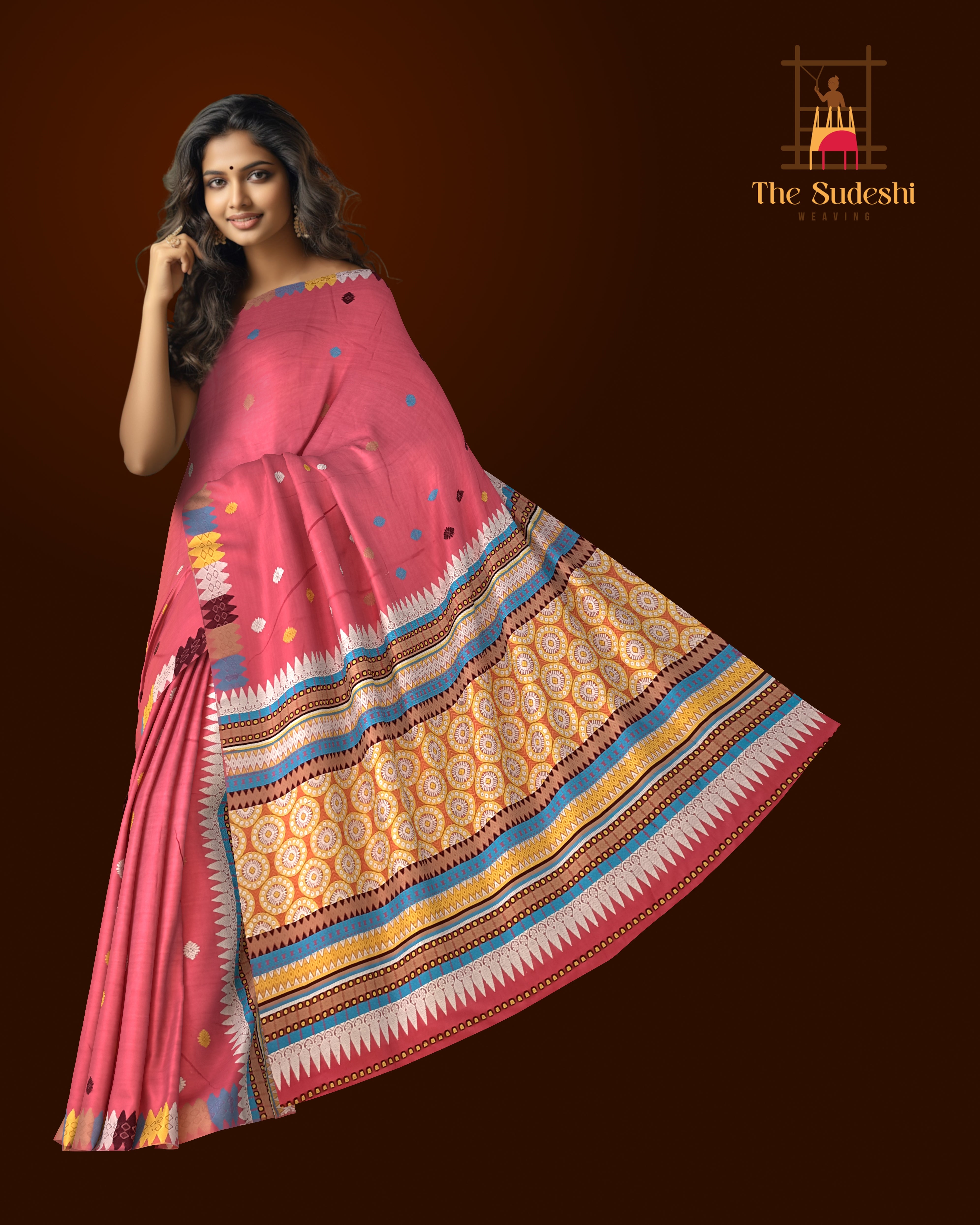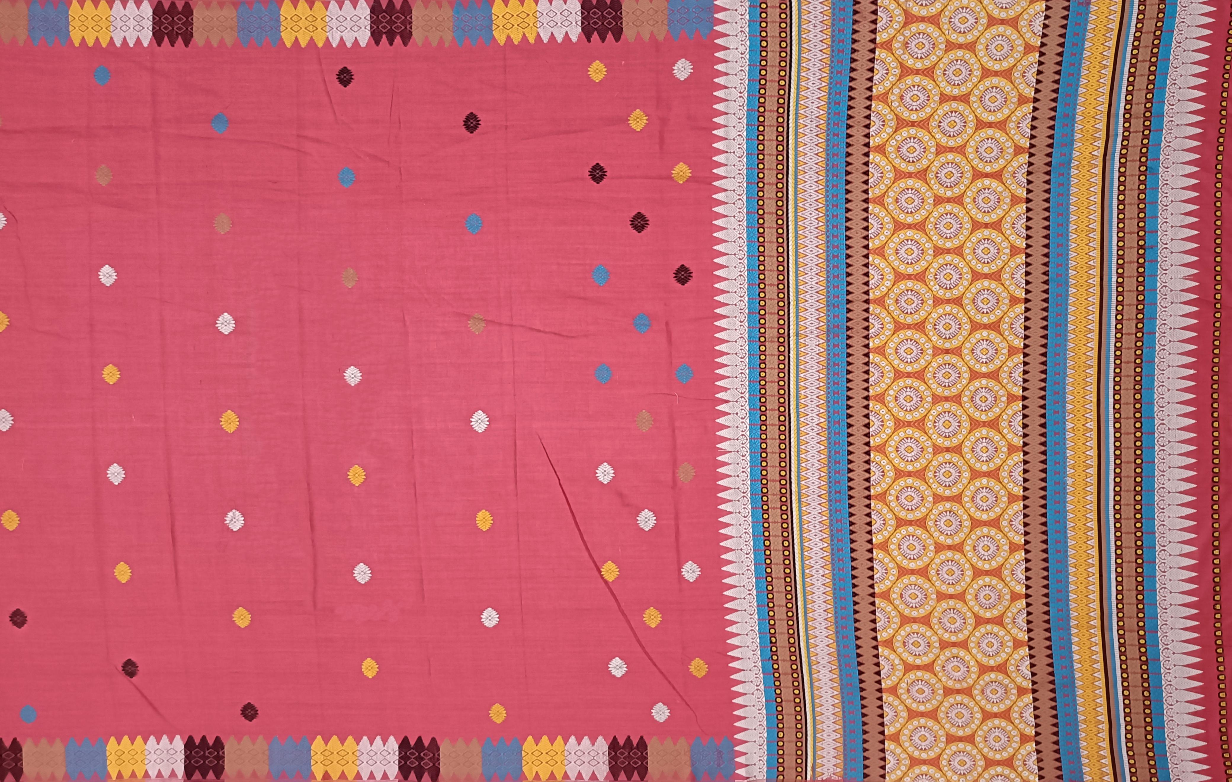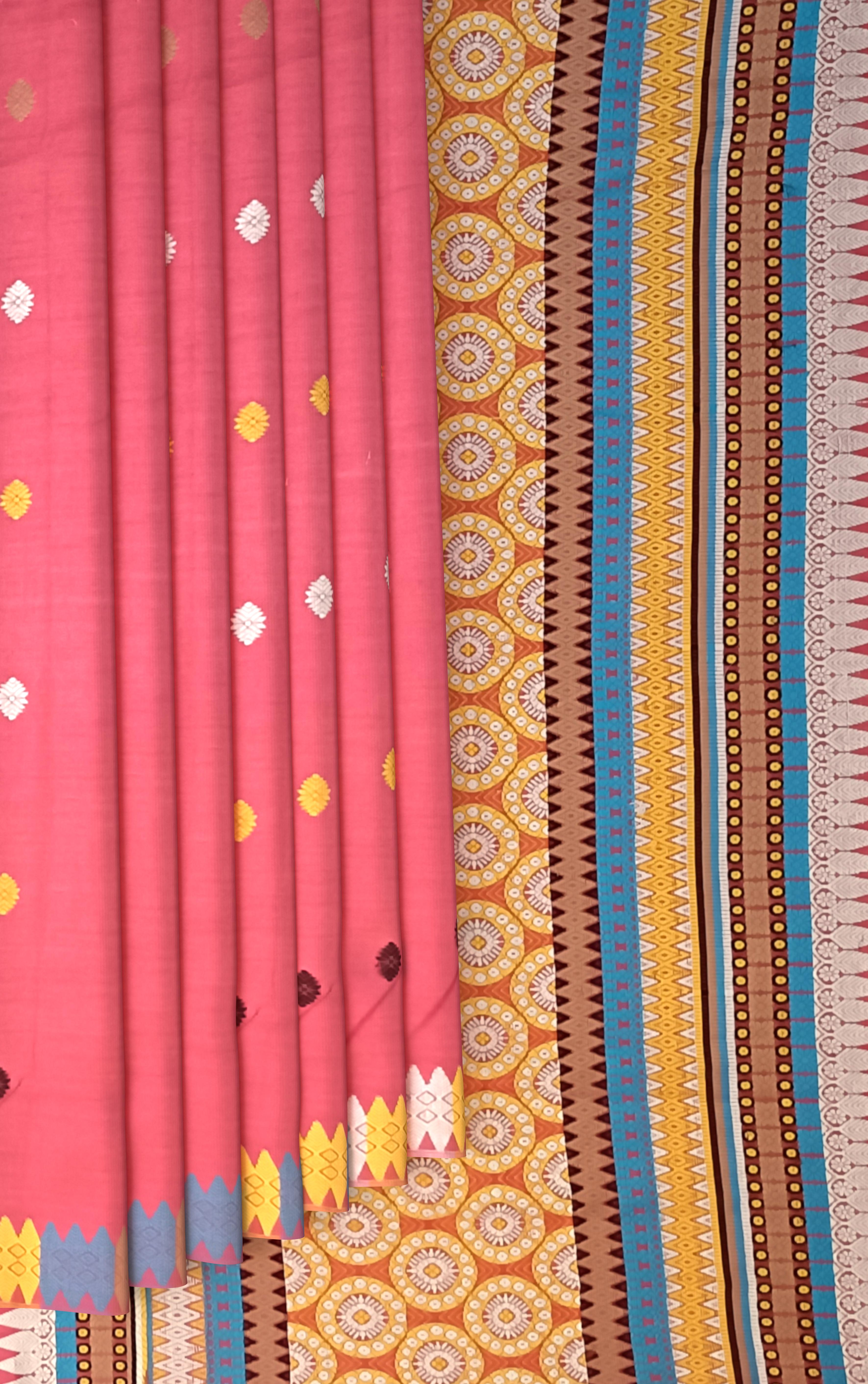 Celebrate vibrant tradition with this reddish pink Eri saree from Assam. The saree’s body is adorned with detailed buttis and motifs, creating a classic yet lively aesthetic. Its multicolor border and pallu add a touch of playful elegance, making it a standout piece in any wardrobe.