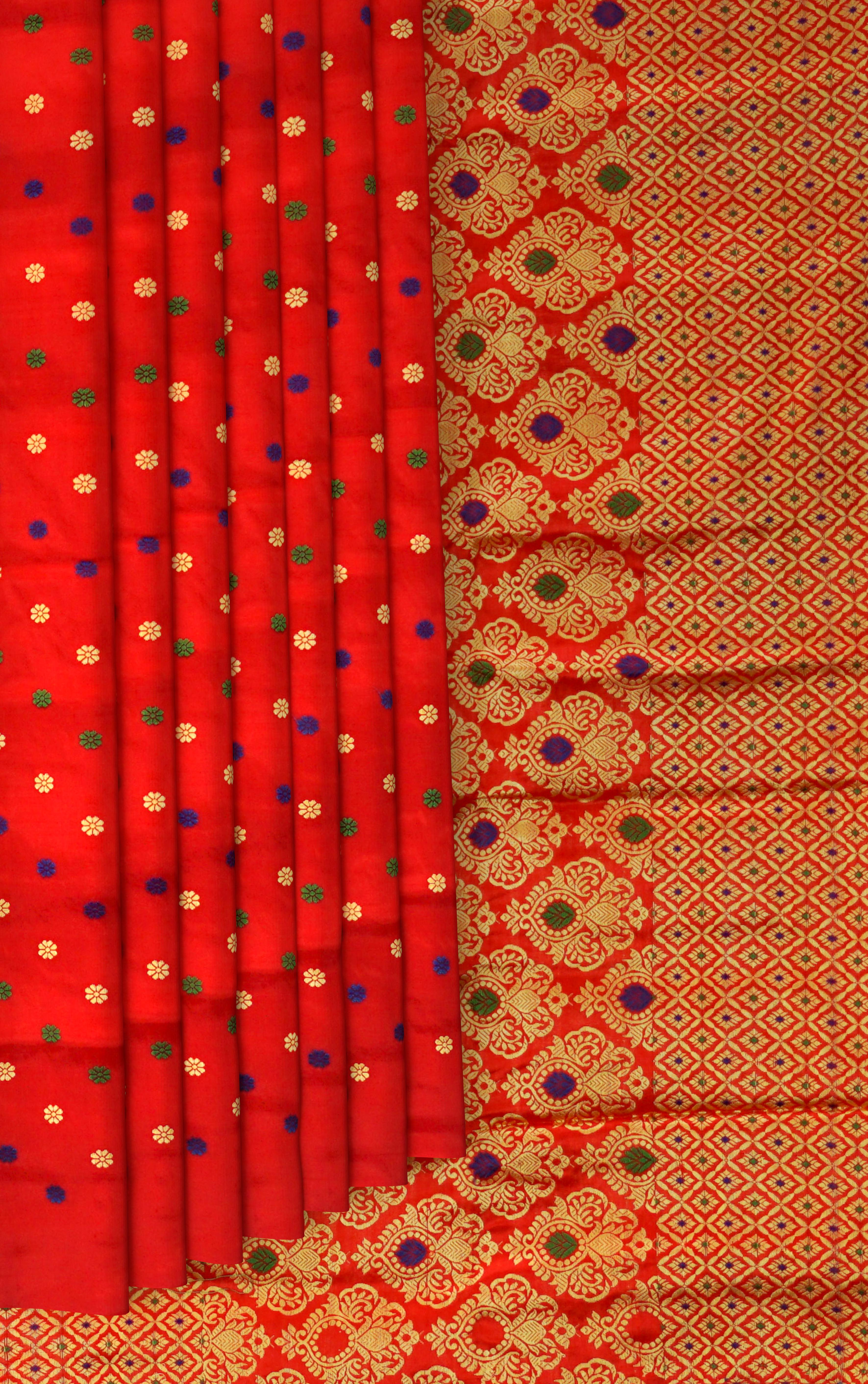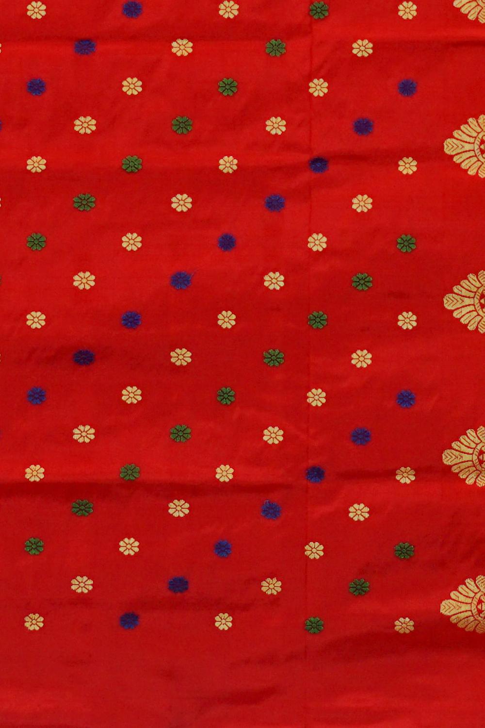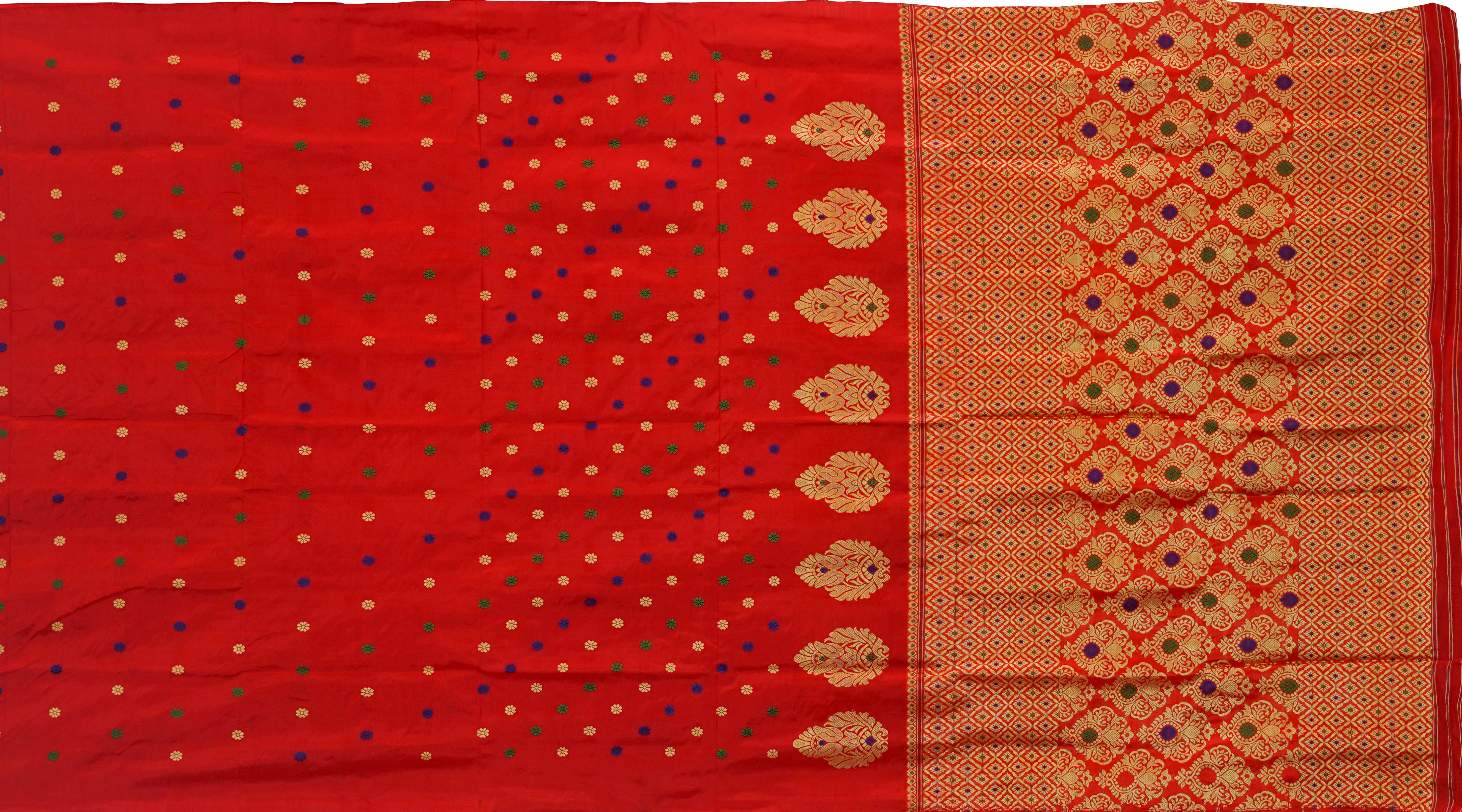 The motifs on this saree are inspired by Assamese culture and nature, featuring geometric and stylized patterns that symbolize flowers, plants, and traditional artifacts. These motifs, woven using the extra-weft technique and viscose, add a raised, embossed effect that enhances the saree's texture and depth. The combination of red and gold is both regal and contemporary, appealing to women of all ages.