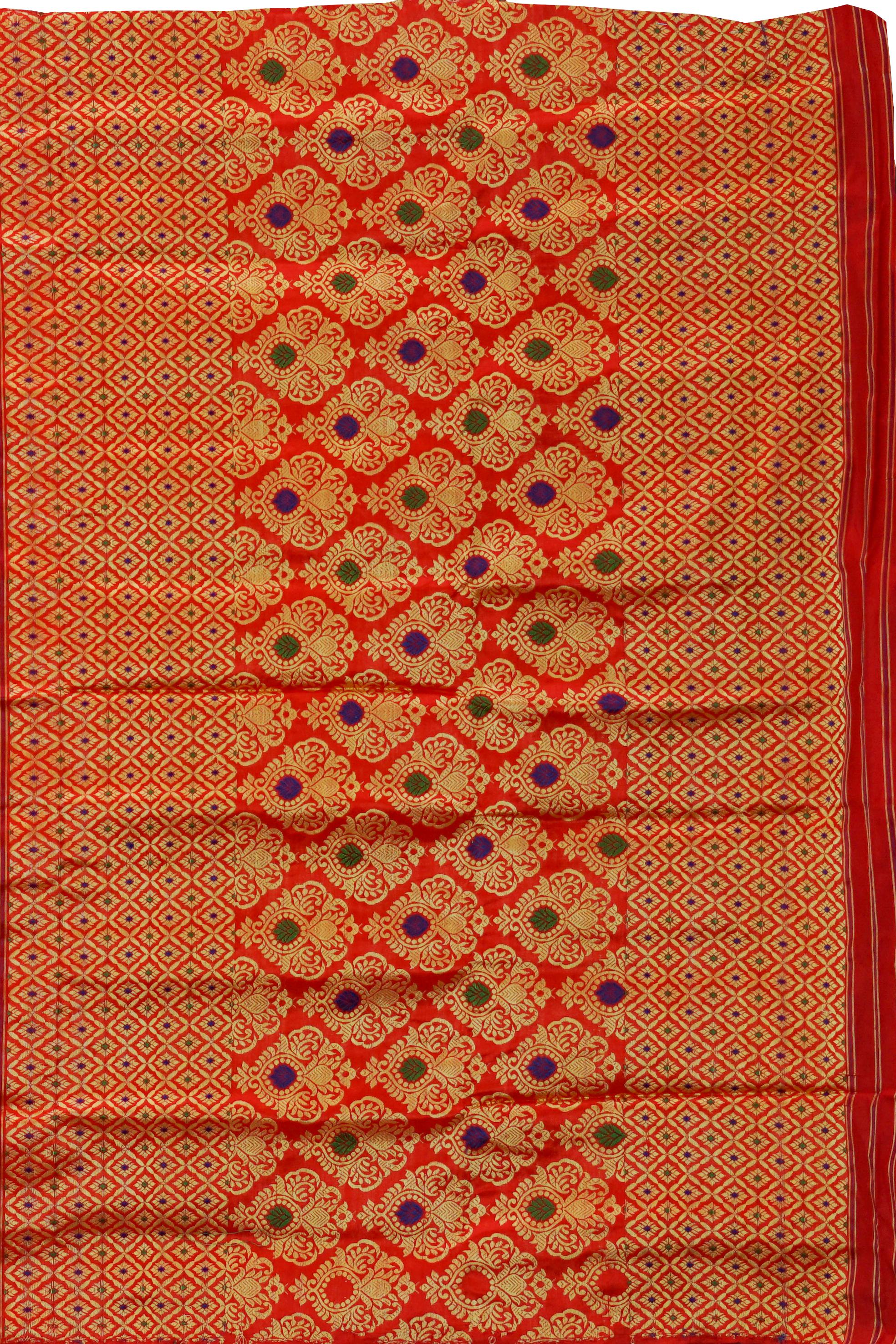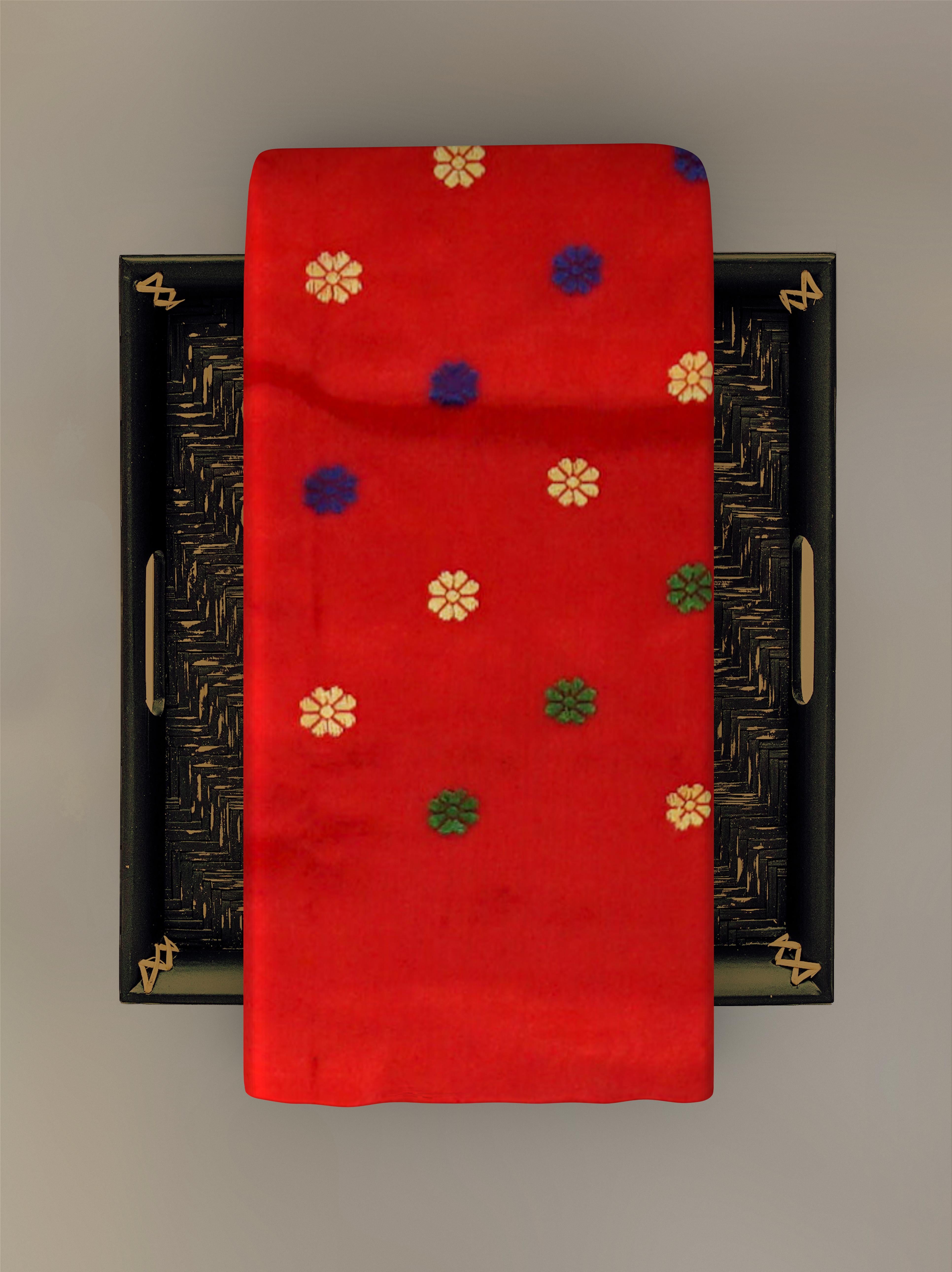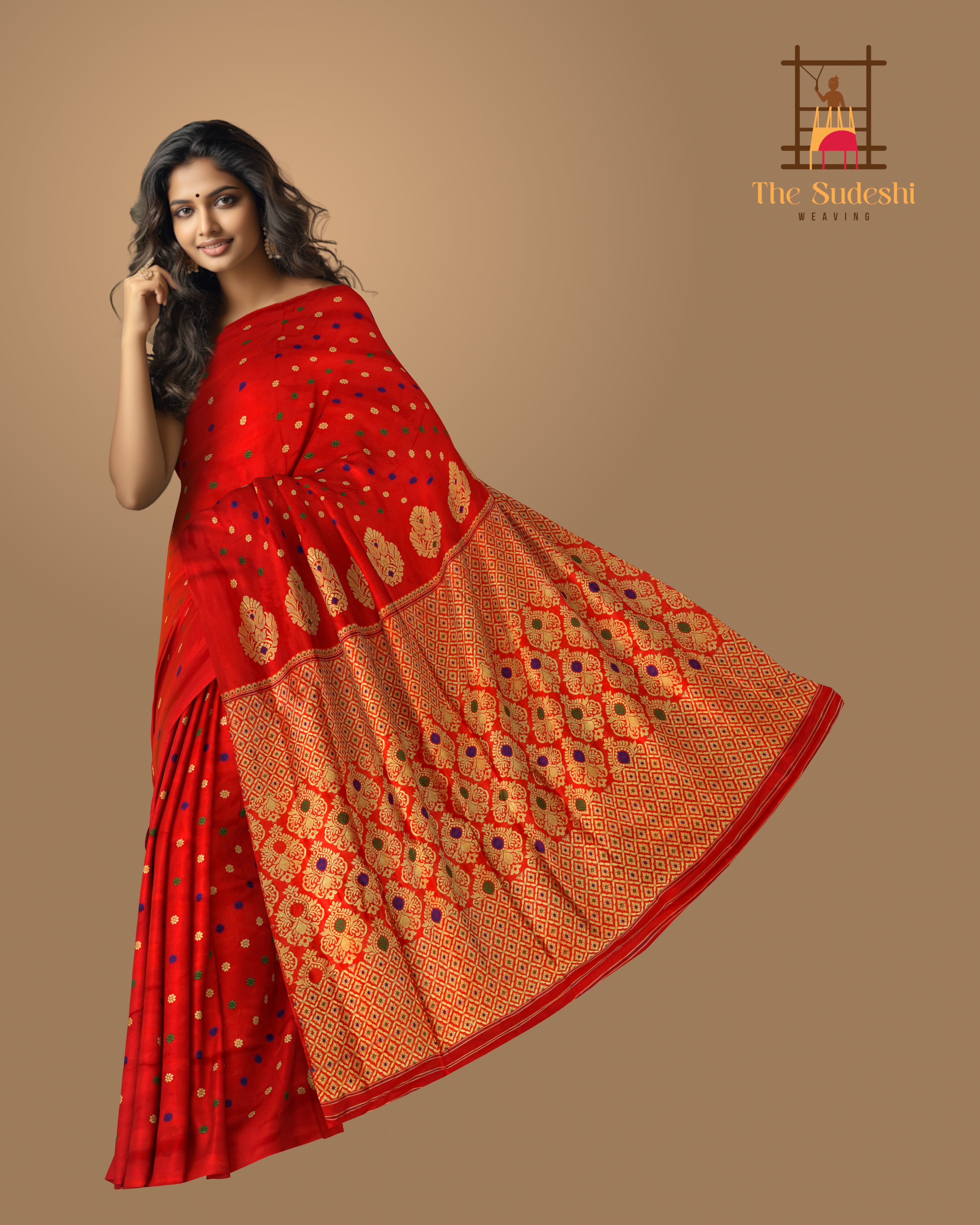 The motifs on this saree are inspired by Assamese culture and nature, featuring geometric and stylized patterns that symbolize flowers, plants, and traditional artifacts. These motifs, woven using the extra-weft technique and viscose, add a raised, embossed effect that enhances the saree's texture and depth. The combination of red and gold is both regal and contemporary, appealing to women of all ages.