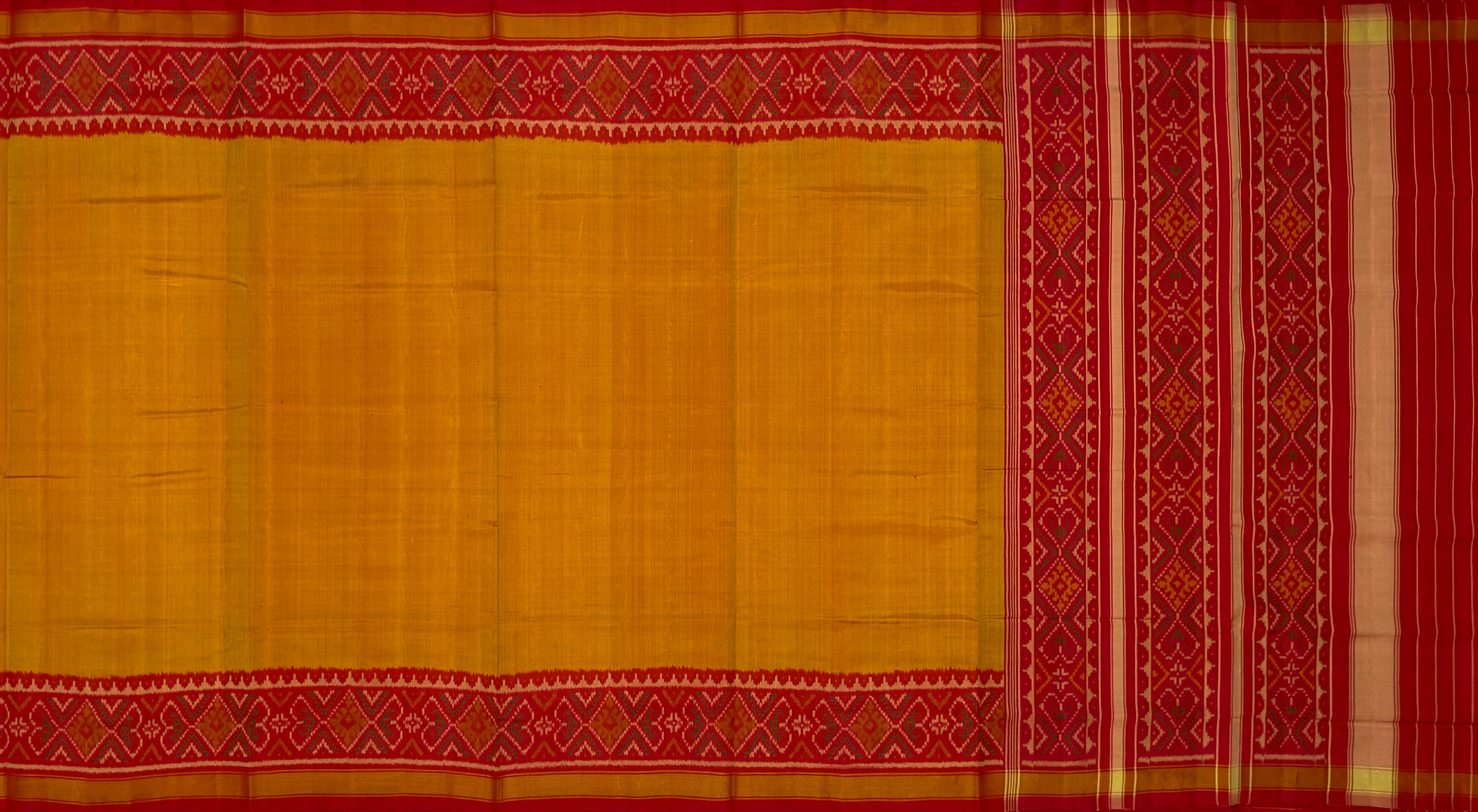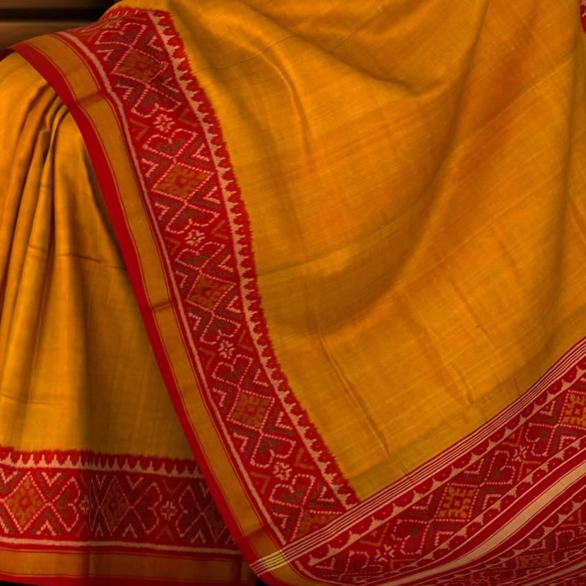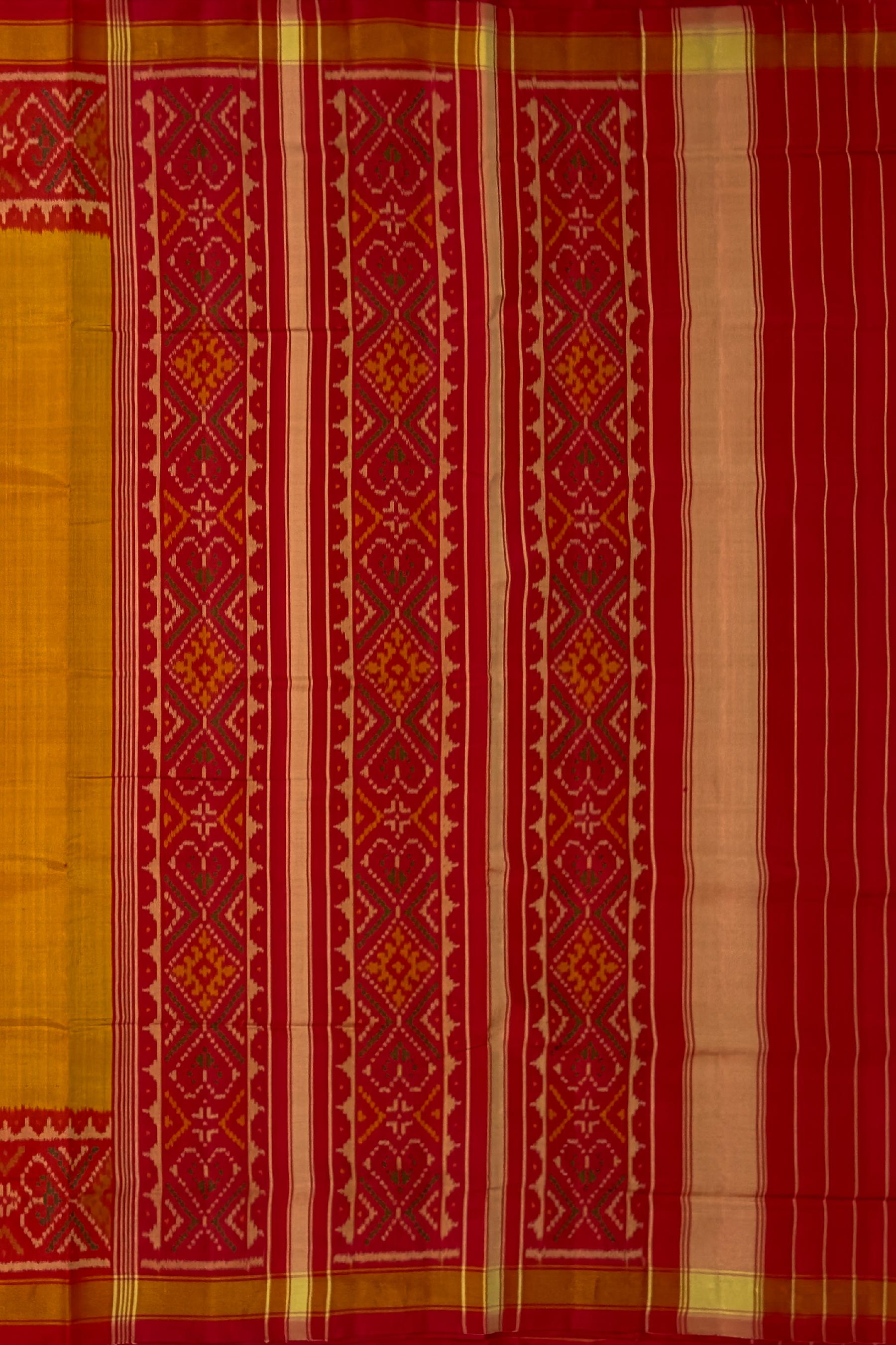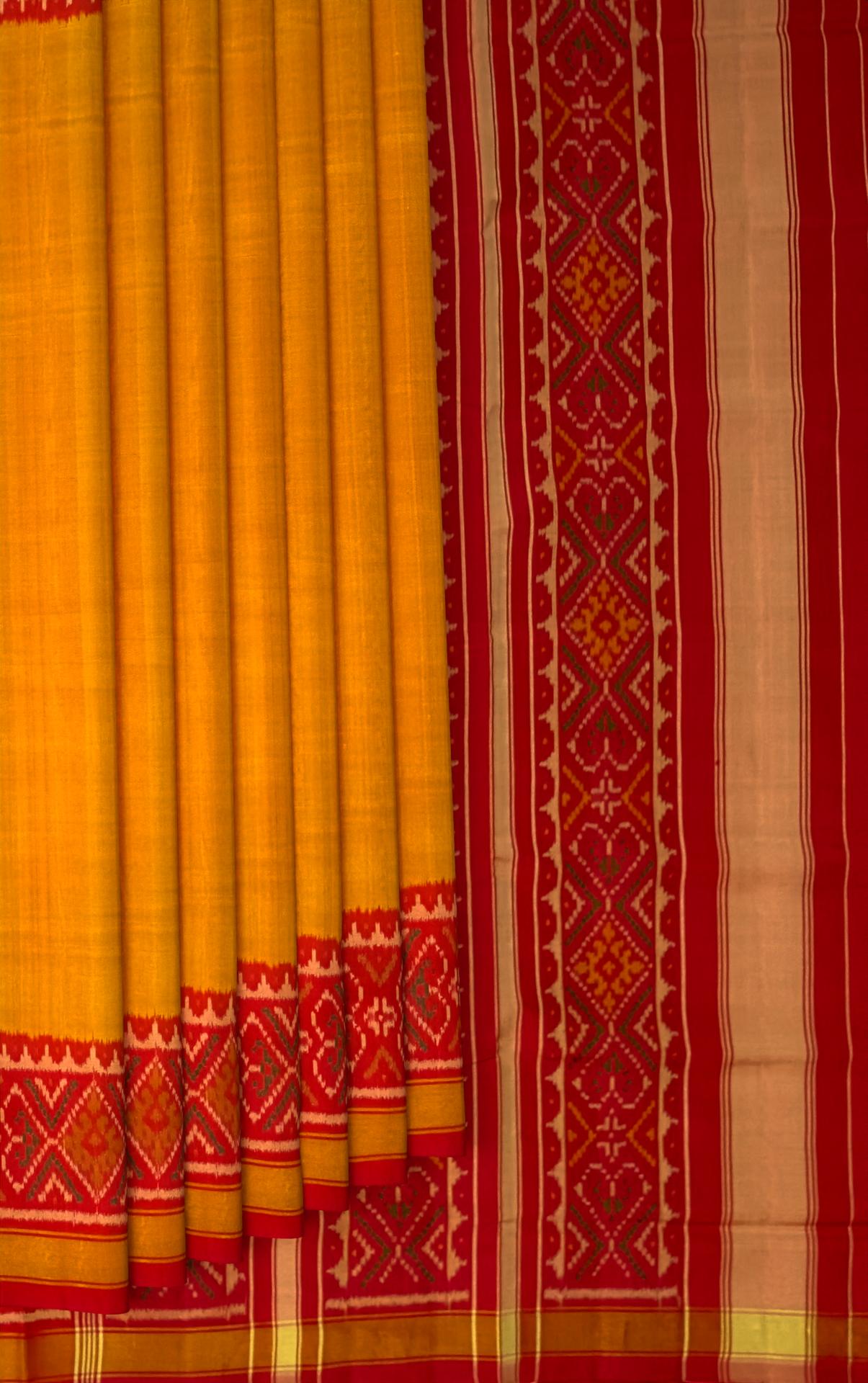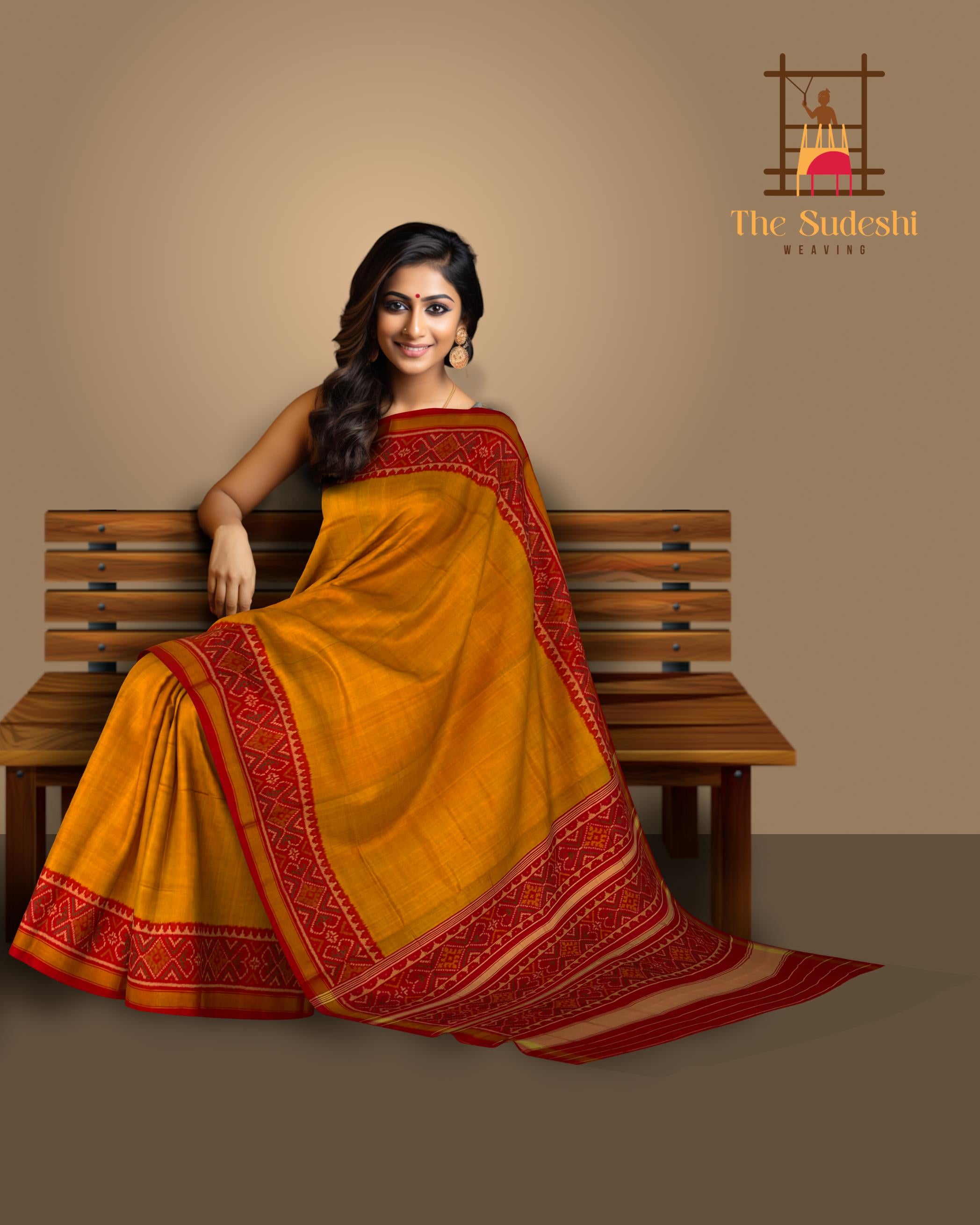 Embrace the vibrant charm of the Red Mustard Galo Patola Saree, a stunning representation of traditional Indian craftsmanship. Utilizing the single ikat technique, this saree features the intricate Galo design, known for its detailed and elaborate patterns. The unique red and mustard combination provides a warm and inviting backdrop for the motifs that extend from the body to the pallu. The semi-lustrous finish adds a touch of sophistication, making it perfect for festive and cultural occasions. This saree is ideal for grand weddings, cultural festivities, and social gatherings. It embodies the rich heritage of Rajkot Patola, making each piece a unique narrative of tradition and pride. Adorn yourself with the Red Mustard Galo Patola Saree, a timeless addition to your wardrobe that celebrates your roots with grace and elegance.