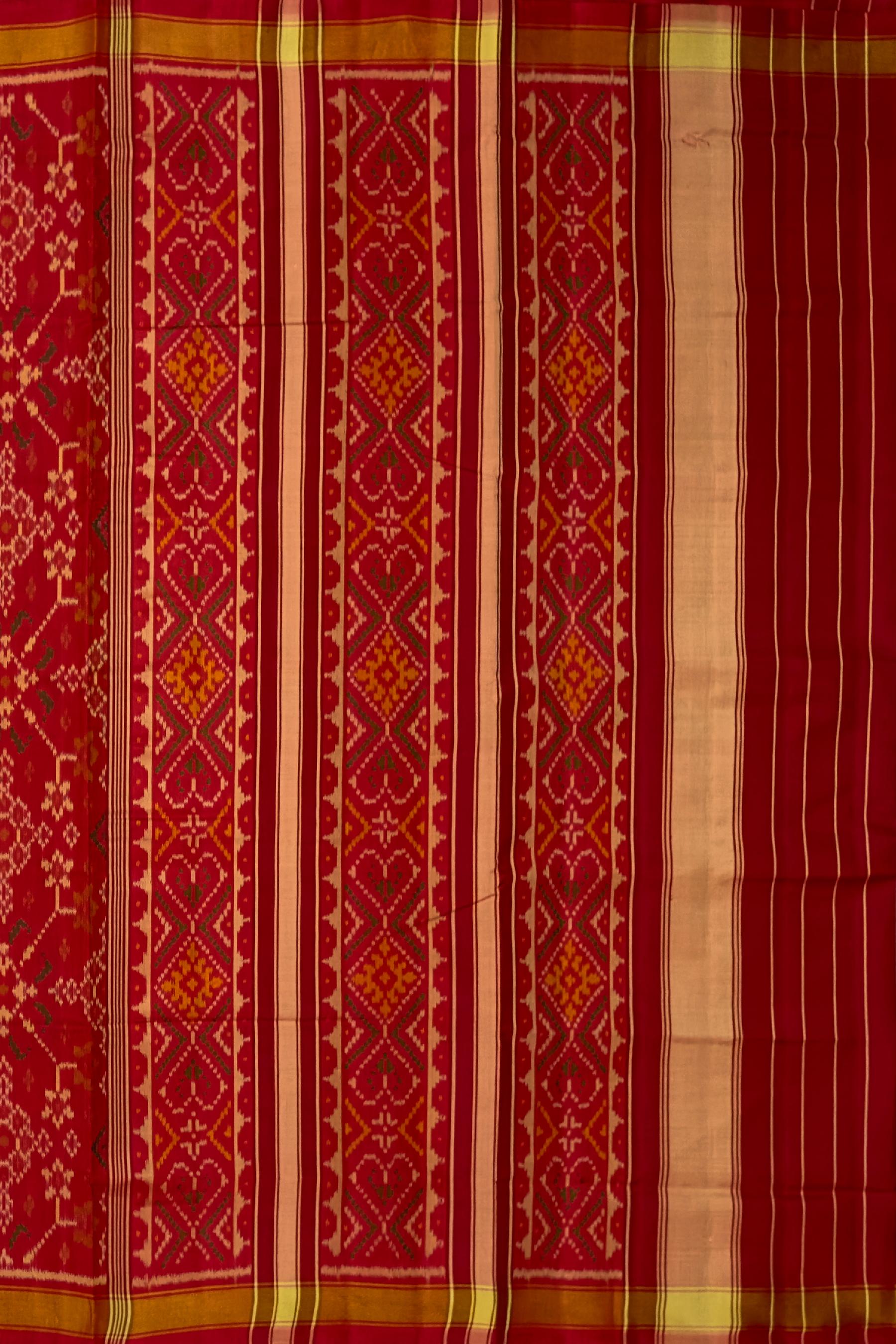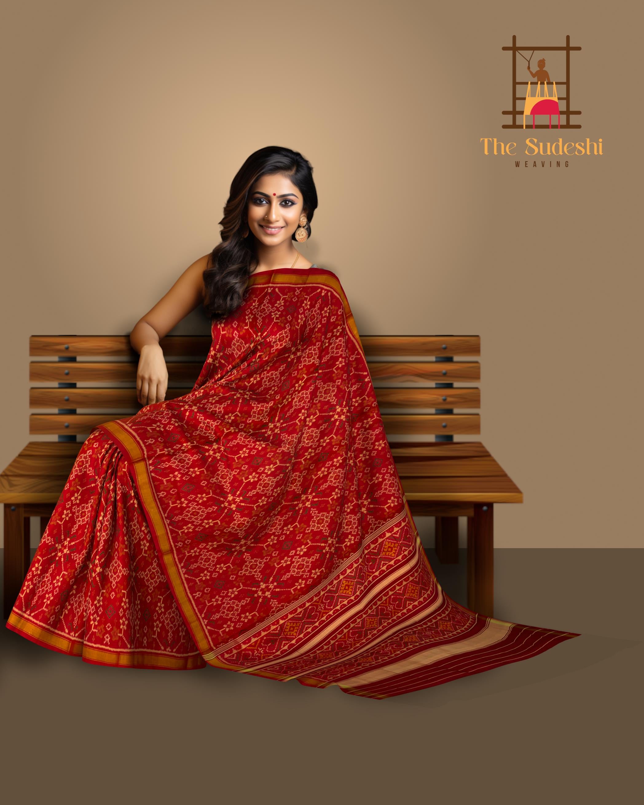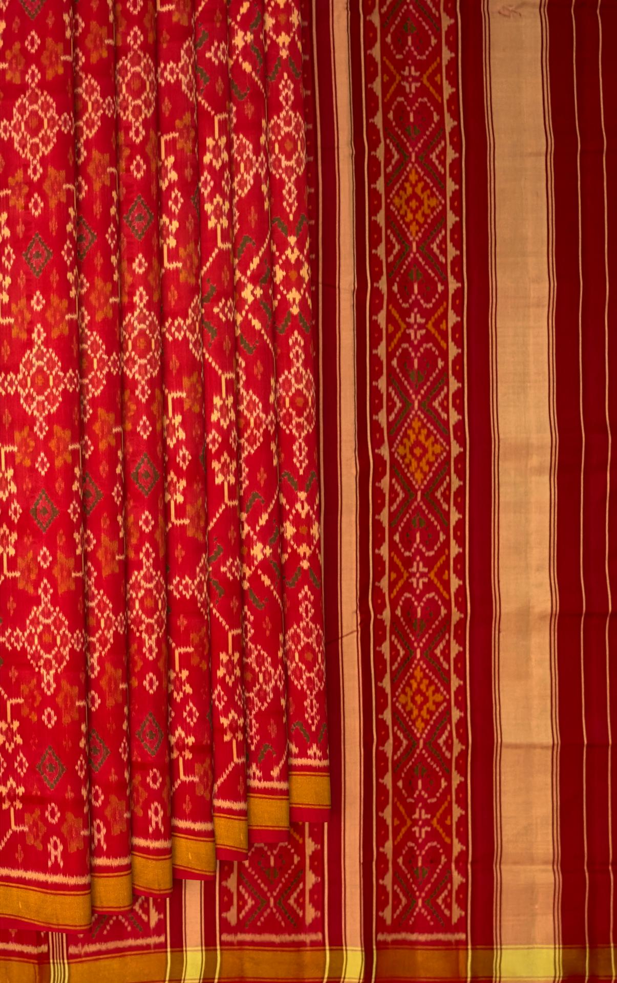 Discover the elegance of the Red Navratna Patola Saree, a stunning representation of Indian heritage. Crafted using the single ikat technique, this saree features the Navratna design, showcasing intricate patterns and luxurious motifs. The deep red color enhances the beauty of the detailed designs that flow from the body to the pallu. The semi-lustrous finish adds a touch of modern elegance, making it a versatile choice for various occasions. Ideal for grand weddings, cultural celebrations, and formal gatherings, this saree is perfect for the modern NRI woman who values her Indian heritage. It represents centuries of artisan tradition, making each piece a unique work of art. Celebrate your heritage with the Red Navratna Patola Saree, a timeless addition to your wardrobe that exudes tradition and elegance.