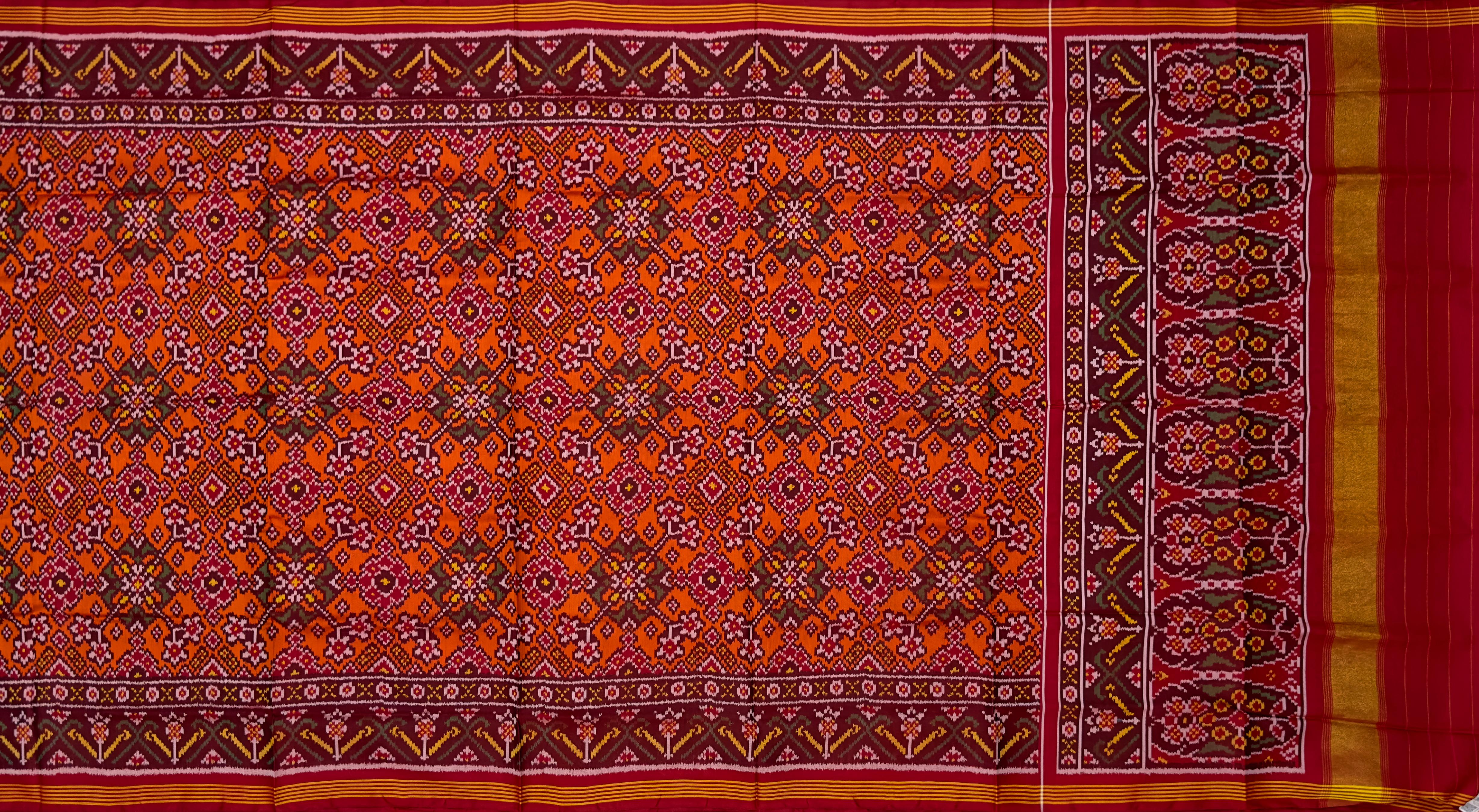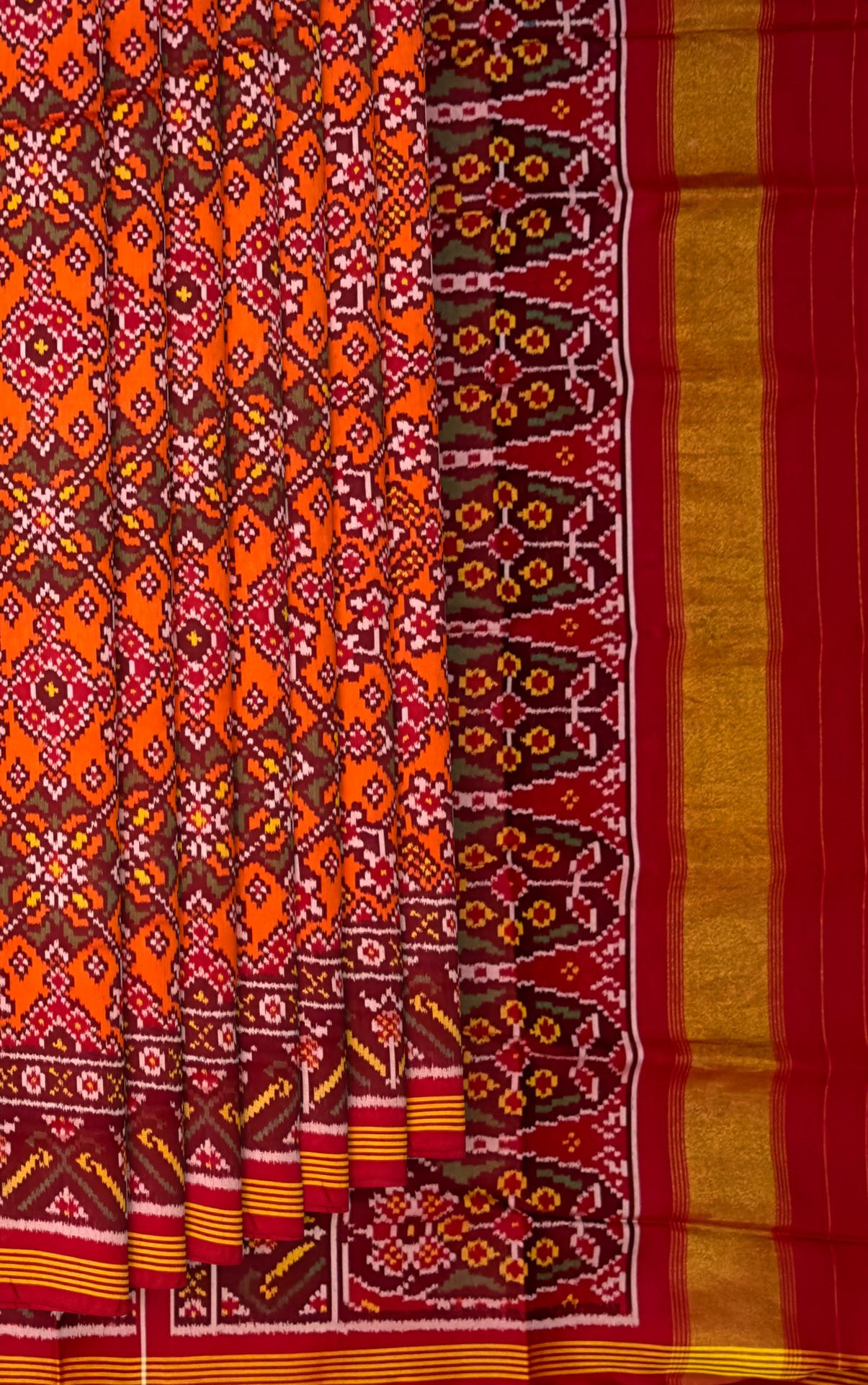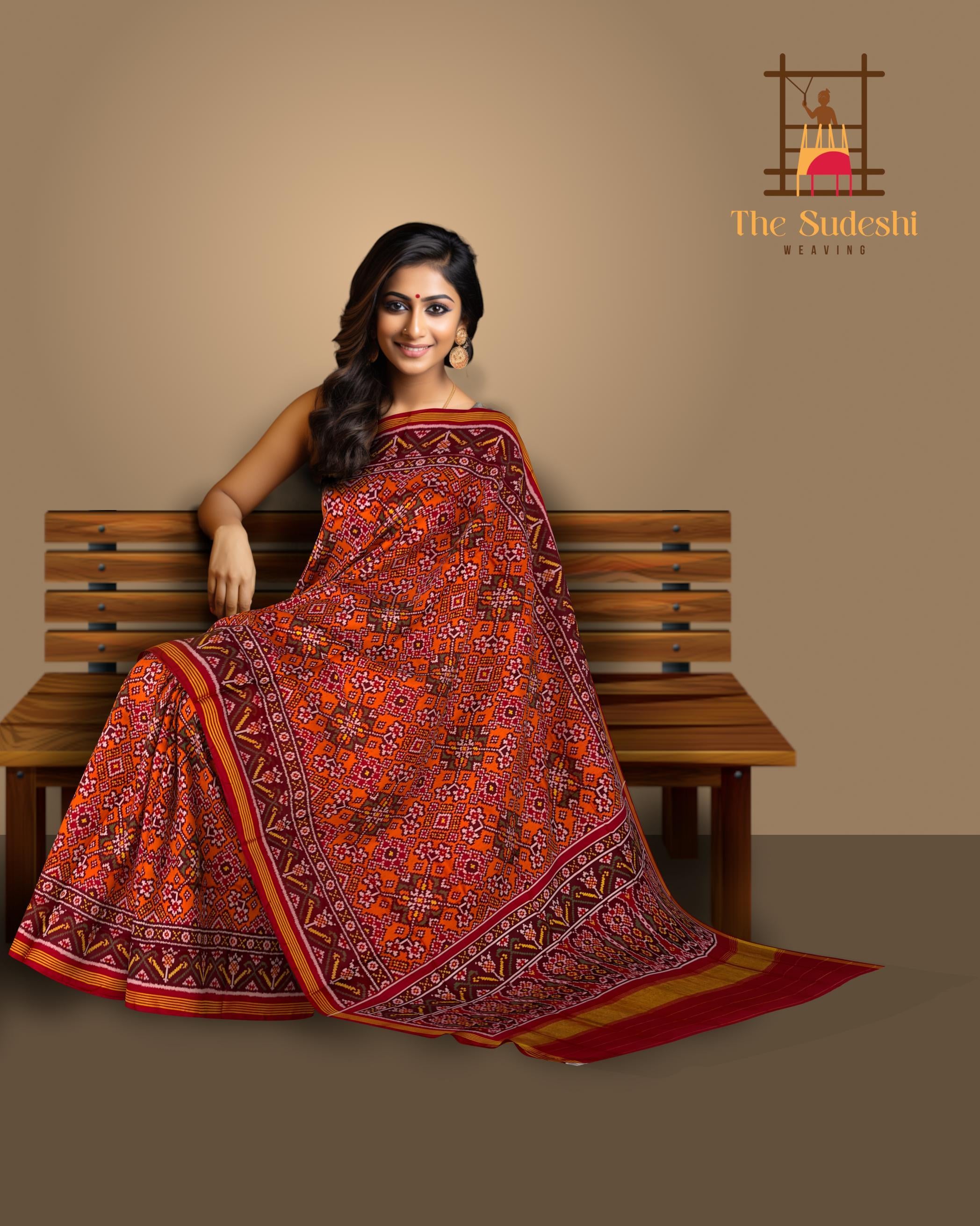 Embrace the luxurious Red Orange Tal Navratna Semi Patan Saree, ideal for prestigious events where making a regal impression is essential. Its vibrant orange and coffee maroon tones reflect a deep cultural heritage.