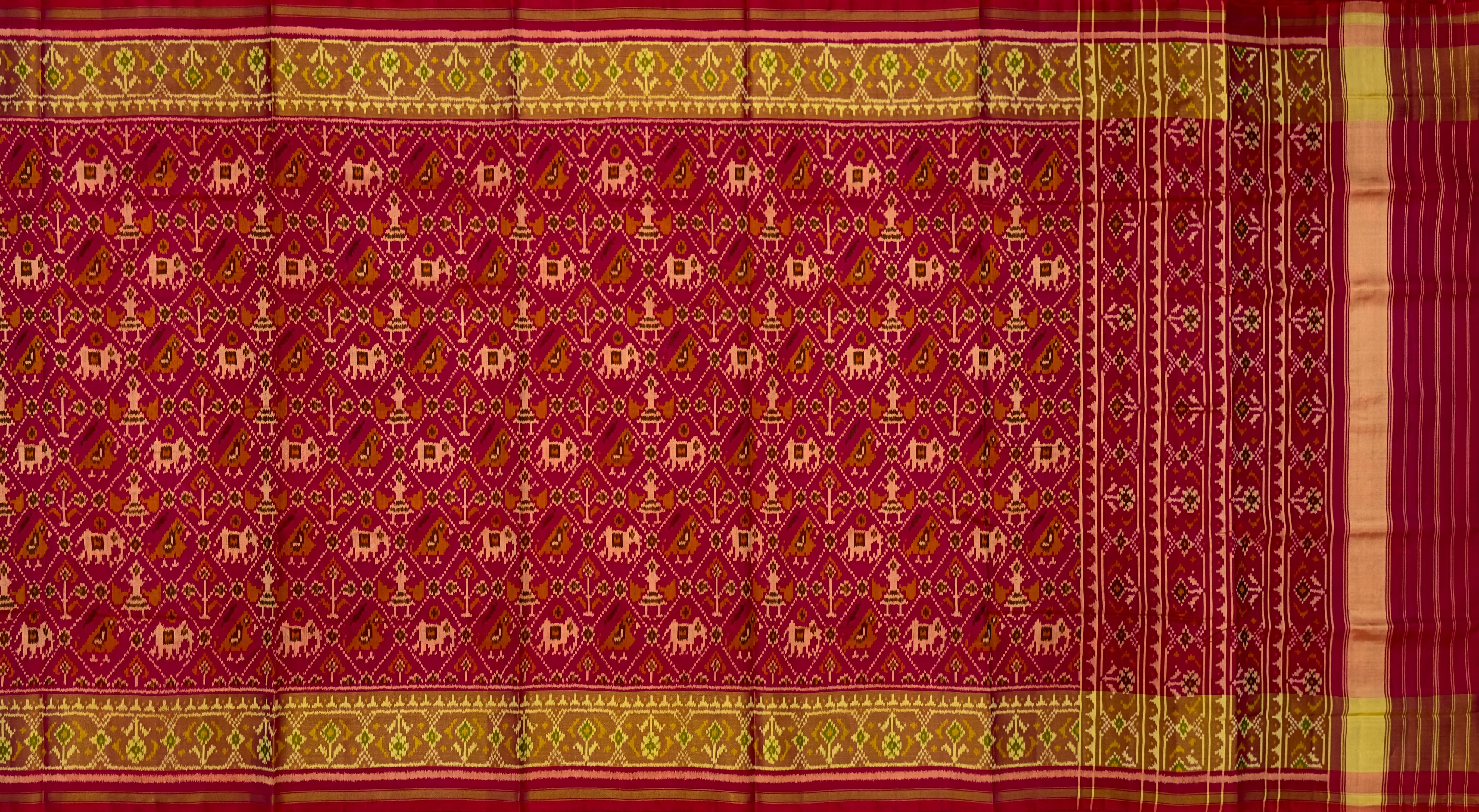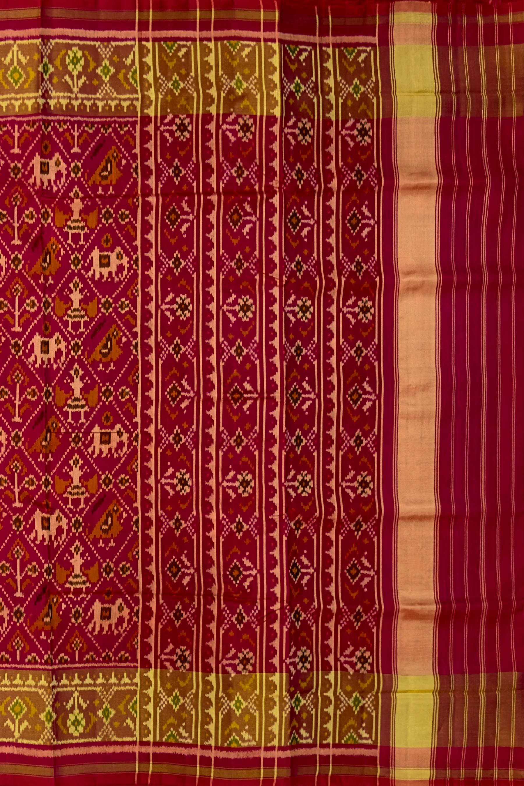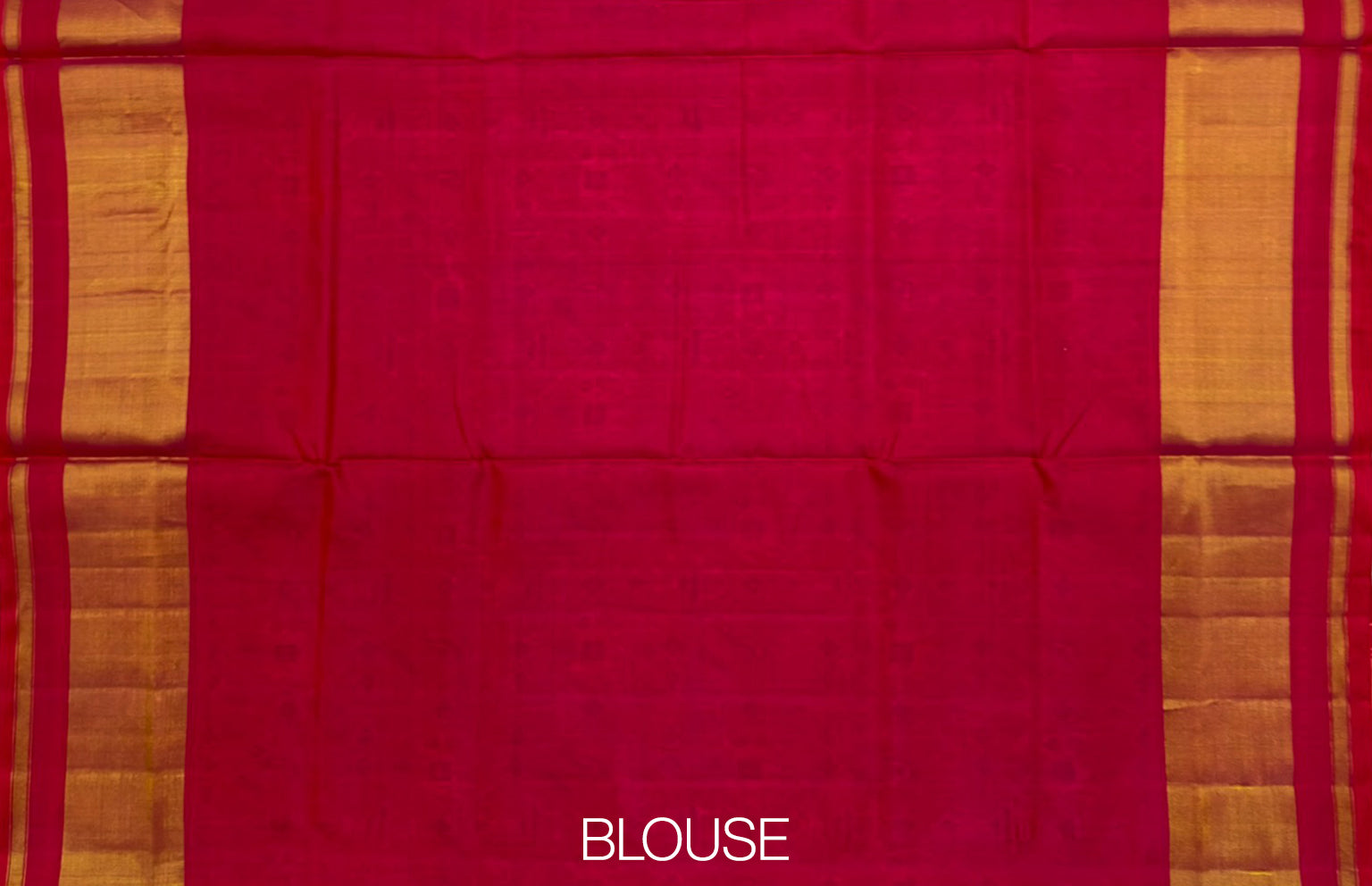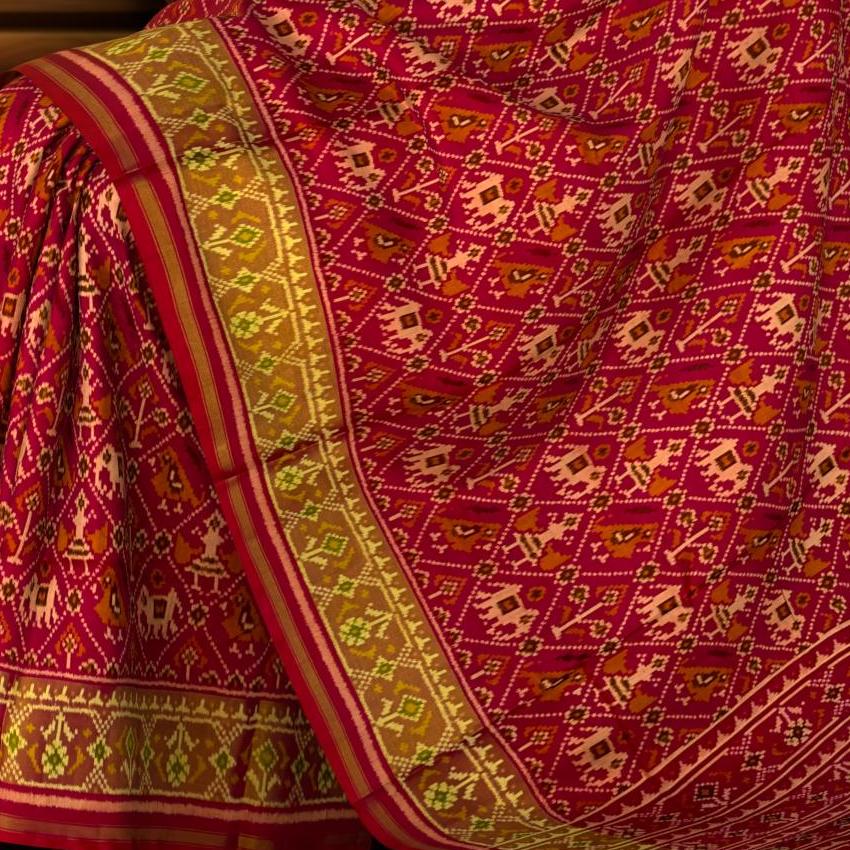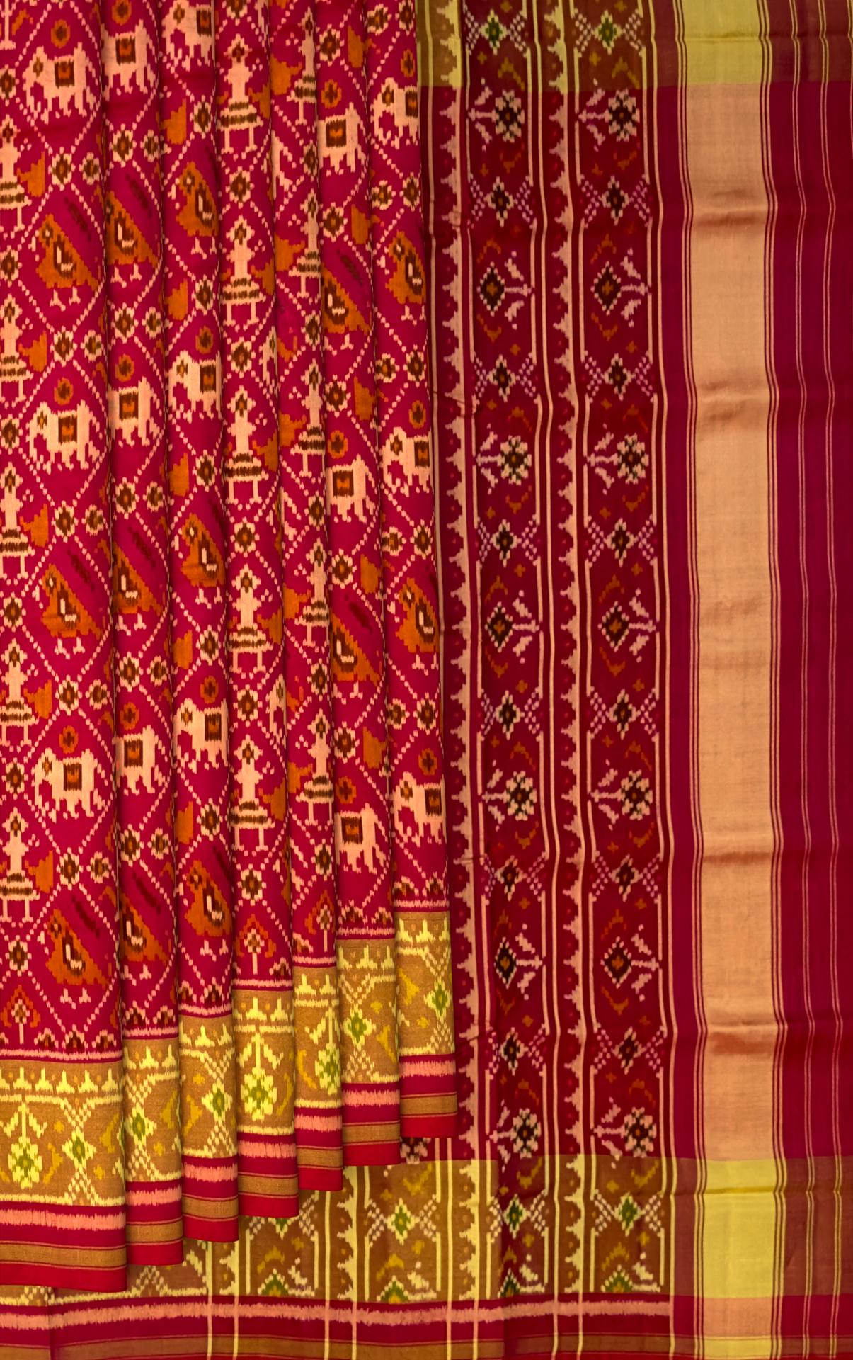 Embrace the vibrant elegance of the Red Pink Nari Kunjar Patola Saree, a stunning representation of traditional Indian craftsmanship. Utilizing the single ikat technique, this saree features the intricate Nari Kunjar design, known for its detailed and elaborate patterns. The unique red-pink two-tone effect provides a striking backdrop for the motifs that extend from the body to the pallu. The semi-lustrous finish adds a touch of sophistication, making it perfect for festive and cultural occasions. This saree is ideal for grand weddings, cultural festivities, and social gatherings. It embodies the rich heritage of Rajkot Patola, making each piece a unique narrative of tradition and pride. Adorn yourself with the Red Pink Nari Kunjar Patola Saree, a timeless addition to your wardrobe that celebrates your roots with grace and elegance.
