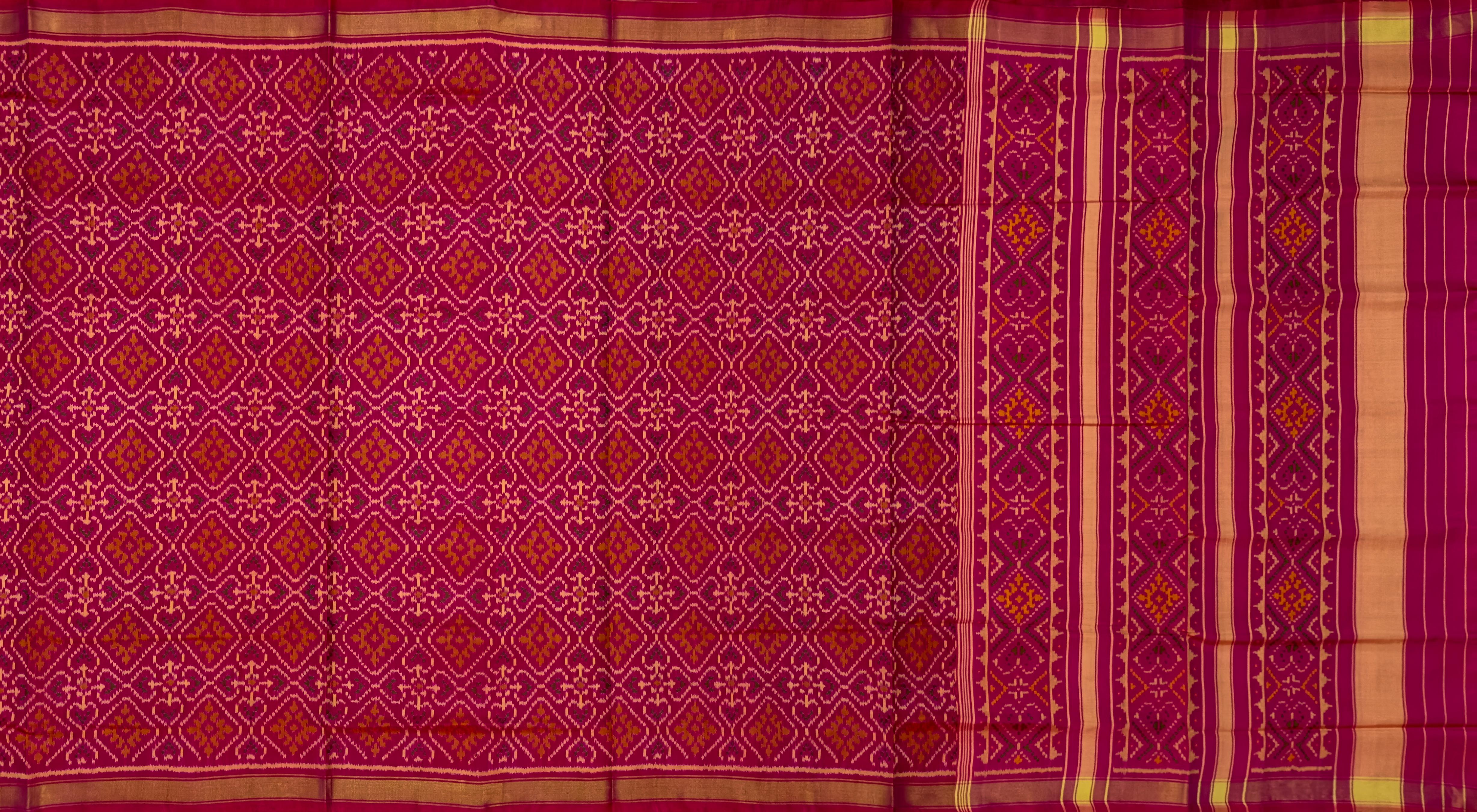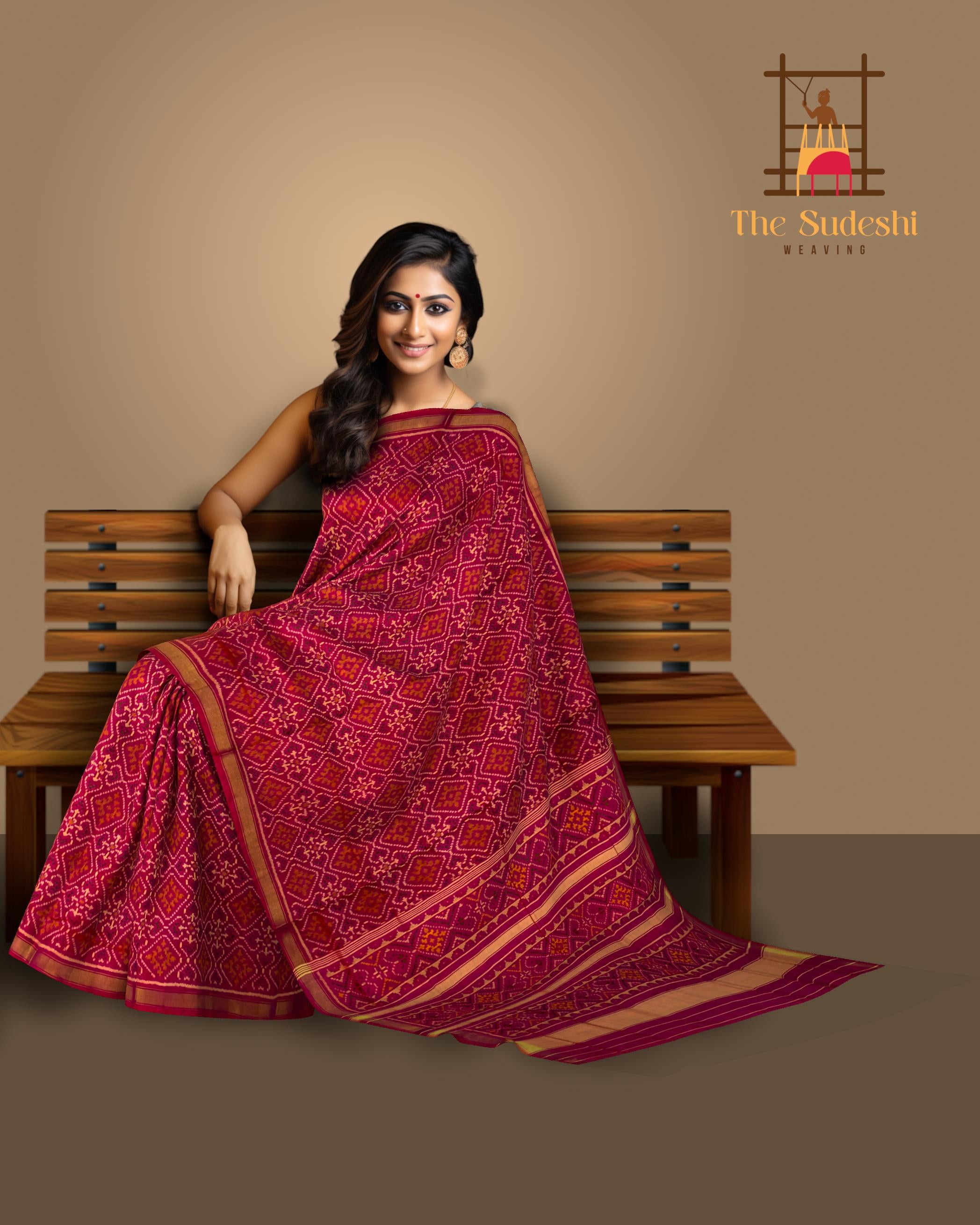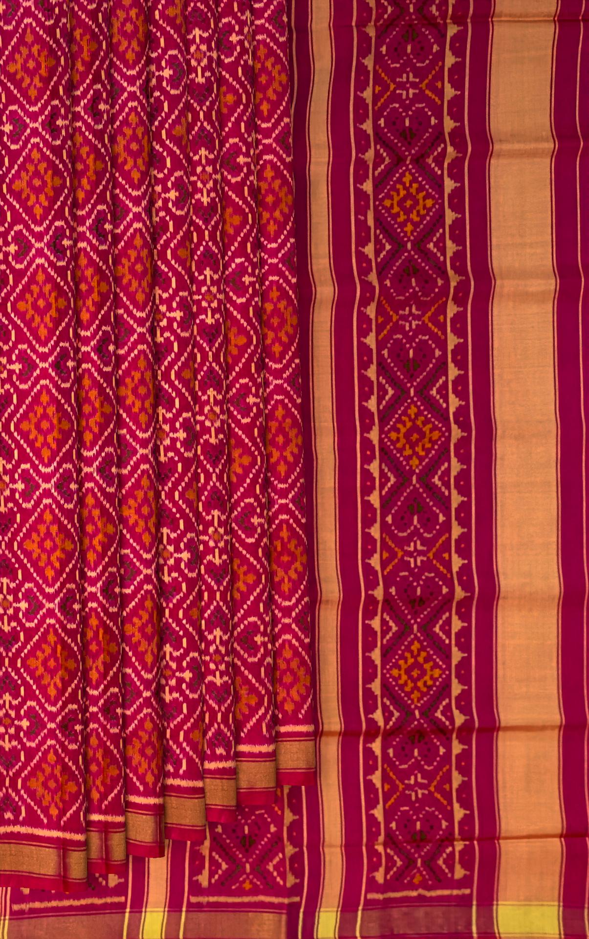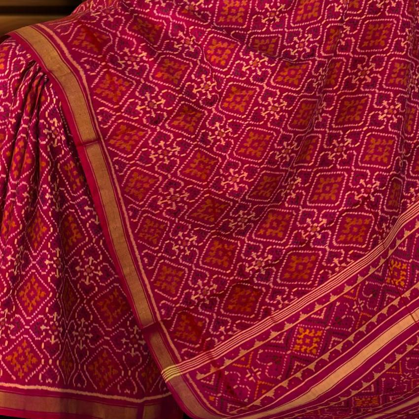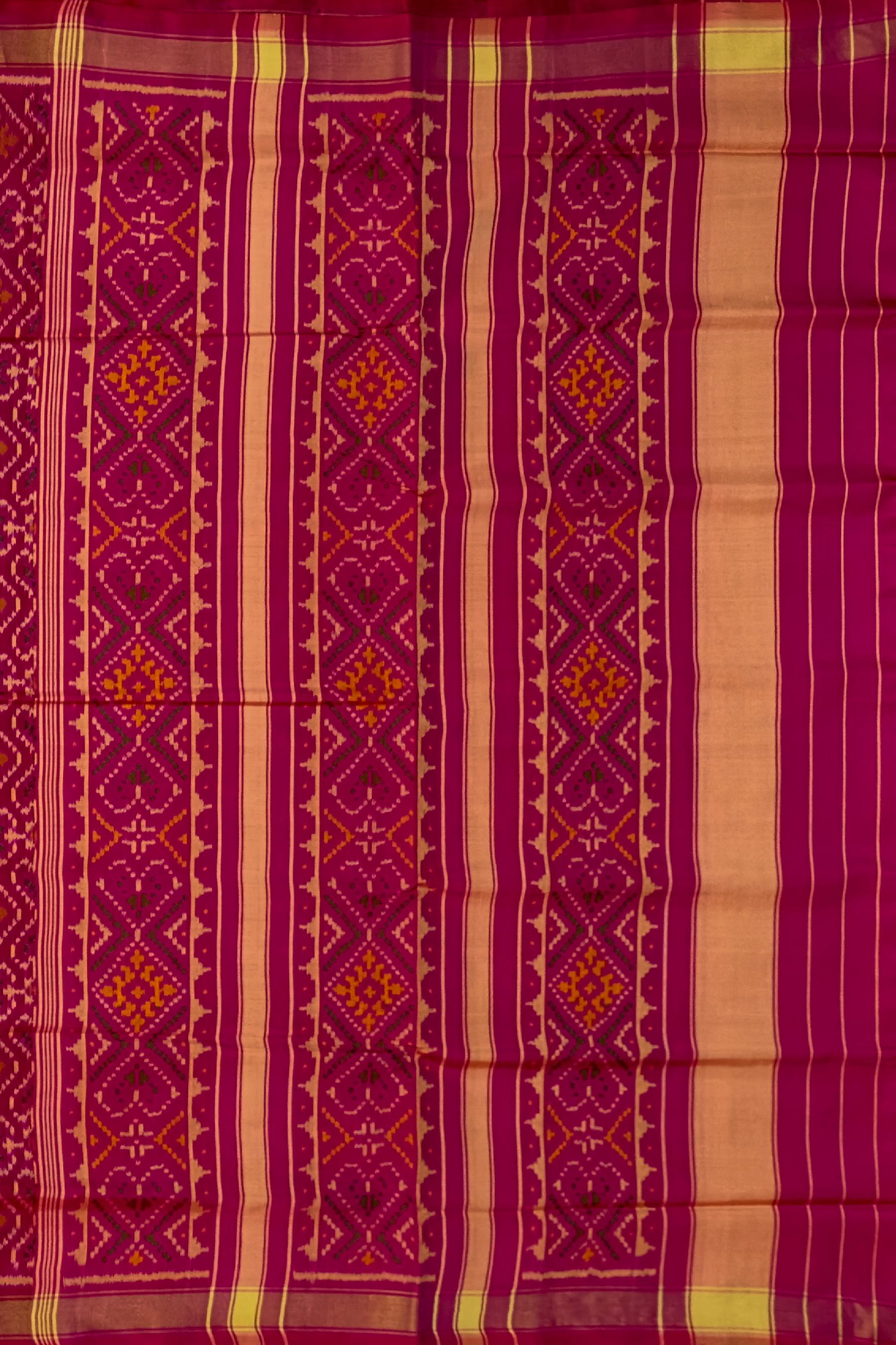 Embrace the timeless elegance of the Red Pink Pan Chanda Patola Saree, a stunning representation of traditional Indian craftsmanship. Utilizing the single ikat technique, this saree features the intricate Pan Chanda design, known for its detailed and elaborate patterns. The unique red and pink combination provides a striking backdrop for the motifs that extend from the body to the pallu. The semi-lustrous finish adds a touch of sophistication, making it perfect for festive and cultural occasions. This saree is ideal for grand weddings, cultural festivities, and social gatherings. It embodies the rich heritage of Rajkot Patola, making each piece a unique narrative of tradition and pride. Adorn yourself with the Red Pink Pan Chanda Patola Saree, a timeless addition to your wardrobe that celebrates your roots with grace and elegance.