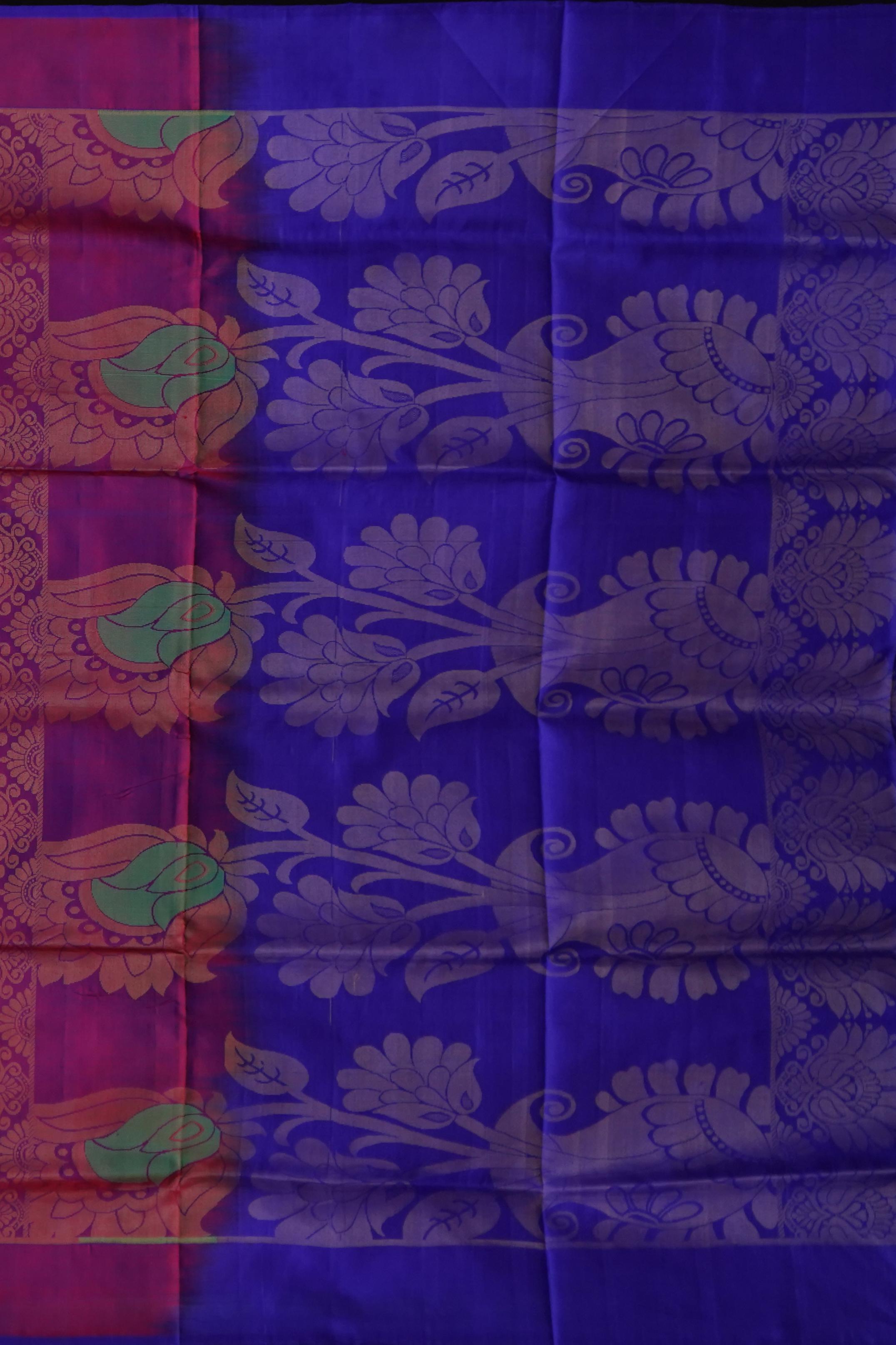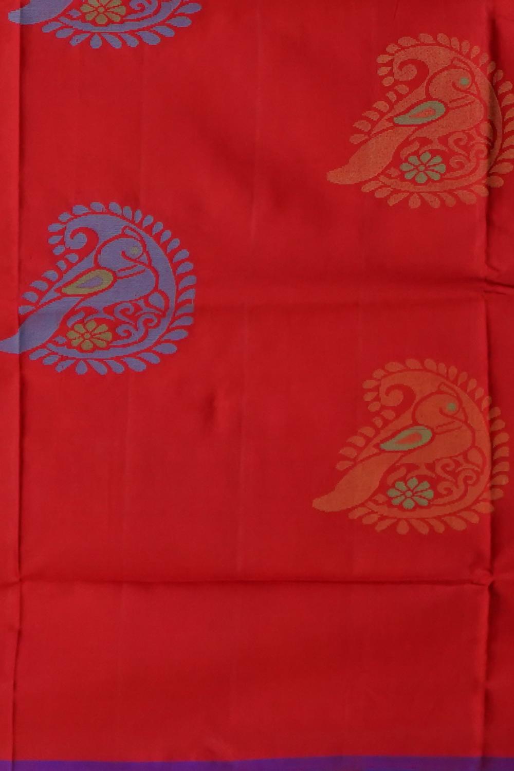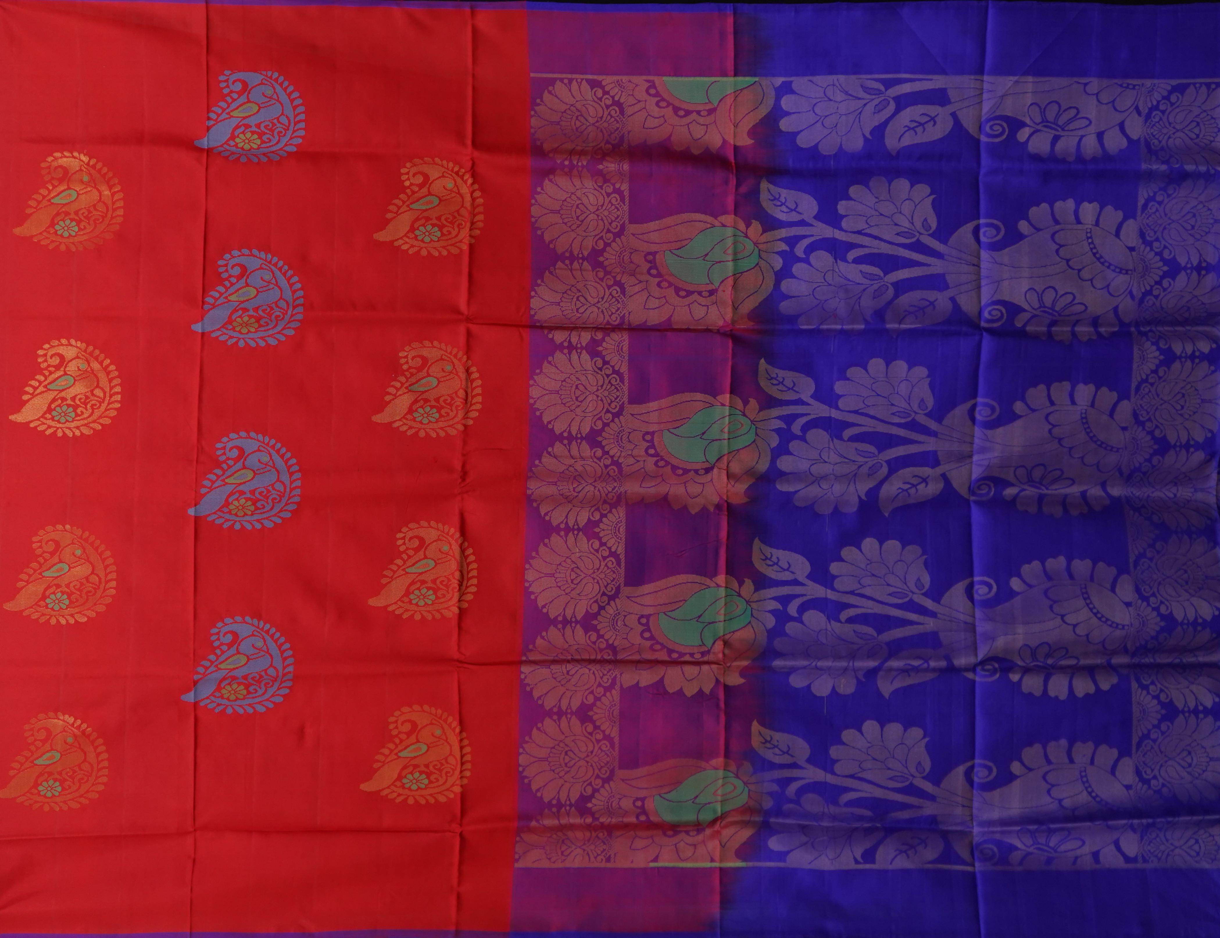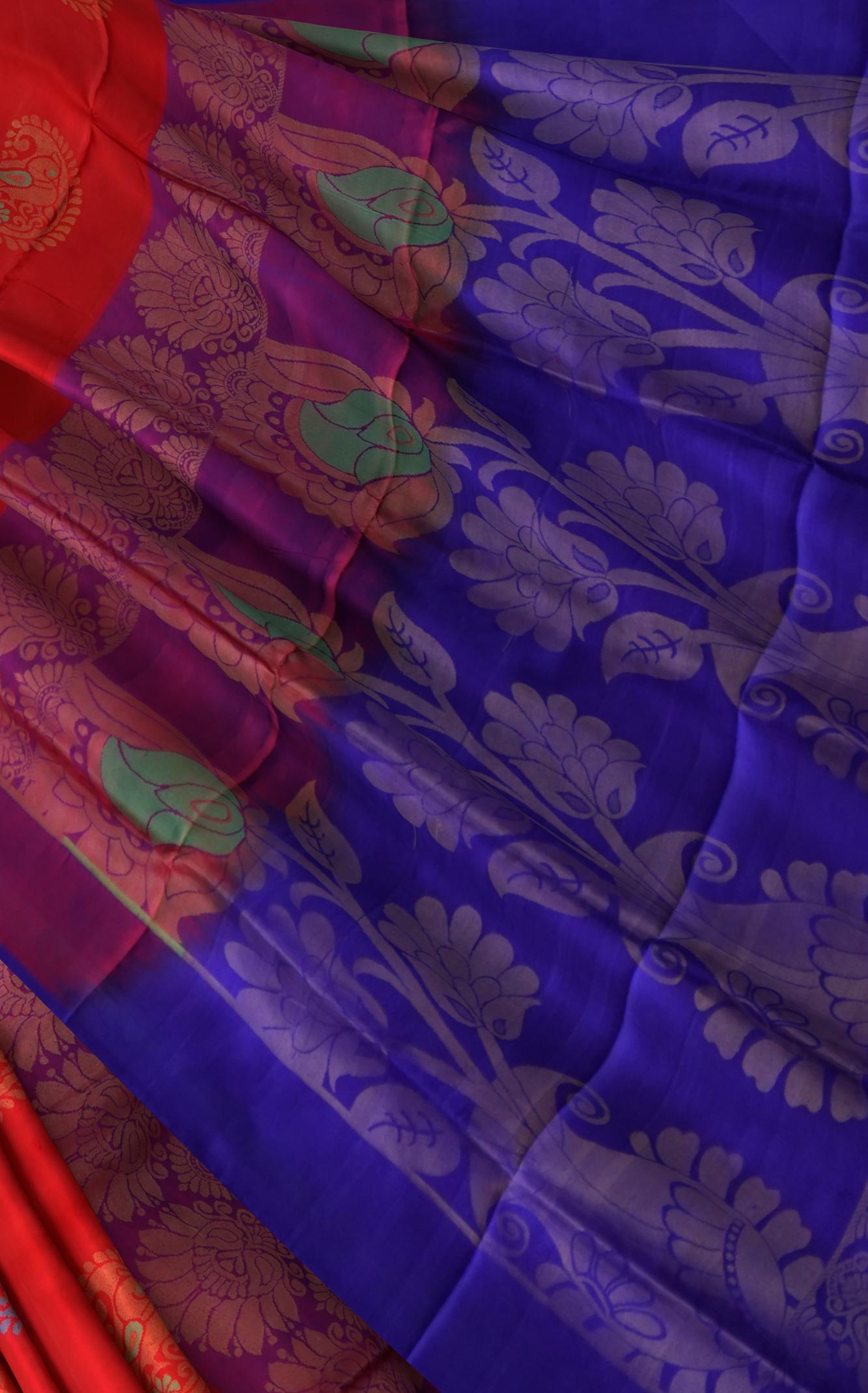 A striking Red Uppada Saree with a contrasting blue pallu, this saree is a perfect embodiment of traditional elegance. The intricate gold and blue buttas add depth and character to the fabric, while the red body creates a bold, beautiful statement. The unique color combination of red and blue represents strength and tranquility.