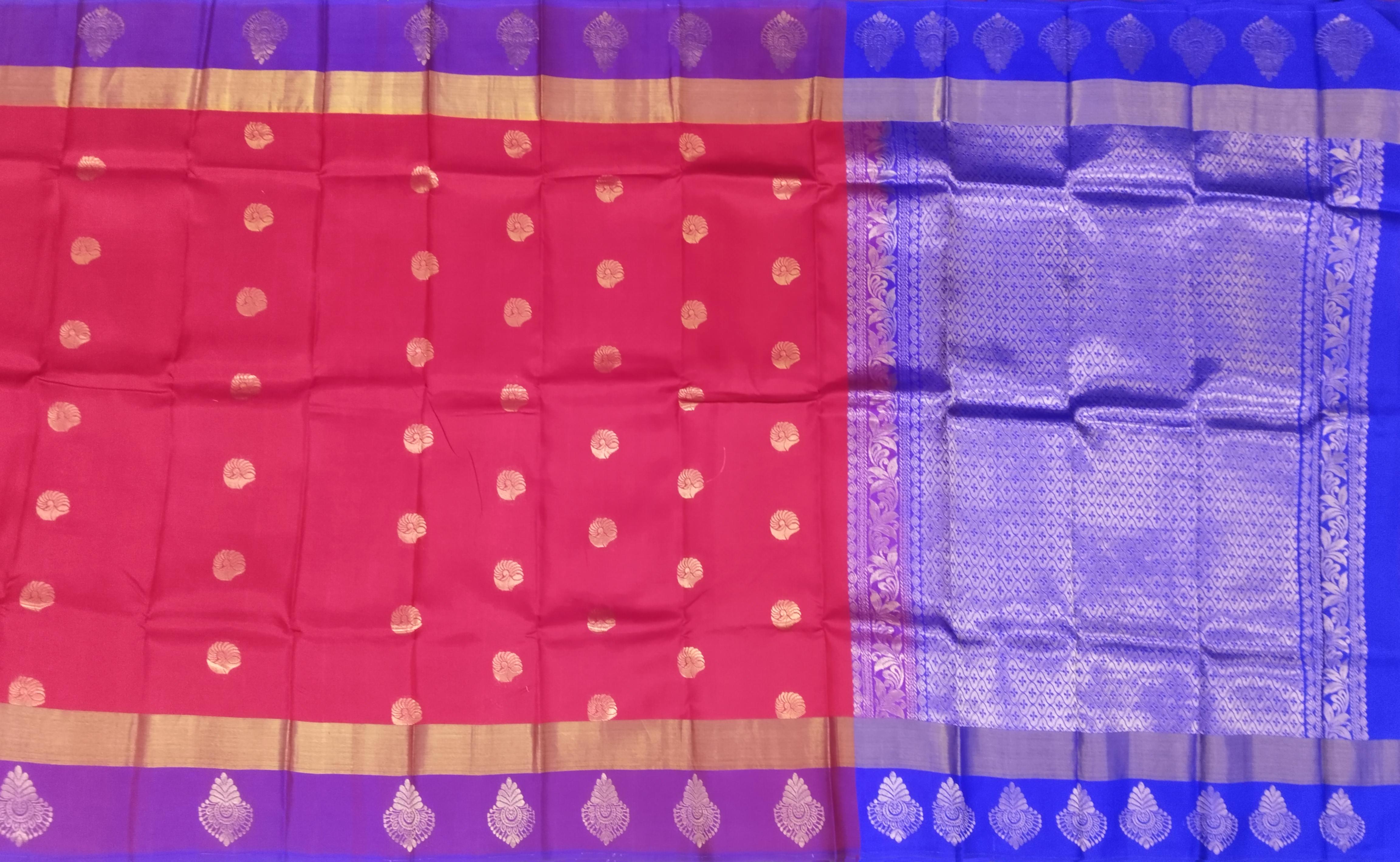 A masterpiece of vibrant artistry, this Red Kanchipuram Silk Saree adorned with Butta motifs exudes festive grandeur. The Purple and Blue borders and pallu add a striking dual-tone richness that elevates the saree’s royal appeal. The luminous zari work across the body celebrates the spirit of South Indian tradition — a perfect harmony of strength, femininity, and devotion. Each Kanchipuram Pure Silk Saree is woven from fine mulberry silk, symbolizing purity and resilience. The motifs reflect ancient temple patterns and nature-inspired symbols that have adorned Kanchi looms for generations. Known for their luster and longevity, these sarees are treasured heirlooms representing the finest of Indian artistry. Ideal for weddings, celebrations, and evening events, this saree pairs beautifully with a blue or purple blouse and traditional gold jewelry. Complete the look with a statement necklace and sleek bun for a truly regal aura. Note: The appearance of the product’s colors may vary due to lighting conditions or your device’s screen calibration. For further assistance or additional images/videos, feel free to contact us at +91 97897 60367 or email at wecare@thesudeshiweaving.com.