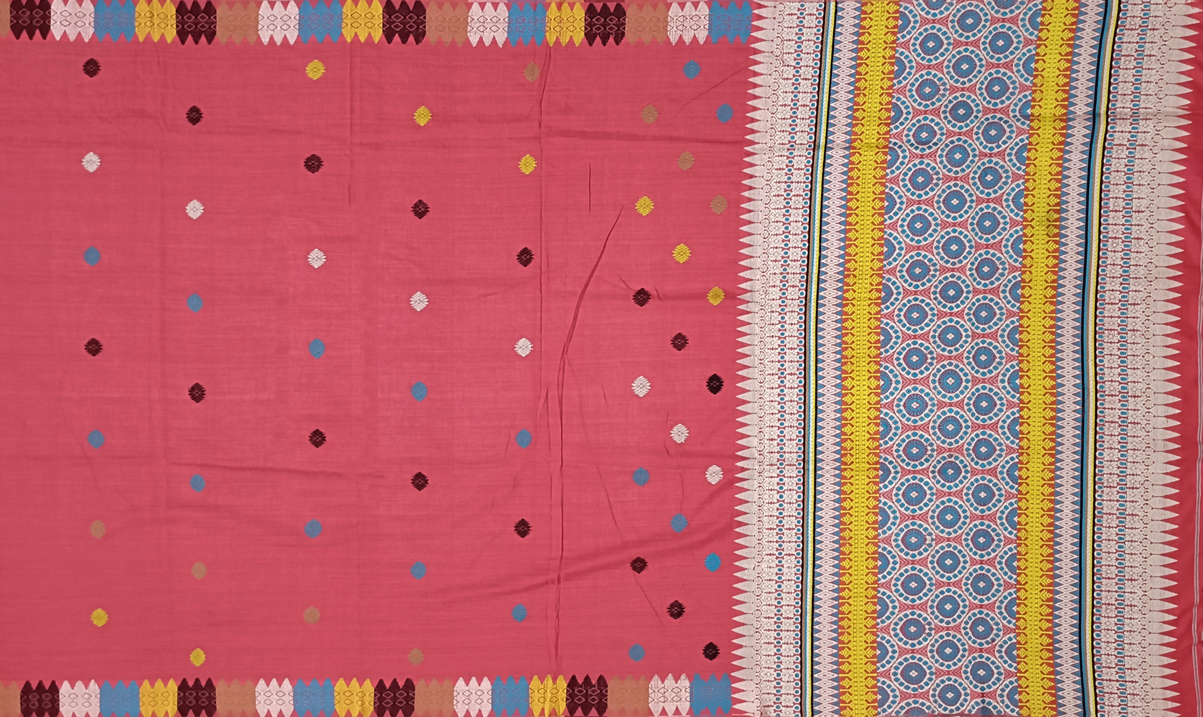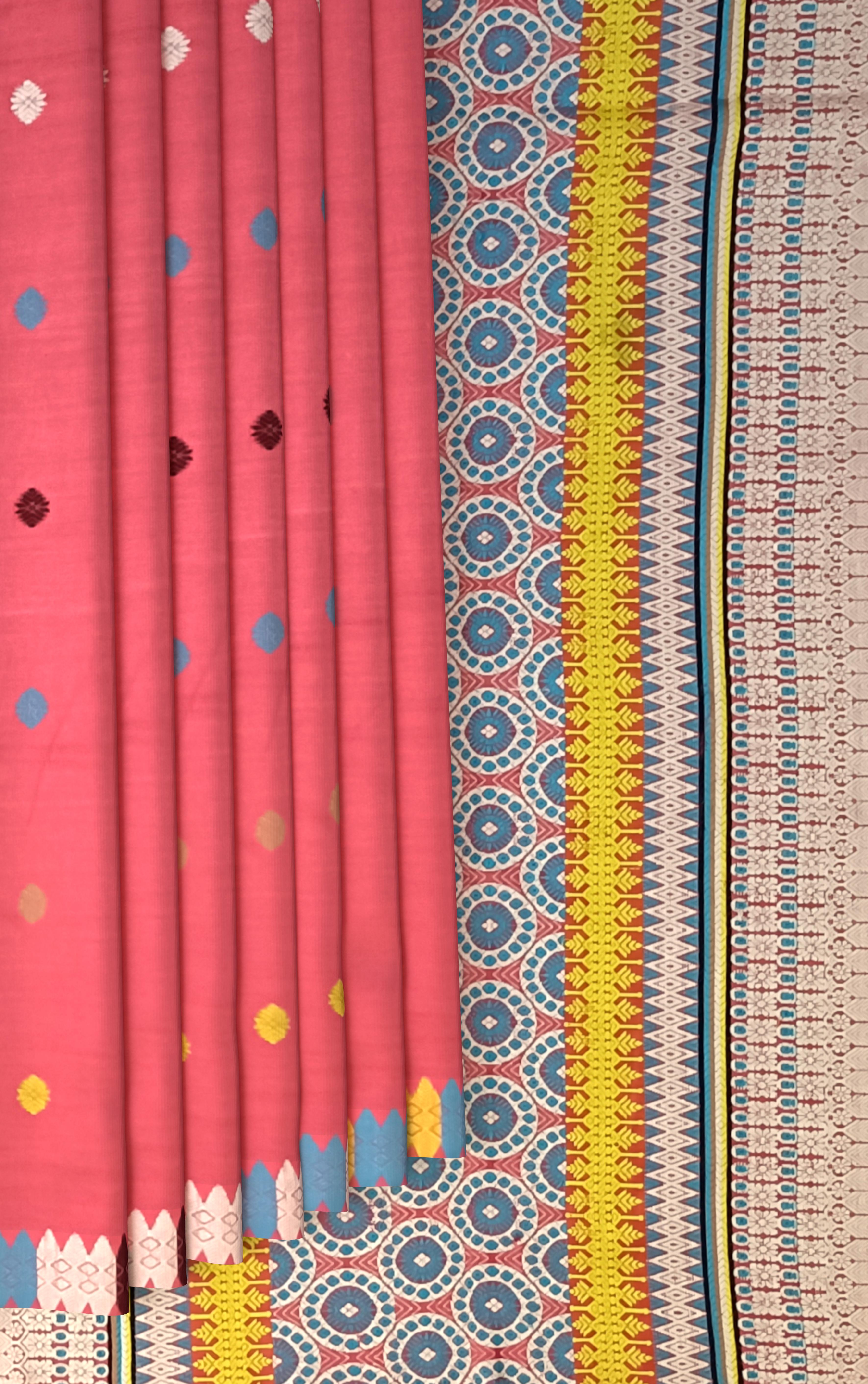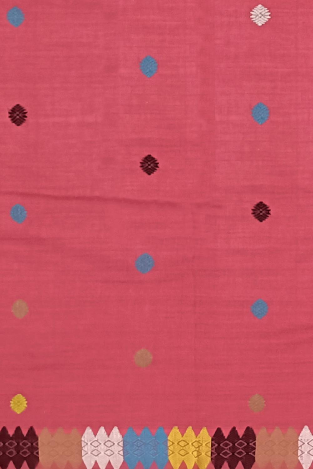 Radiate charm with this reddish pink Eri saree from Assam, a delightful combination of vibrant colors and traditional artistry. The saree’s body features delicate buttis and motifs, while the multicolor border and pallu add a festive and lively vibe. This saree is a true celebration of Assamese weaving excellence.