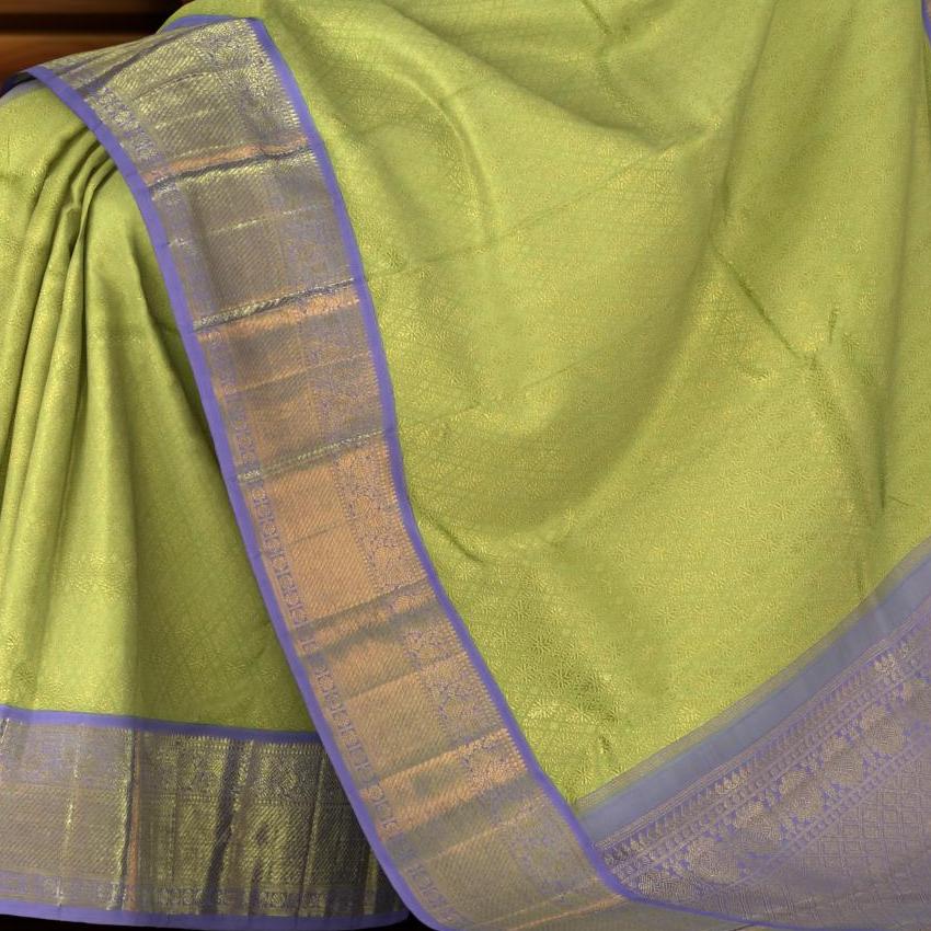 Celebrate nature's lively dance with this refreshing Kanchipuram silk saree. The vibrant lime green, contrasted by gentle lavender, mirrors the earth's vibrant tapestry. This saree is a canvas of India's rich weaving legacy and a tribute to our age-old love for colors.