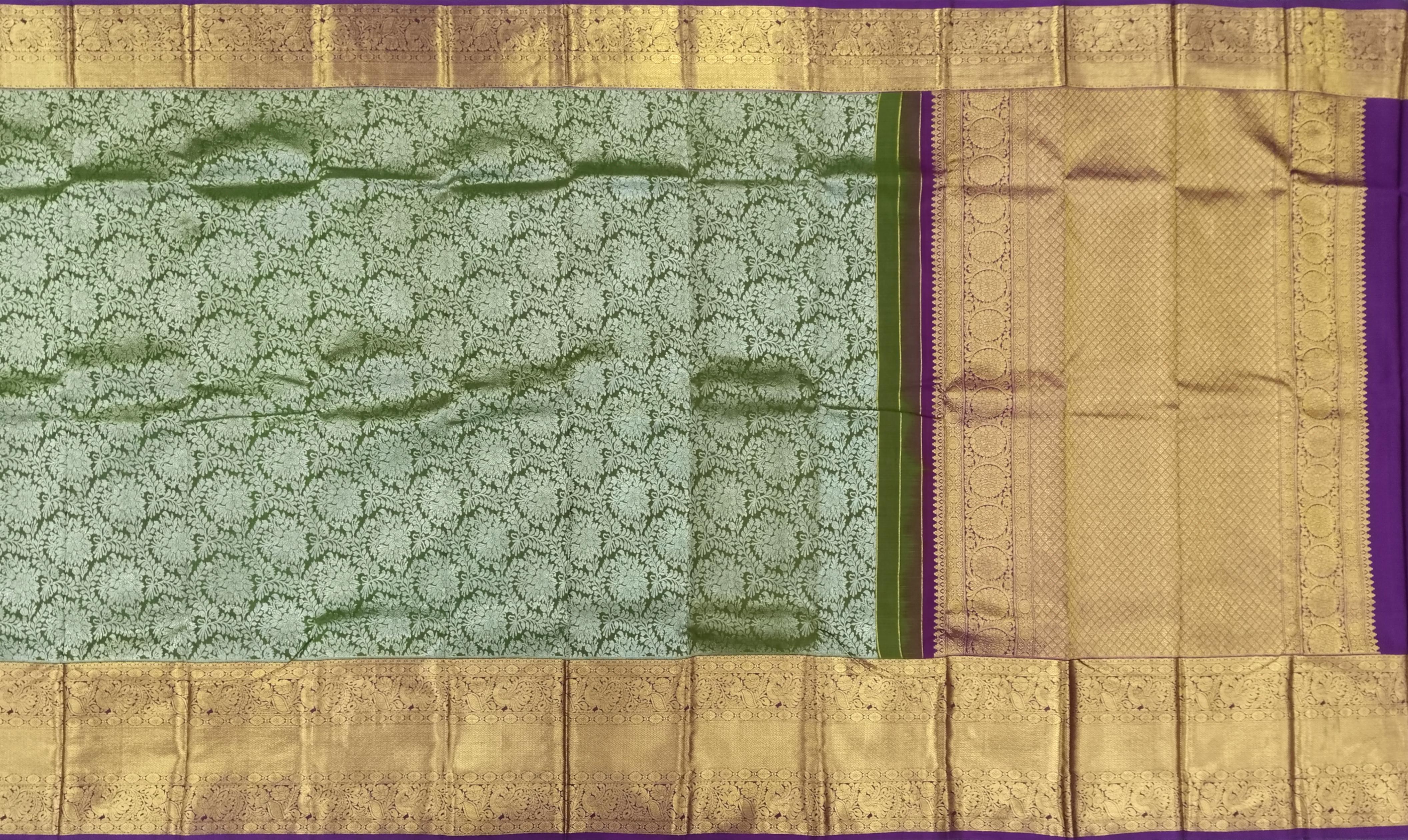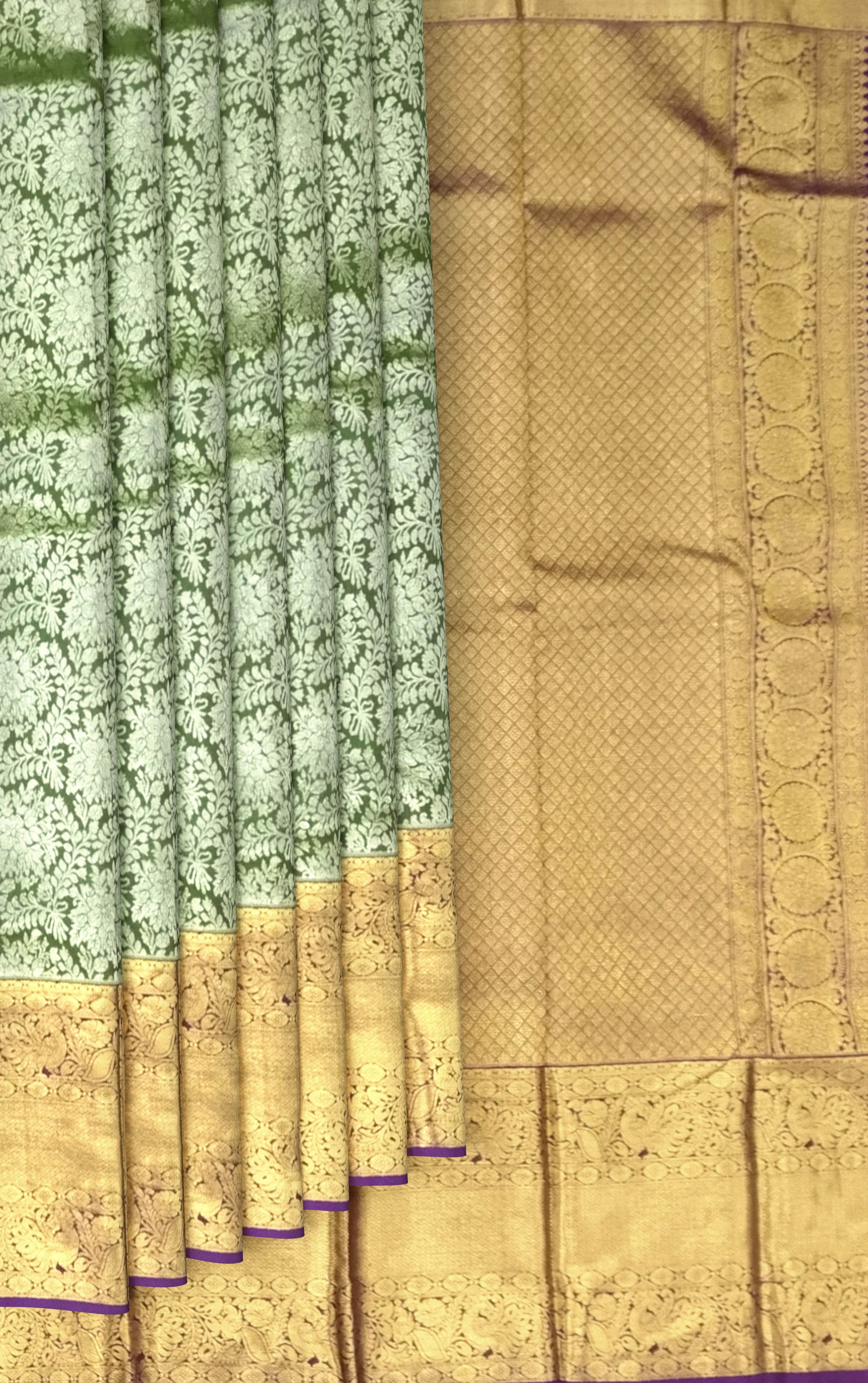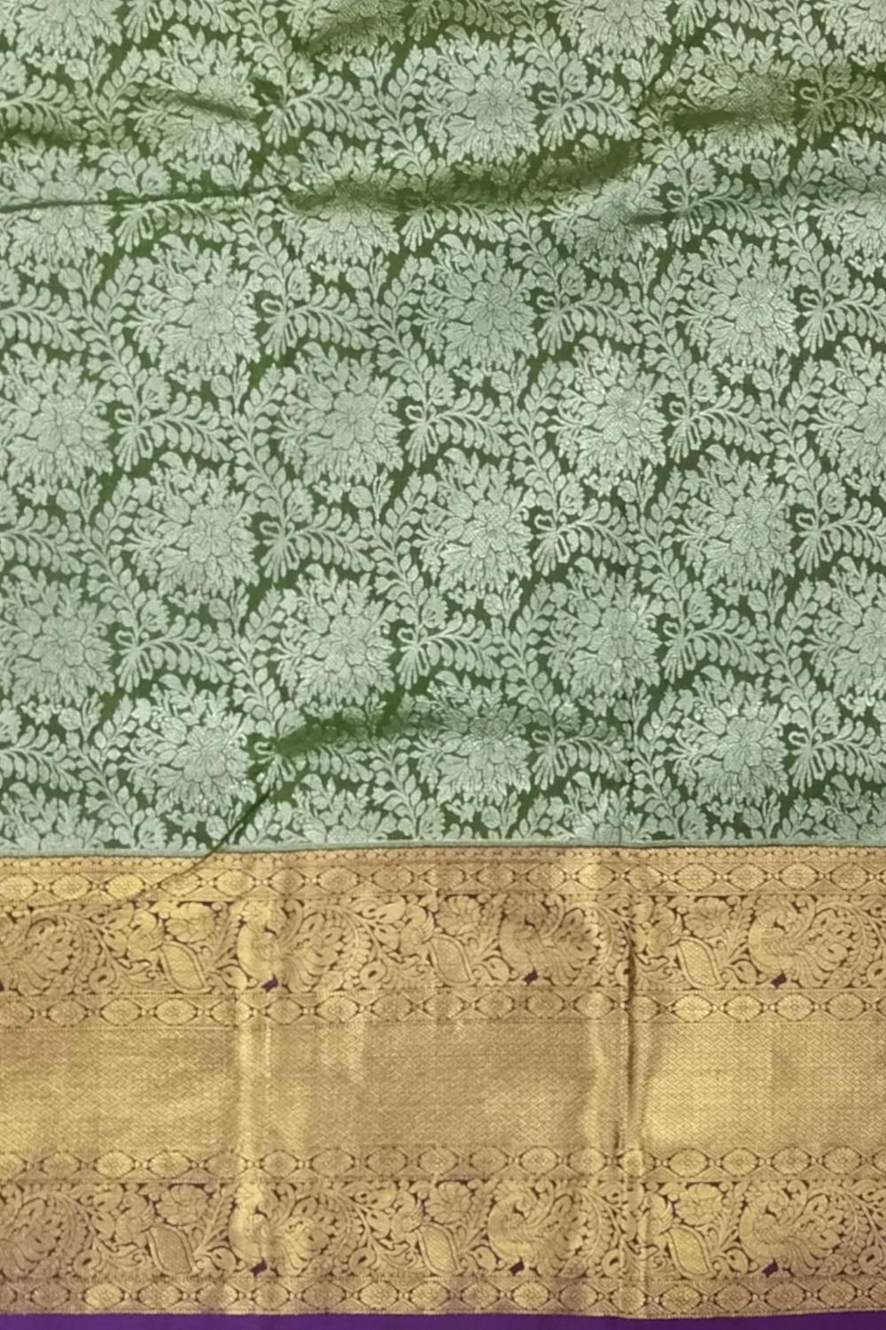 Radiate timeless beauty in this olive green Kanchipuram silk saree, exquisitely woven with floral jacquard motifs. The rich purple pallu and blouse provide a striking contrast, making this saree a regal addition to any collection. The floral motifs lend an air of delicacy and grace, inspired by the lush flora found in South Indian temple architecture.