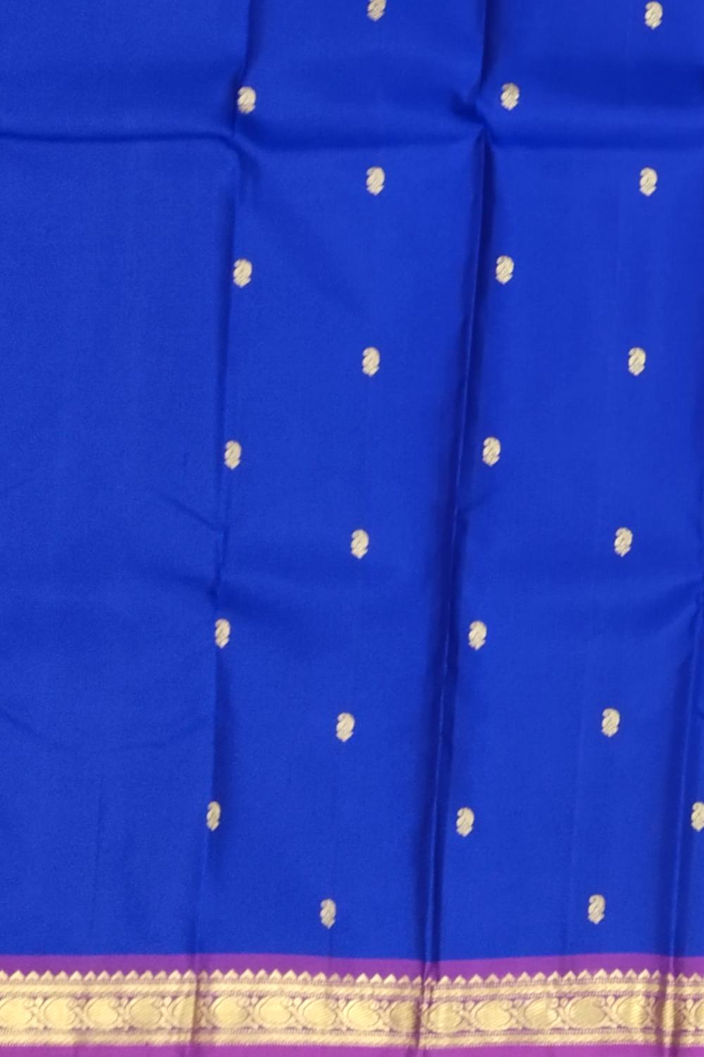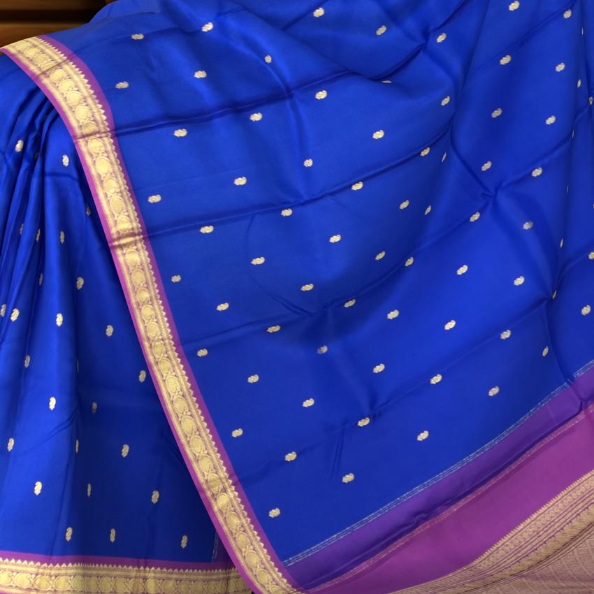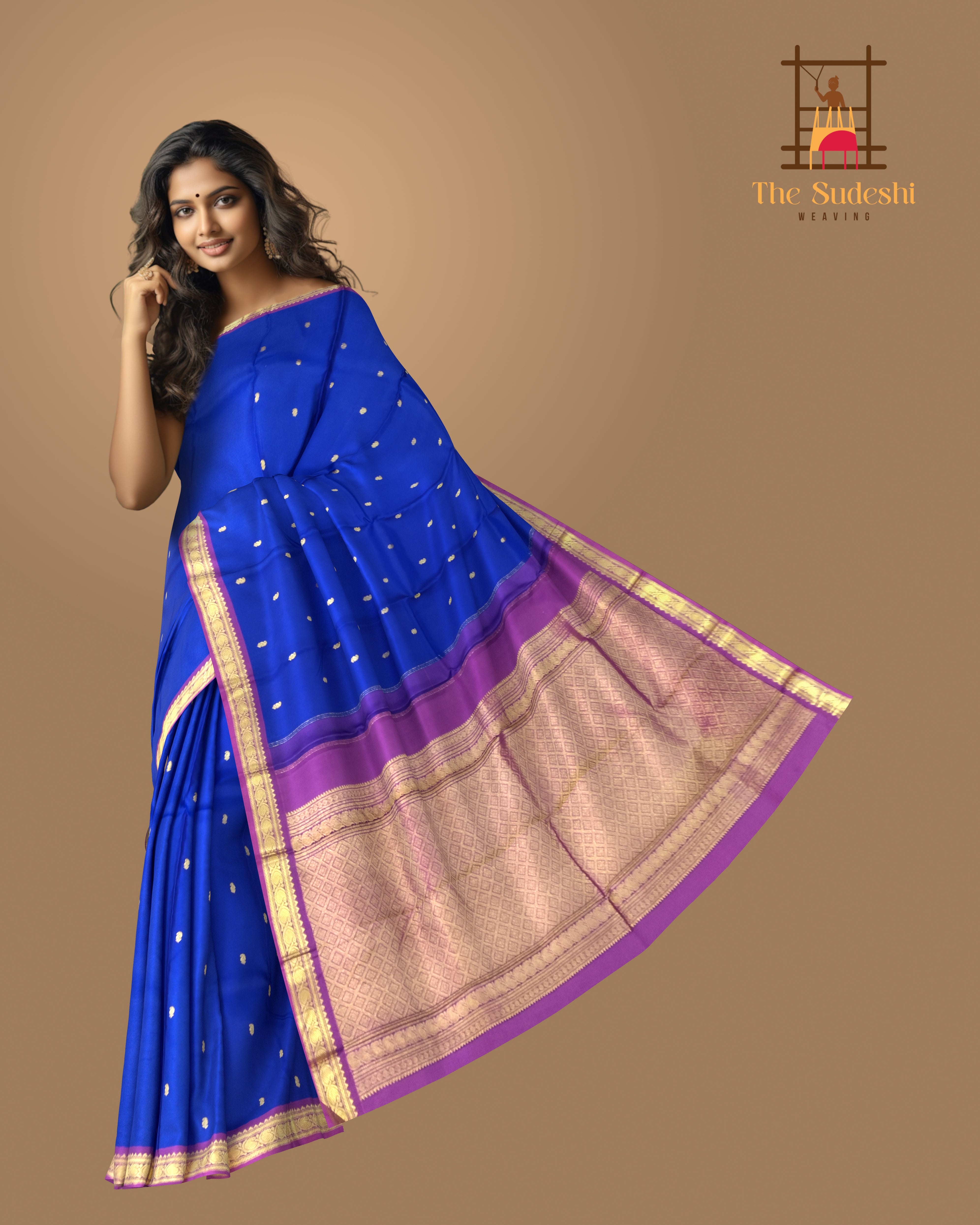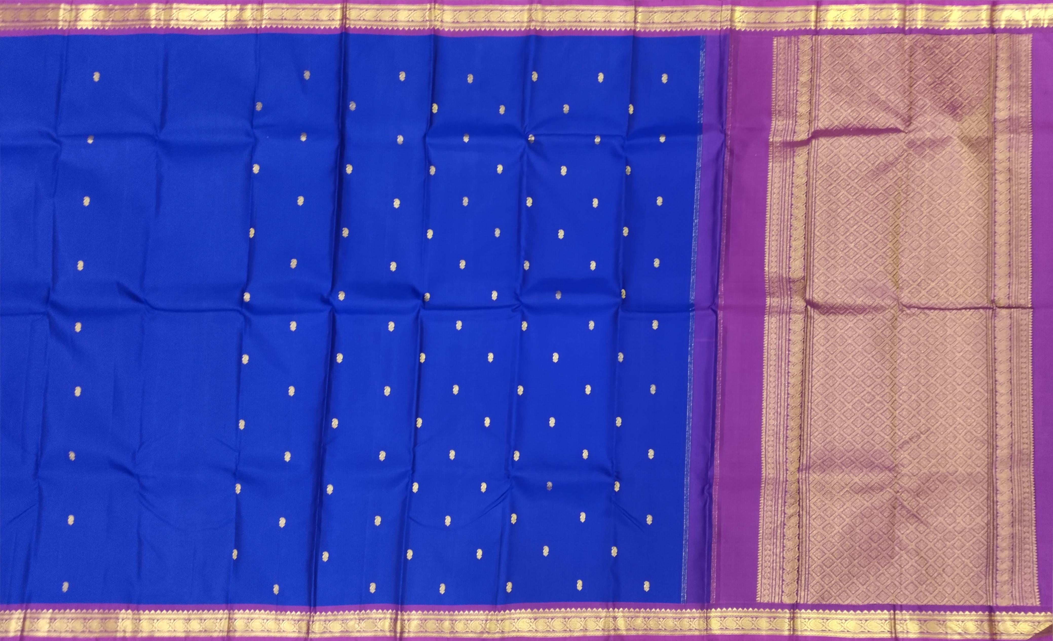 Envelop yourself in the regal charm of this Royal Blue Kanchipuram Silk Saree, delicately adorned with small bhuttas and exquisite purple accents. The deep royal blue body exudes an air of sophistication and timeless elegance, while the tiny, meticulously woven bhuttas add a subtle shimmer. The rich purple in the border and pallu creates a captivating contrast, elevating the saree with a touch of royal allure.