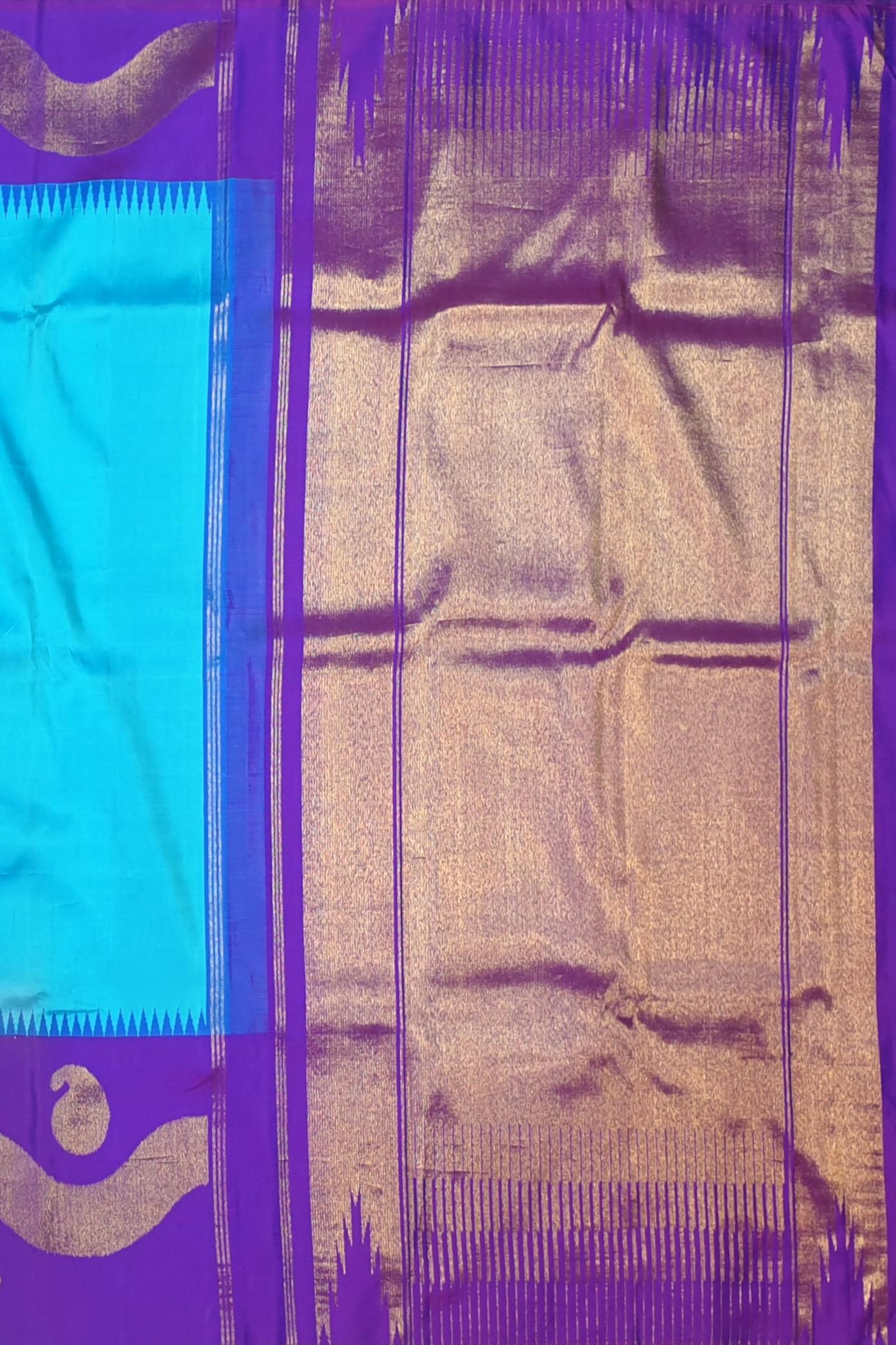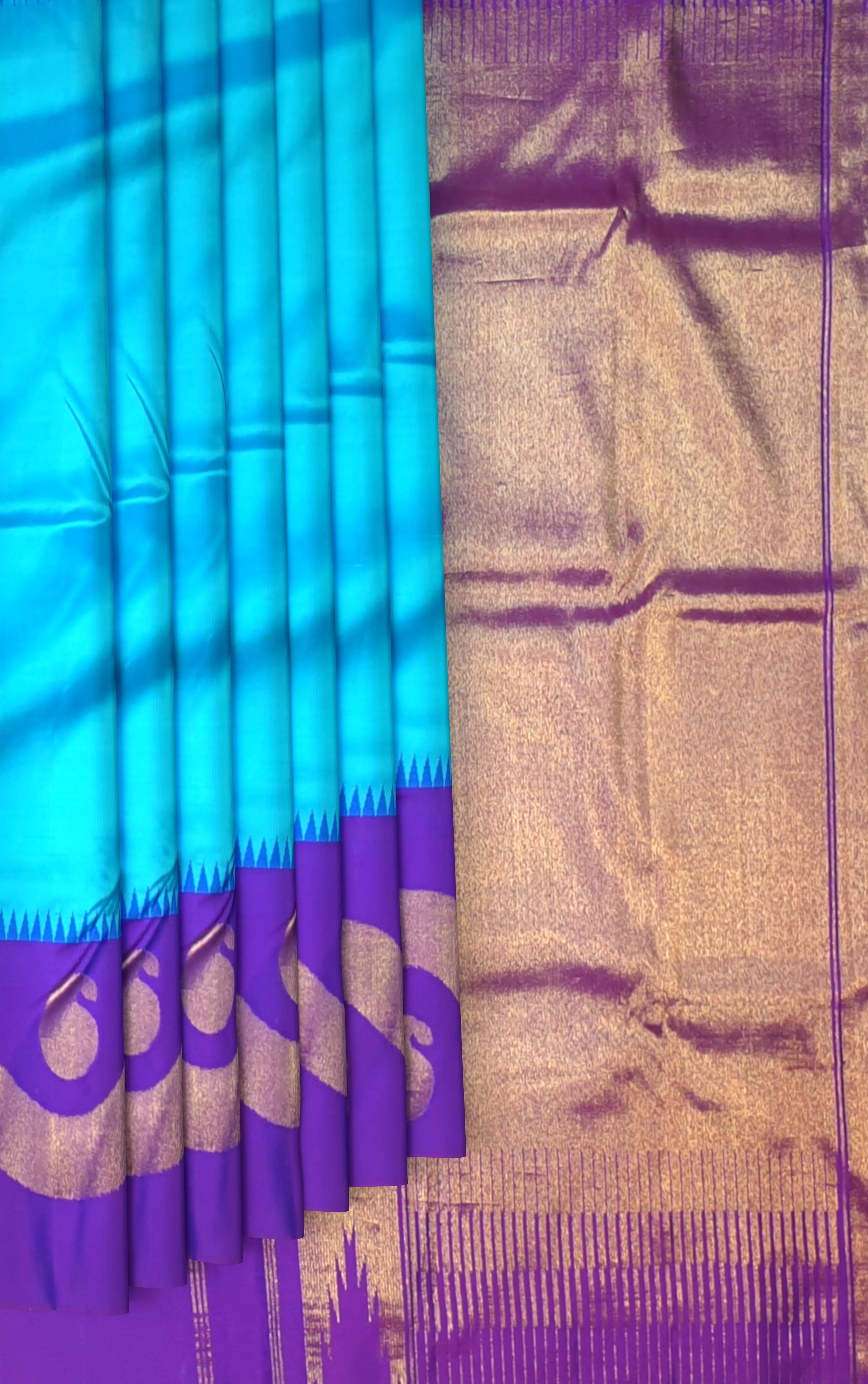 This royal blue Kanchipuram silk saree is the epitome of quiet elegance. The body is kept plain, letting the luxurious silk lustre take center stage, while the rich purple wave border adds just the right touch of contrast and drama. The pallu and blouse echo the regal purple hue, creating a seamless flow of colors that feels both bold and refined. It's a saree that proves less can indeed be more, perfect for the woman who prefers sophistication over extravagance.