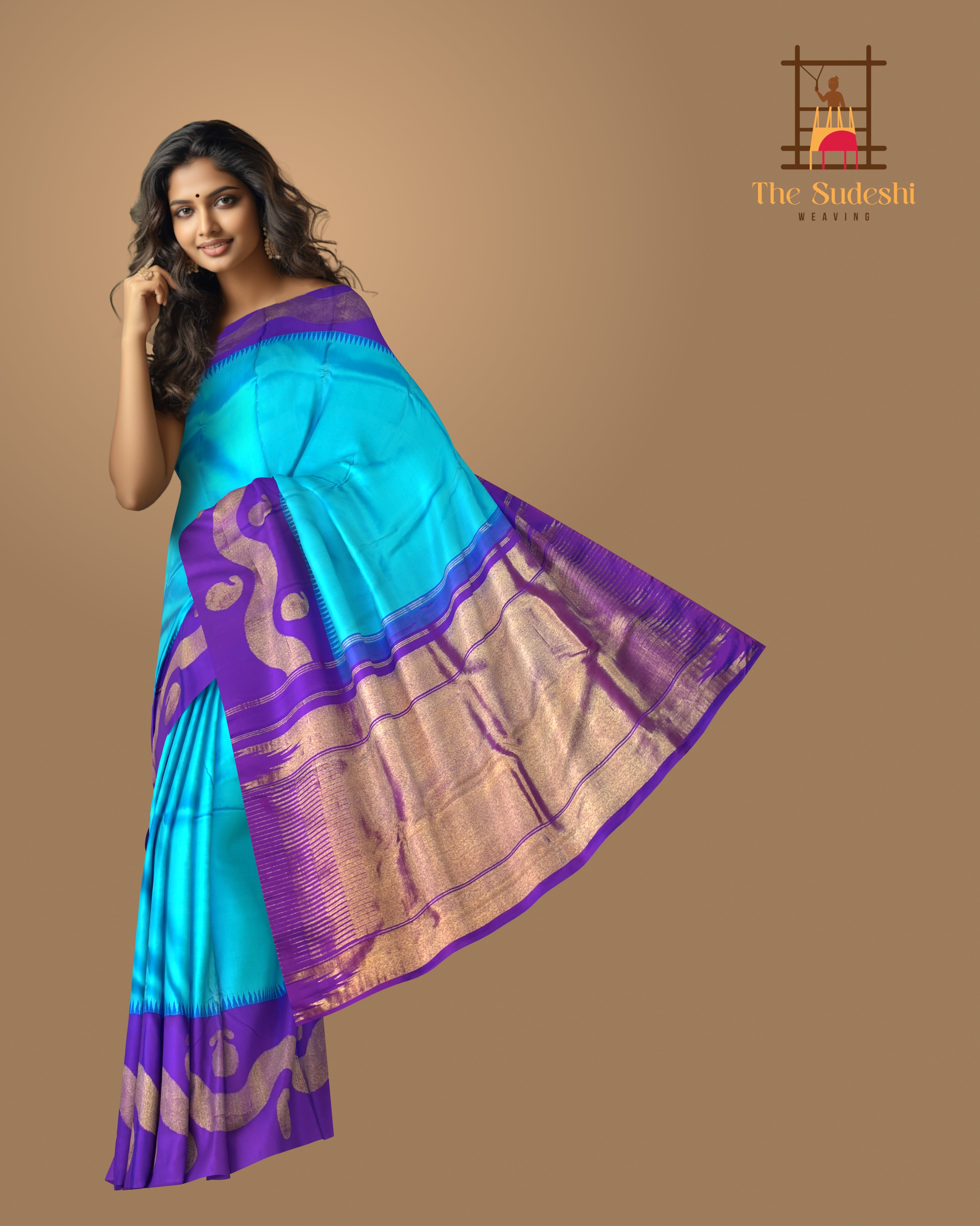 Originating from the temple town of Kanchipuram, these pure silk sarees are celebrated for their durability, depth of color, and handwoven artistry. The wave border featured in this saree is a nod to traditional South Indian motifs that often draw inspiration from elements of nature—symbolizing continuity, harmony, and flow. Every thread is handwoven with care, showcasing the weaver's skill and the legacy of Kanchi craftsmanship.