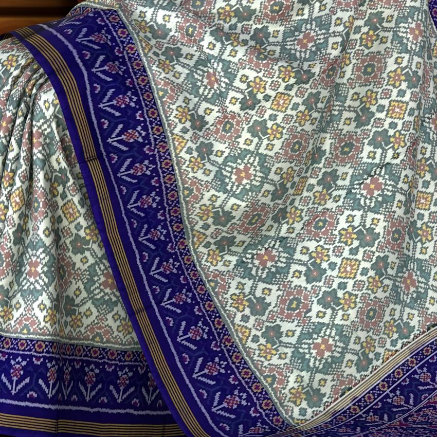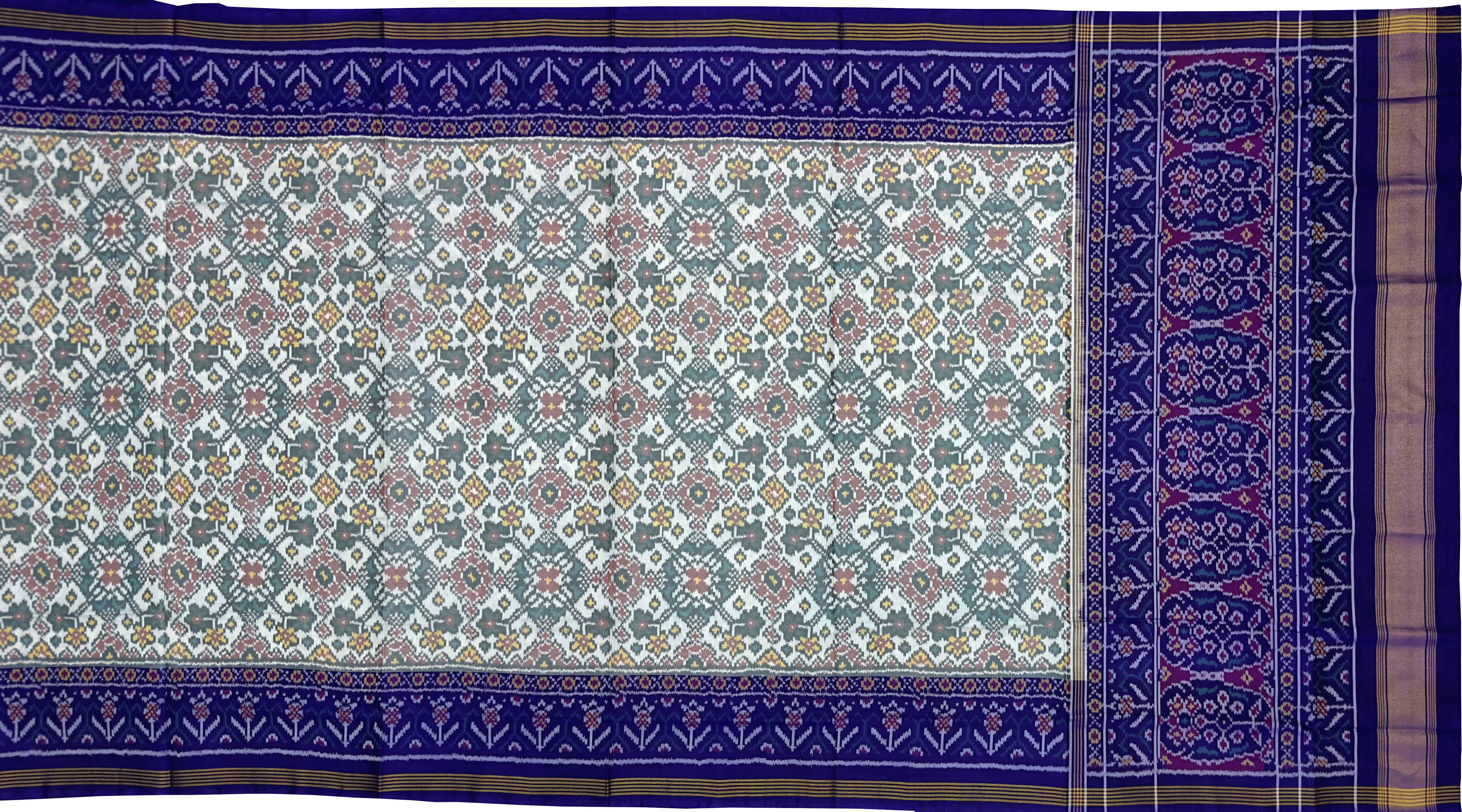 This gorgeous Royal Blue Off White Single Ikat Semi Patan Patola Saree is a stunning and elegant piece. The saree features a beautiful Navratna design, intricately woven in Royal Blue Off White hues.