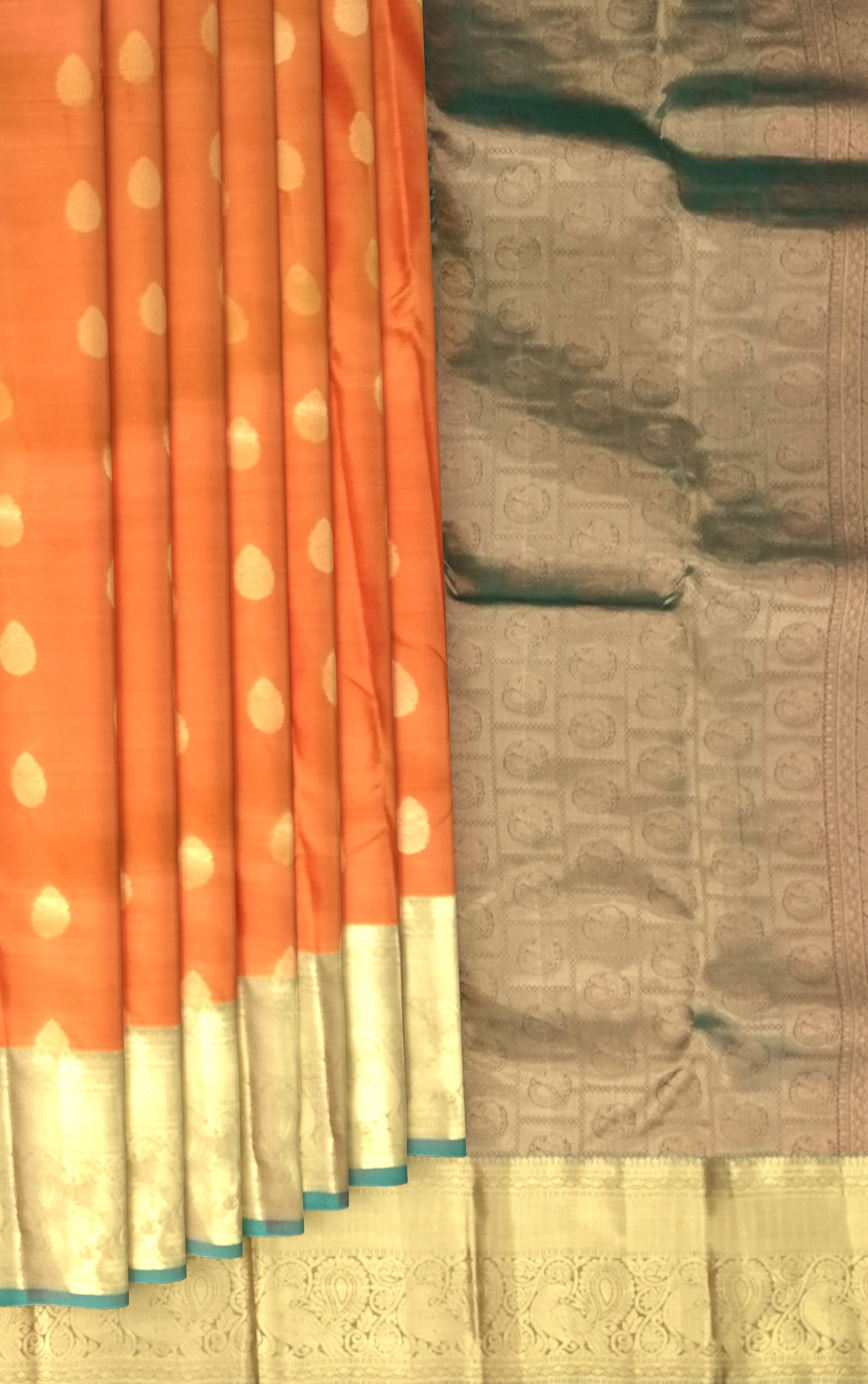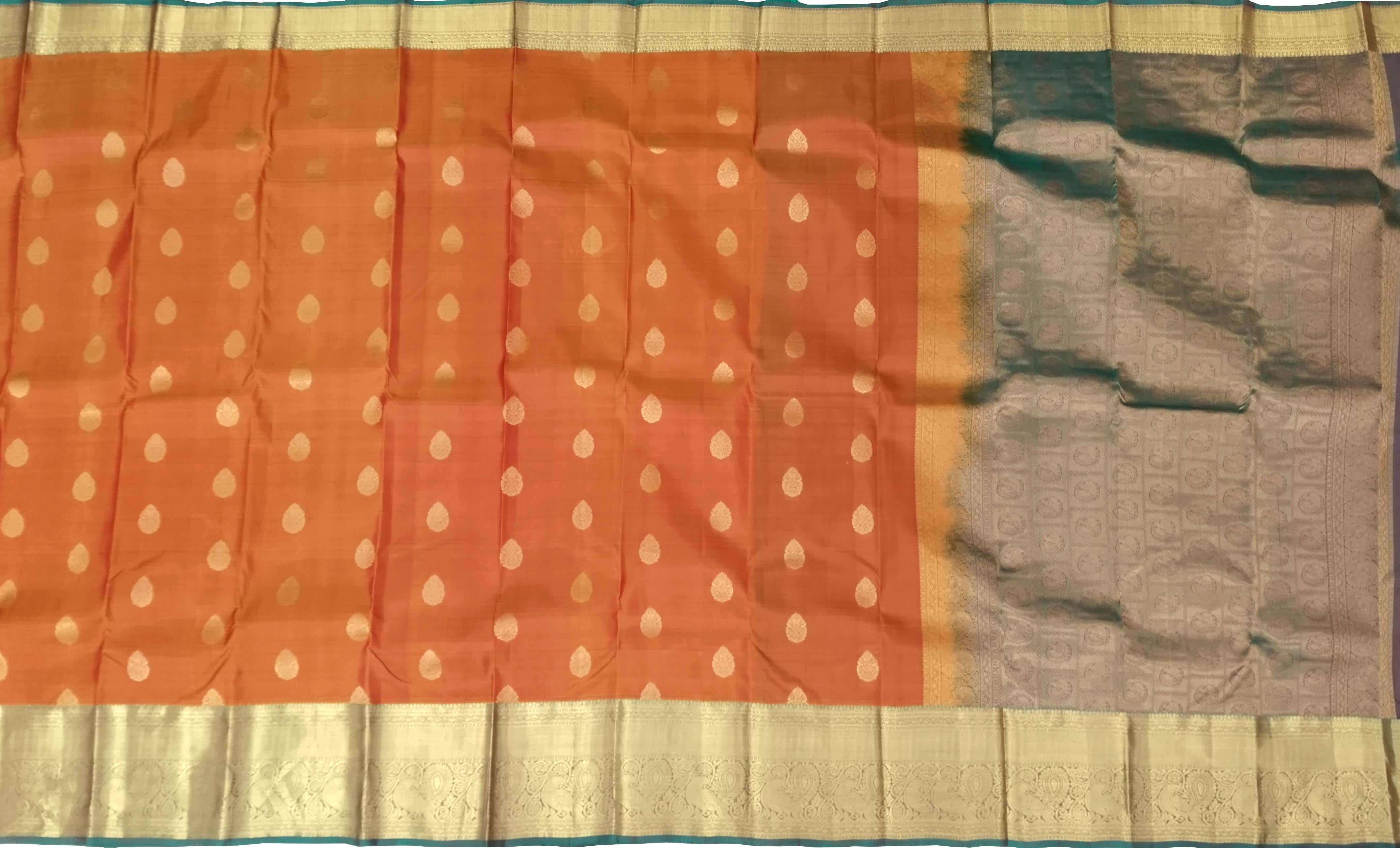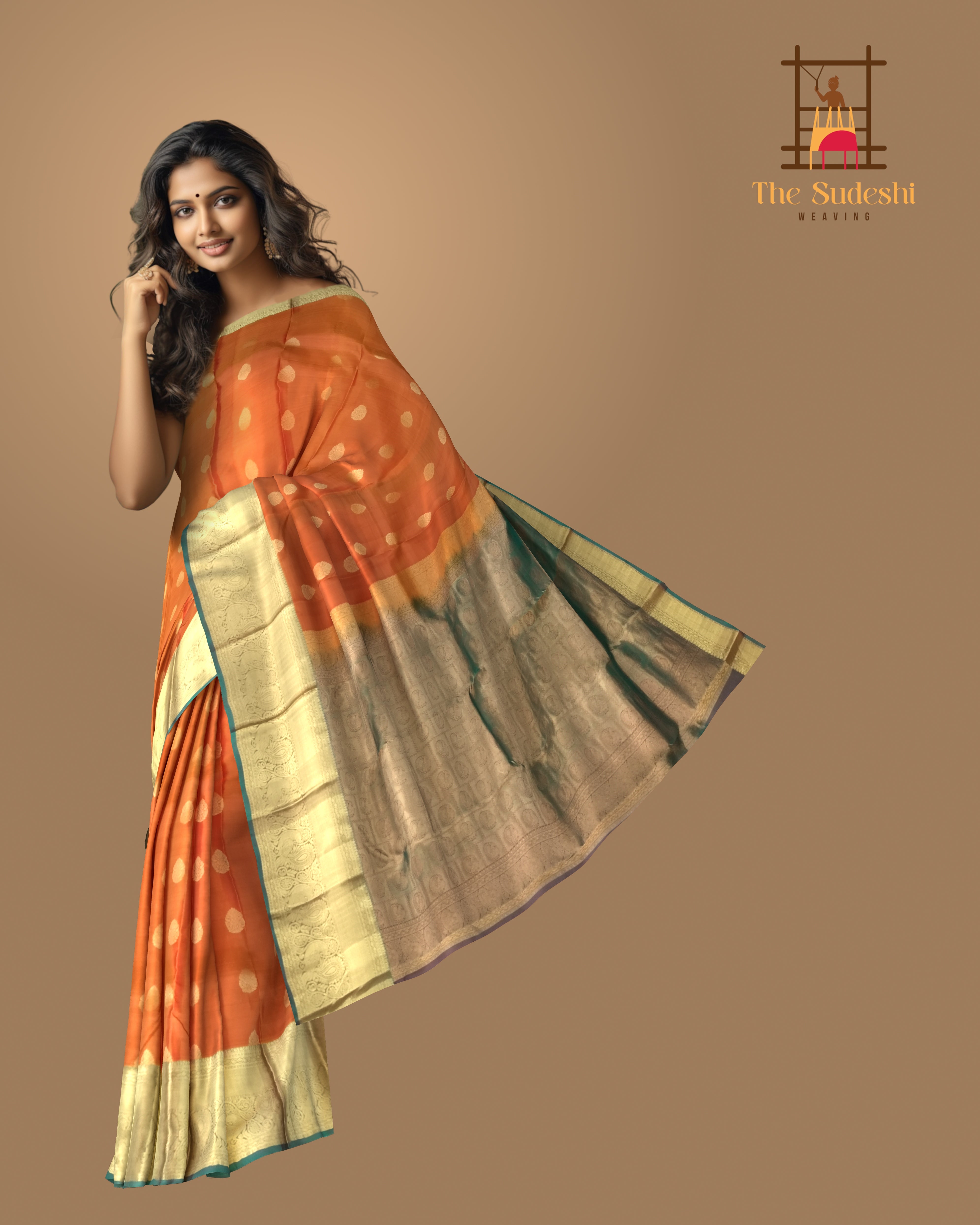 Vibrant and festive, this Rust Orange Kanchipuram Silk Saree gleams with dual-tone gold zari borders and intricately woven buttas across the body. The interplay of warm hues and golden shimmer adds a regal touch, making it the perfect saree for weddings and grand celebrations. Its rich color radiates confidence, strength, and prosperity. Each Kanchipuram saree is handwoven with care, showcasing the expertise of traditional weavers who bring life to every motif. The pure silk threads and fine zari craftsmanship ensure unmatched durability and elegance. Pair this saree with a gold or deep maroon blouse, complemented by antique temple jewellery for a magnificent traditional ensemble. Note: The appearance of the product’s colors may vary due to lighting conditions or your device’s screen calibration. For further assistance or additional images/videos, feel free to contact us at +91 97897 60367 or email at wecare@thesudeshiweaving.com.