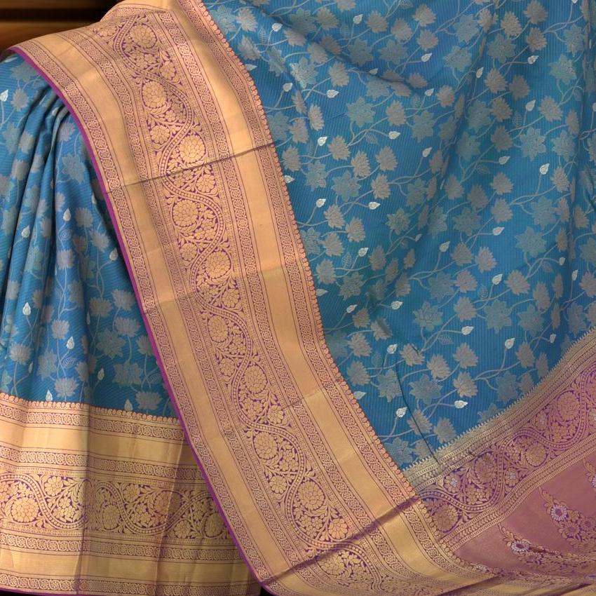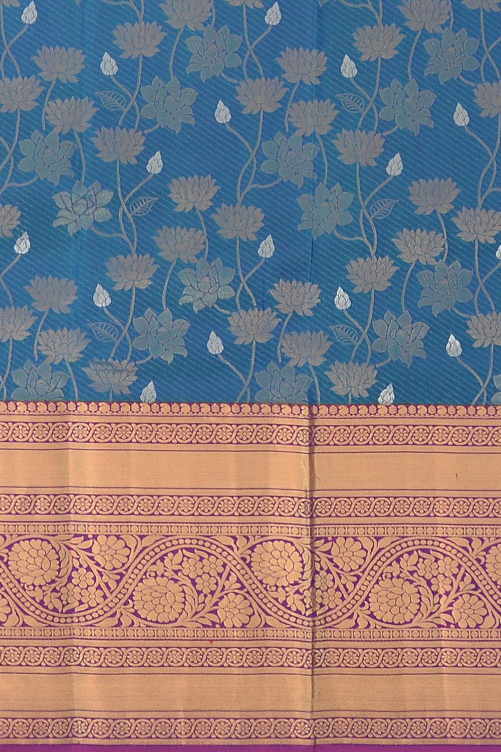 The pallu continues the floral saga, woven with meticulous care in Purple. Each pattern on the pallu is a celebration of floral artistry, designed to capture the attention and to hold it in a silent reverence of the weaver’s skill.