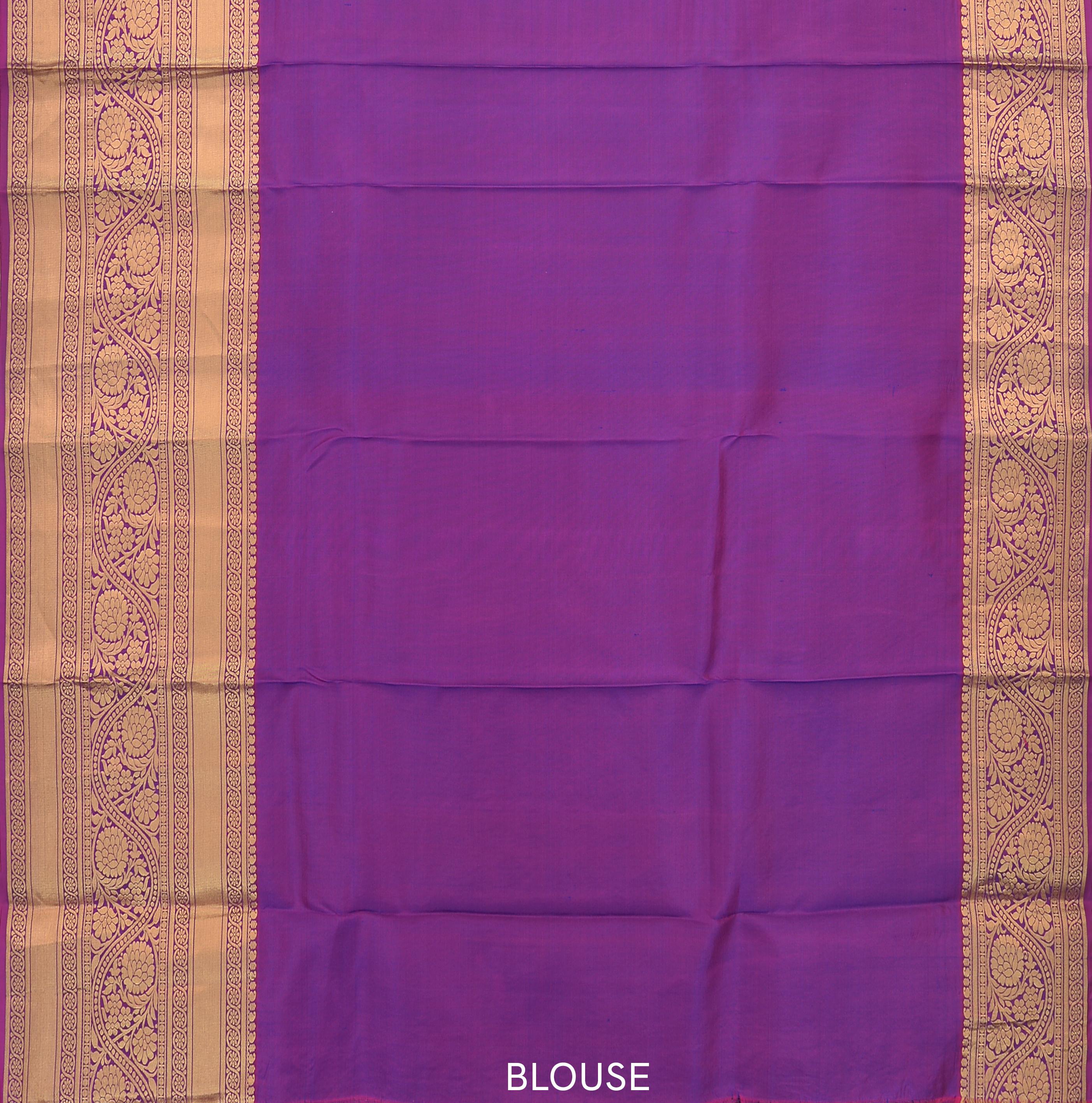 Completing the ensemble is a Purple blouse that reflects the saree’s luxurious feel and detailed design, waiting to be customized into a perfect pairing for the saree’s noble allure.
