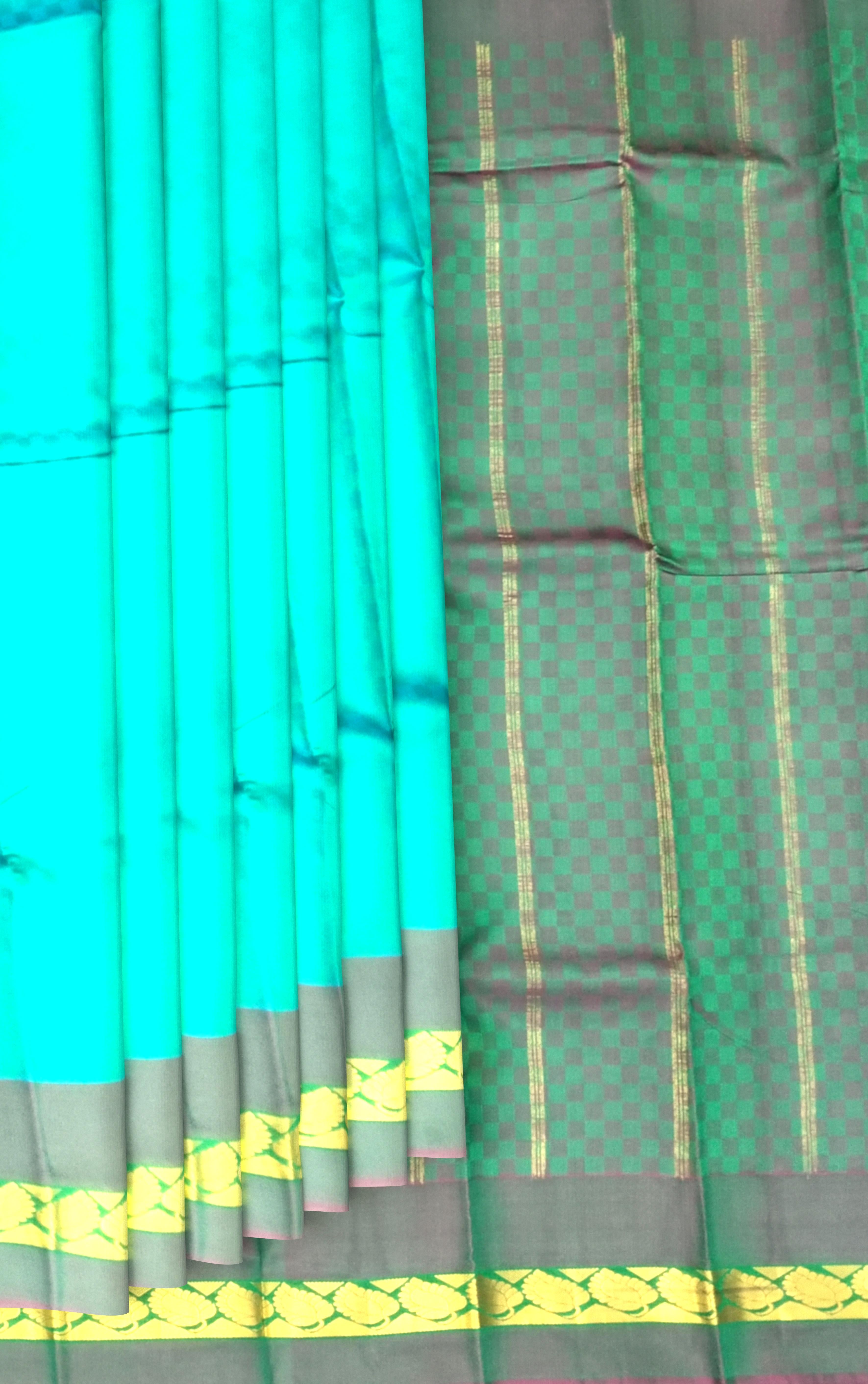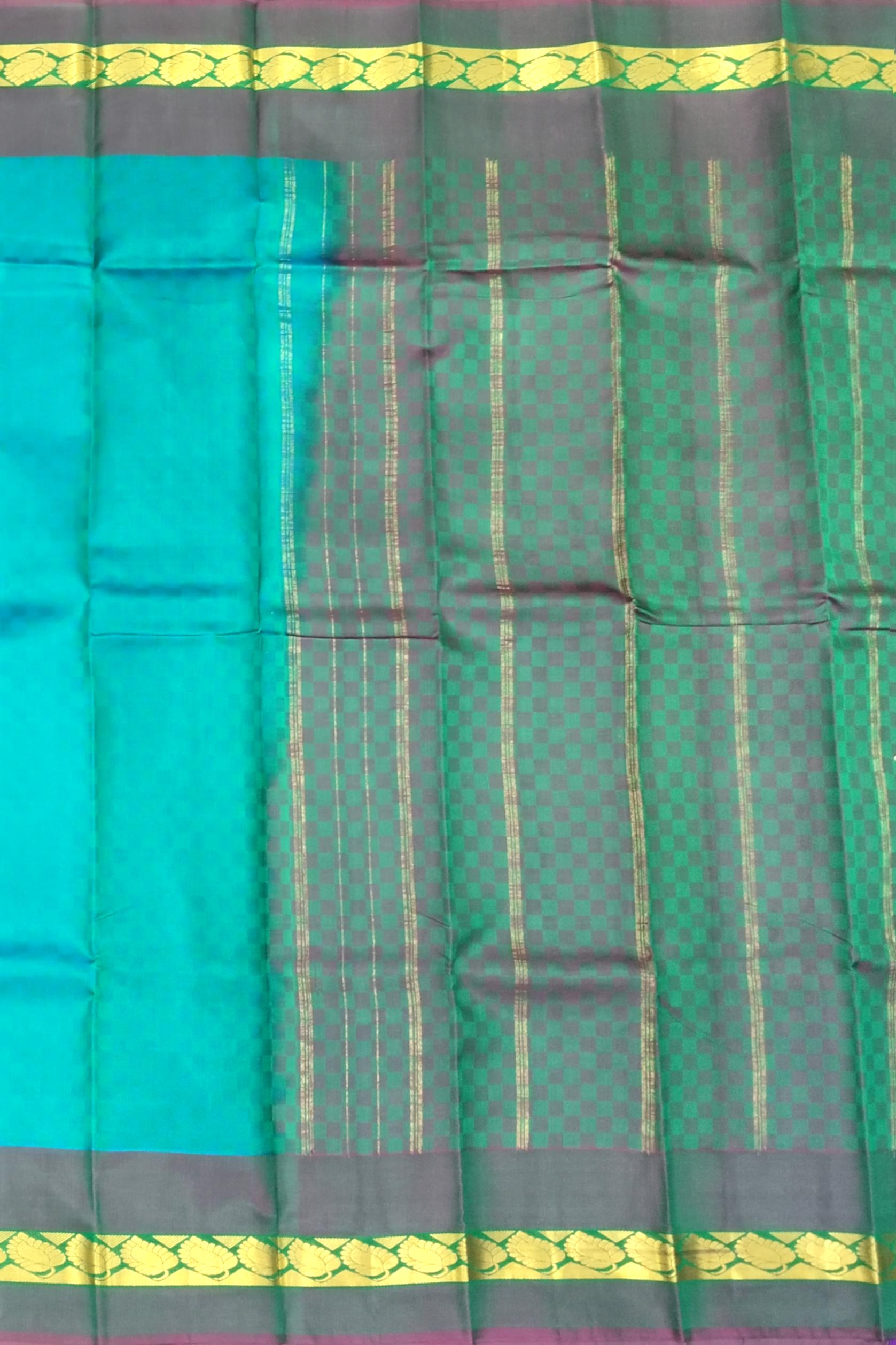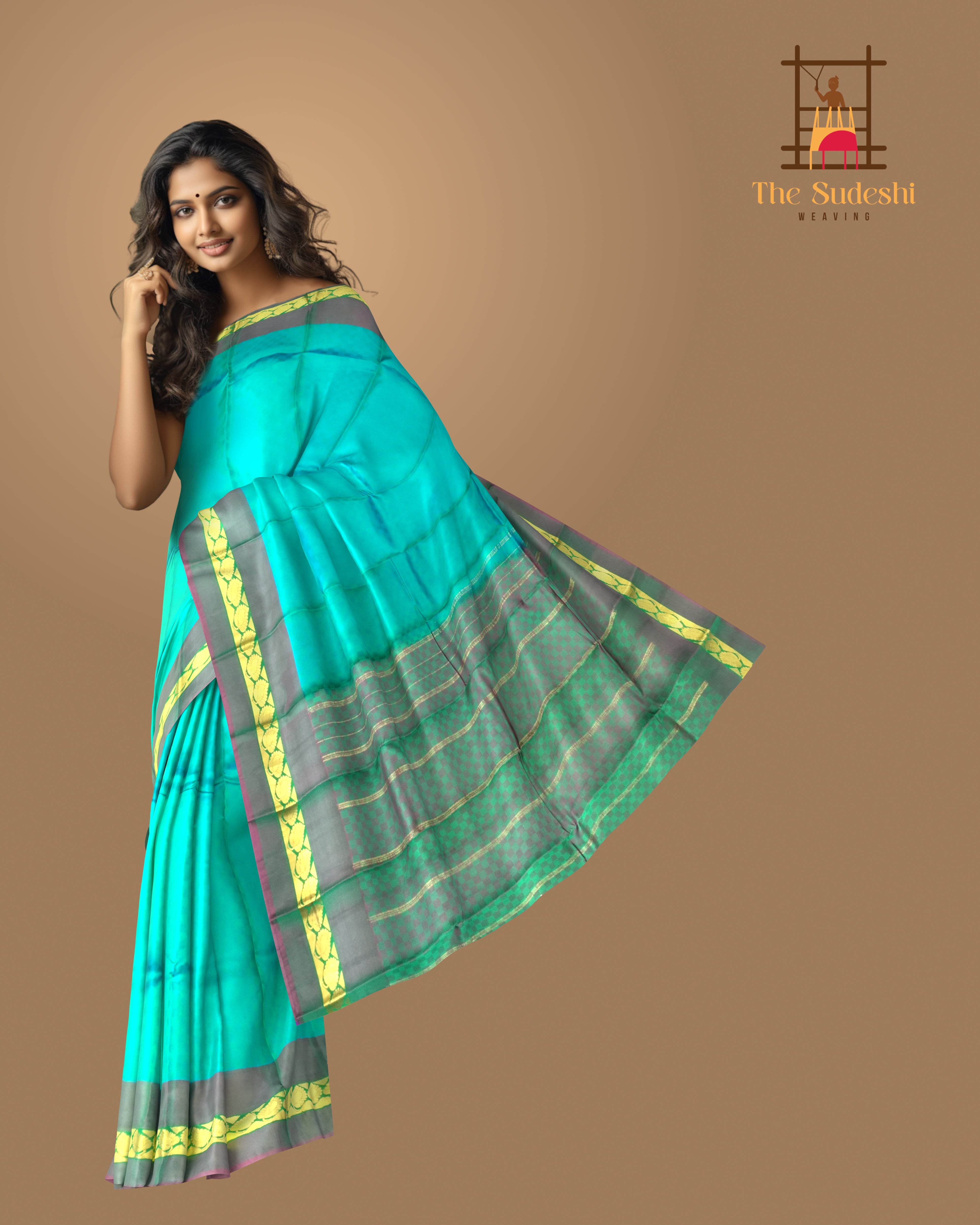 This elegant Sea Green Kanchipuram Silk Saree is a tribute to traditional craftsmanship and refined luxury. The saree features exquisite jacquard thread work across the body, adding subtle texture and a soft shimmer that complements the single-side green border. Its lustrous silk weave radiates sophistication, making it a timeless choice for special occasions. Kanchipuram pure silk sarees are cherished for their rich heritage and exceptional artistry. Handwoven using the finest mulberry silk threads, these sarees are known for their durability, sheen, and intricate patterns that reflect centuries of South Indian weaving excellence. Each piece embodies the cultural legacy of Kanchipuram’s renowned silk tradition. Ideal for weddings, festive events, and cultural celebrations, this saree pairs gracefully with a green or gold blouse. Complete your look with antique jewellery, a statement clutch, and traditional sandals to exude elegance and grandeur. Note: The appearance of the product’s colors may vary due to lighting conditions or your device’s screen calibration. For further assistance or additional images/videos, feel free to contact us at +91 97897 60367 or email at wecare@thesudeshiweaving.com.