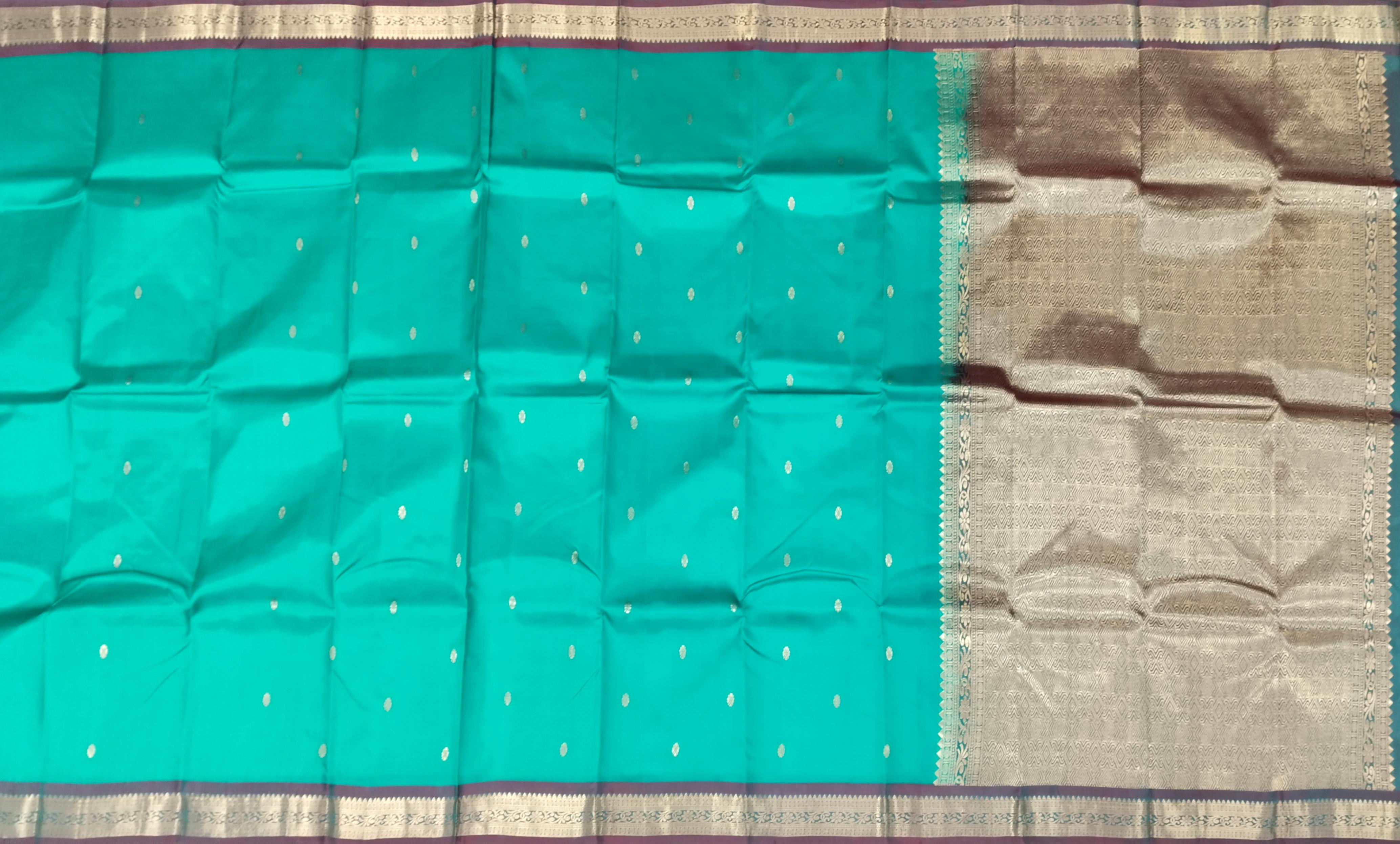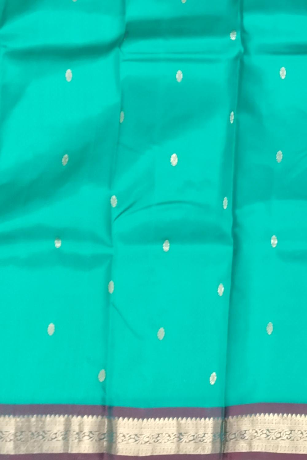Ethereal and elegant, this Sea Green Kanchipuram Silk Saree is adorned with delicate small buttas woven across the body, creating a subtle shimmer with every drape. The dull maroon border and pallu provide a gentle contrast, adding warmth to the cool green tone. The result is a graceful blend of tradition and sophistication. Kanchipuram pure silk sarees are known for their heritage weaving and rich silk texture. Handcrafted with precision in the temple town of Kanchipuram, these sarees are symbols of cultural legacy and timeless beauty. Perfect for pujas, family gatherings, and special occasions, this saree pairs gracefully with a dull maroon or gold blouse. Complete your look with temple jewellery, minimal makeup, and a soft bun for a touch of classic refinement. Note: The appearance of the product’s colors may vary due to lighting conditions or your device’s screen calibration. For further assistance or additional images/videos, feel free to contact us at +91 97897 60367 or email at wecare@thesudeshiweaving.com.