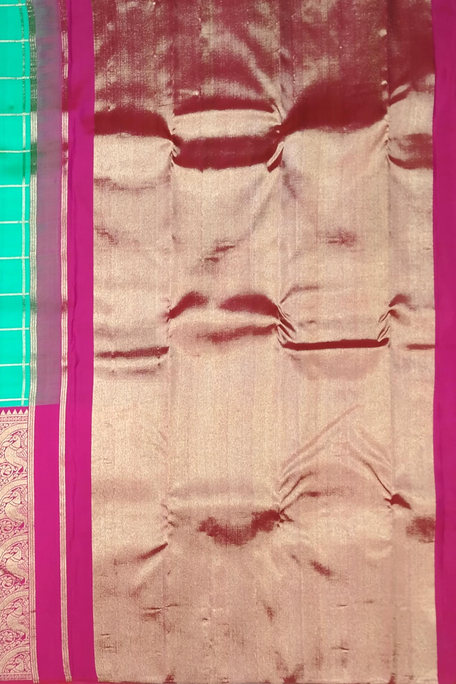 Step into a realm of organic grace with this sea green Kanchipuram silk saree, featuring an eye-catching long border embellished with a floral wave design. The soft checkered body adds a delicate rhythm, while the rich pink border and pallu bring in a burst of vibrant contrast. A matching pink blouse complements the palette, making this saree a perfect harmony of subtlety and splendor.