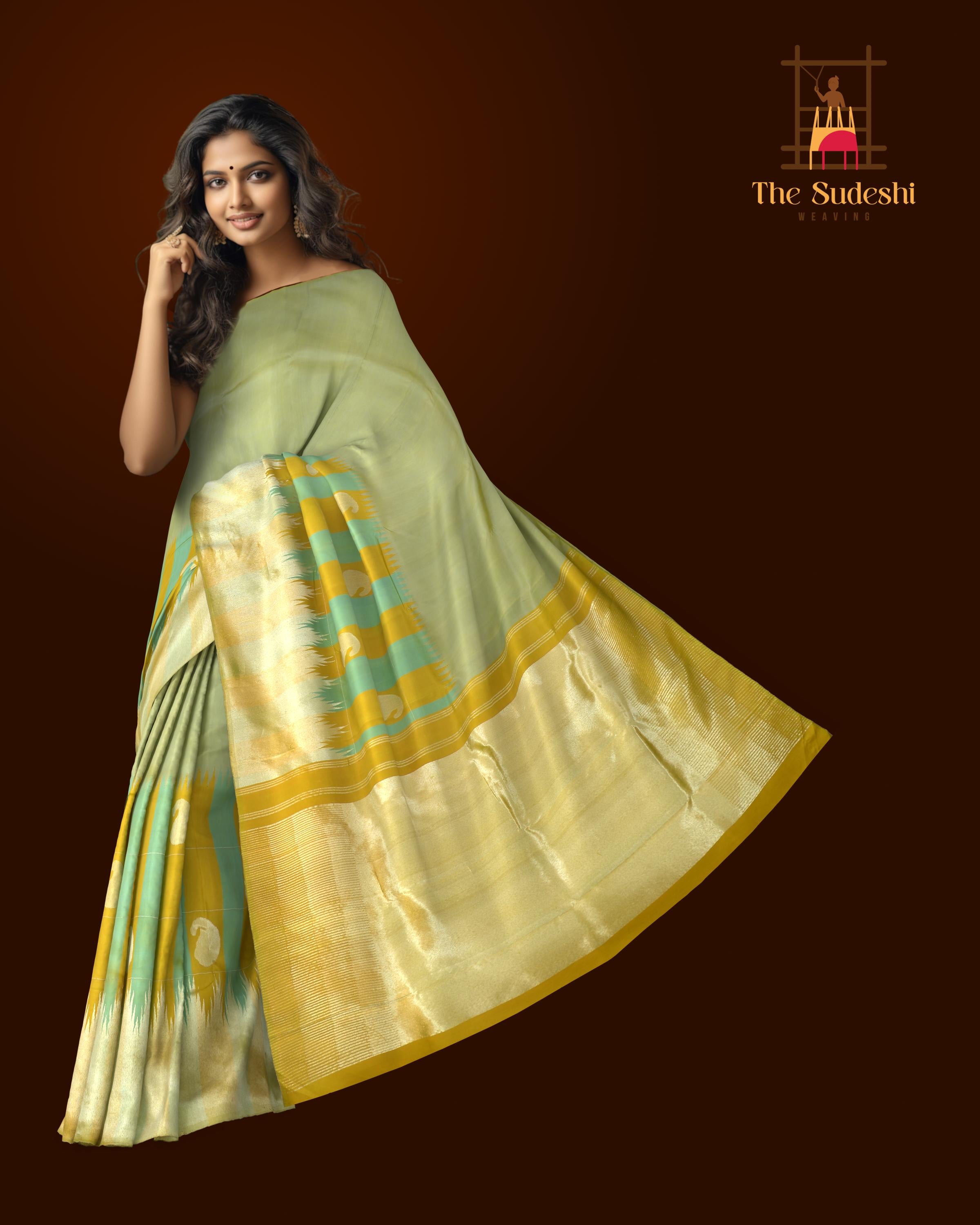 The body, in its plain design, resonates with simplicity, allowing the vibrant temple long border in dual colors of mustard and green to shine through. The grand pallu is a masterpiece in mehandi green, adorned with the 8 Kol Seepu Reku design in shimmering silver zari.