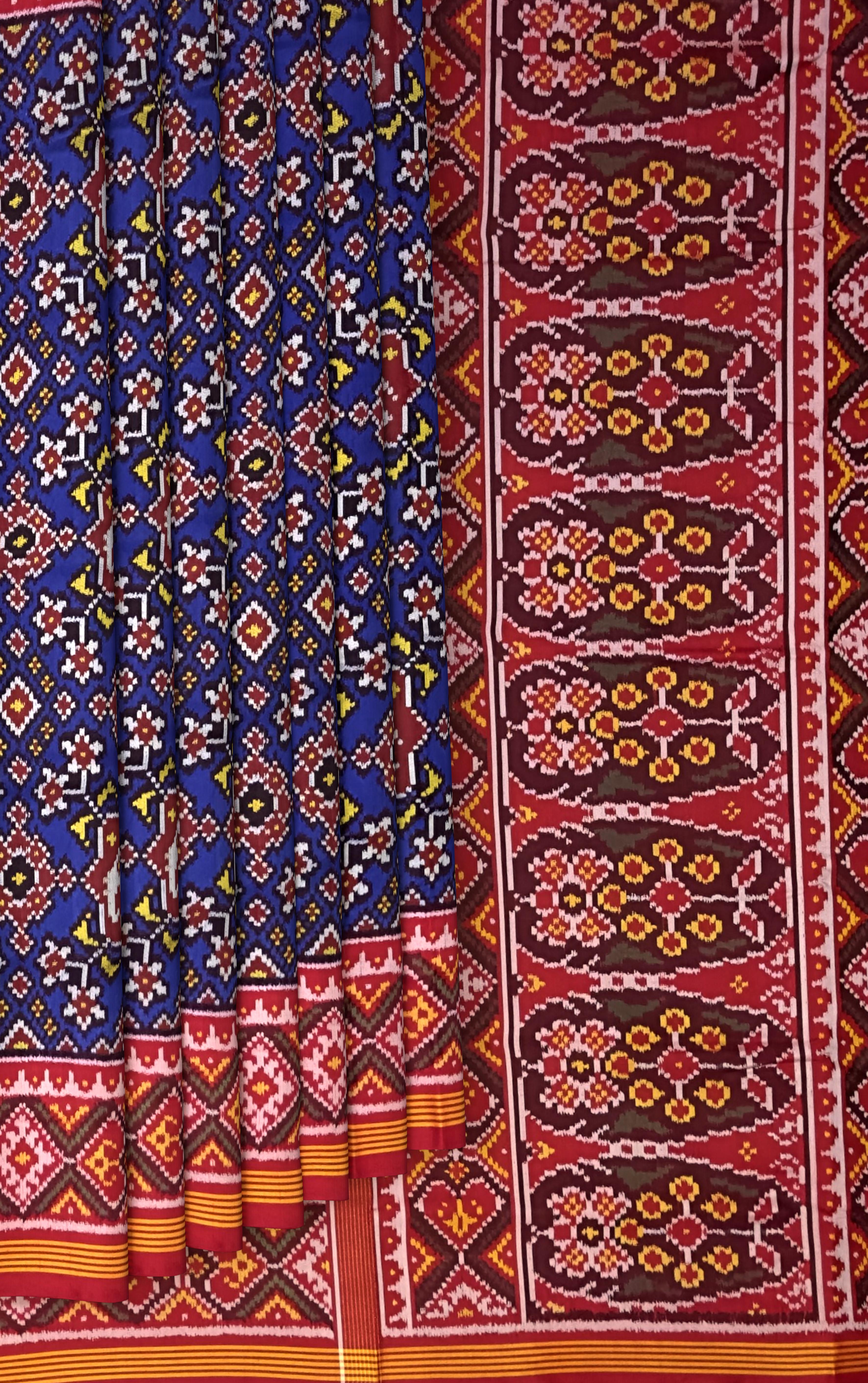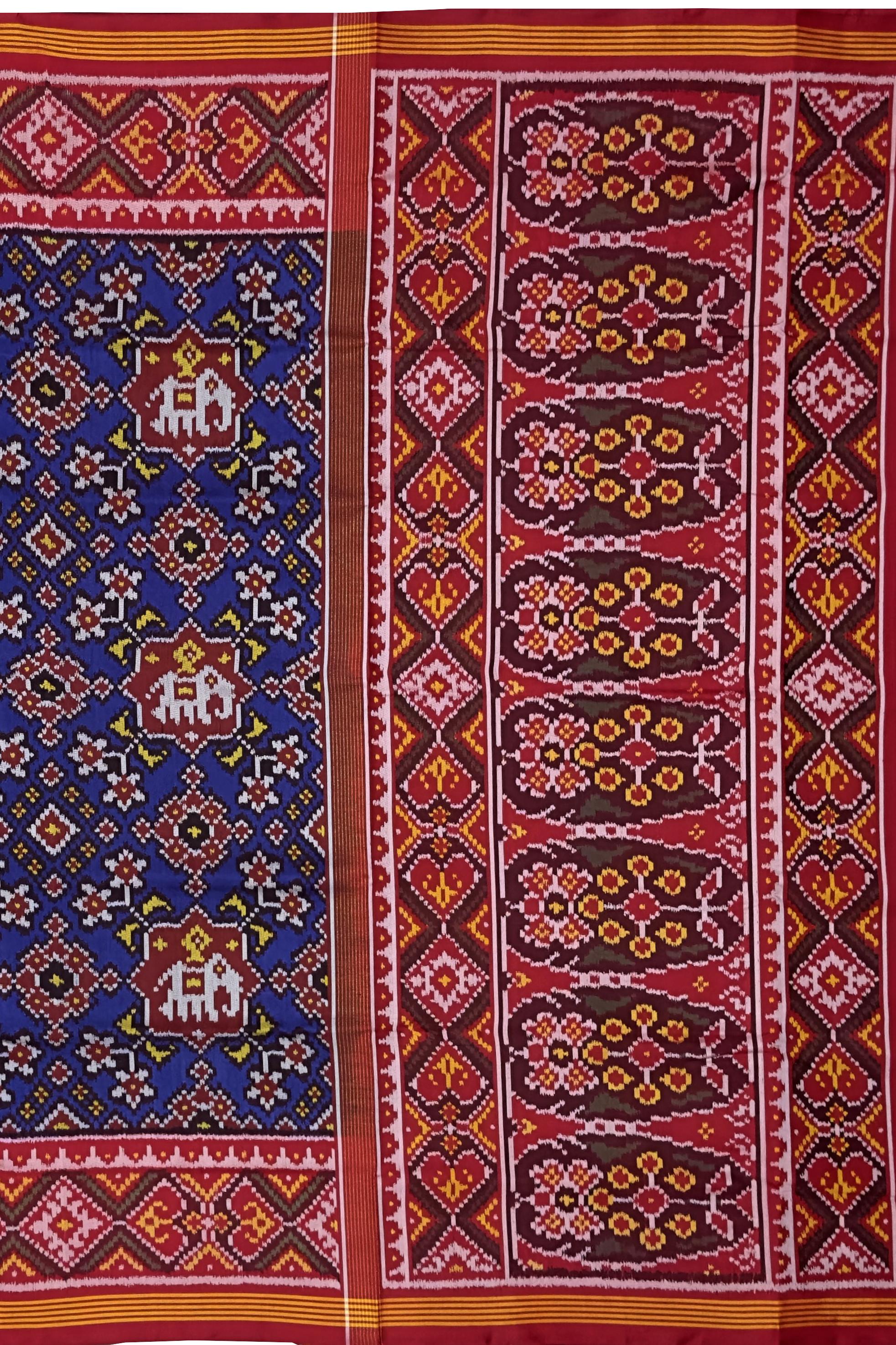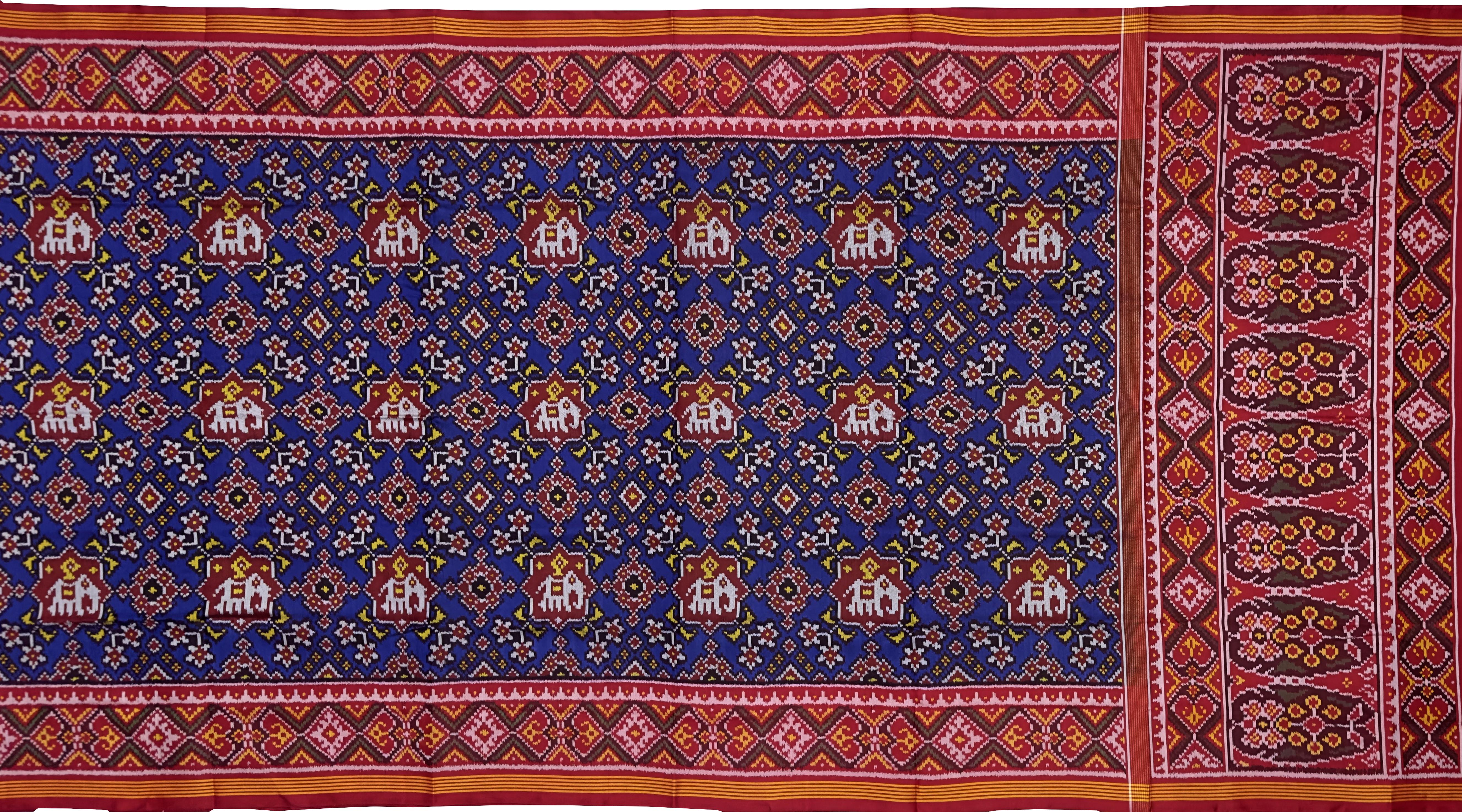 The versatility of the Semi Patan Patola saree makes it ideal for a variety of occasions. Whether you are attending a festive celebration, a family gathering, or a cultural event, this saree allows you to make a grand statement. Pair it with traditional jewelry for a classic look, or opt for contemporary accessories to add a modern twist. With its intricate craftsmanship and bold colors, the Single Ikat Semi Patan Patola saree in navy blue is an essential addition to every woman’s wardrobe, beautifully merging heritage with contemporary fashion.