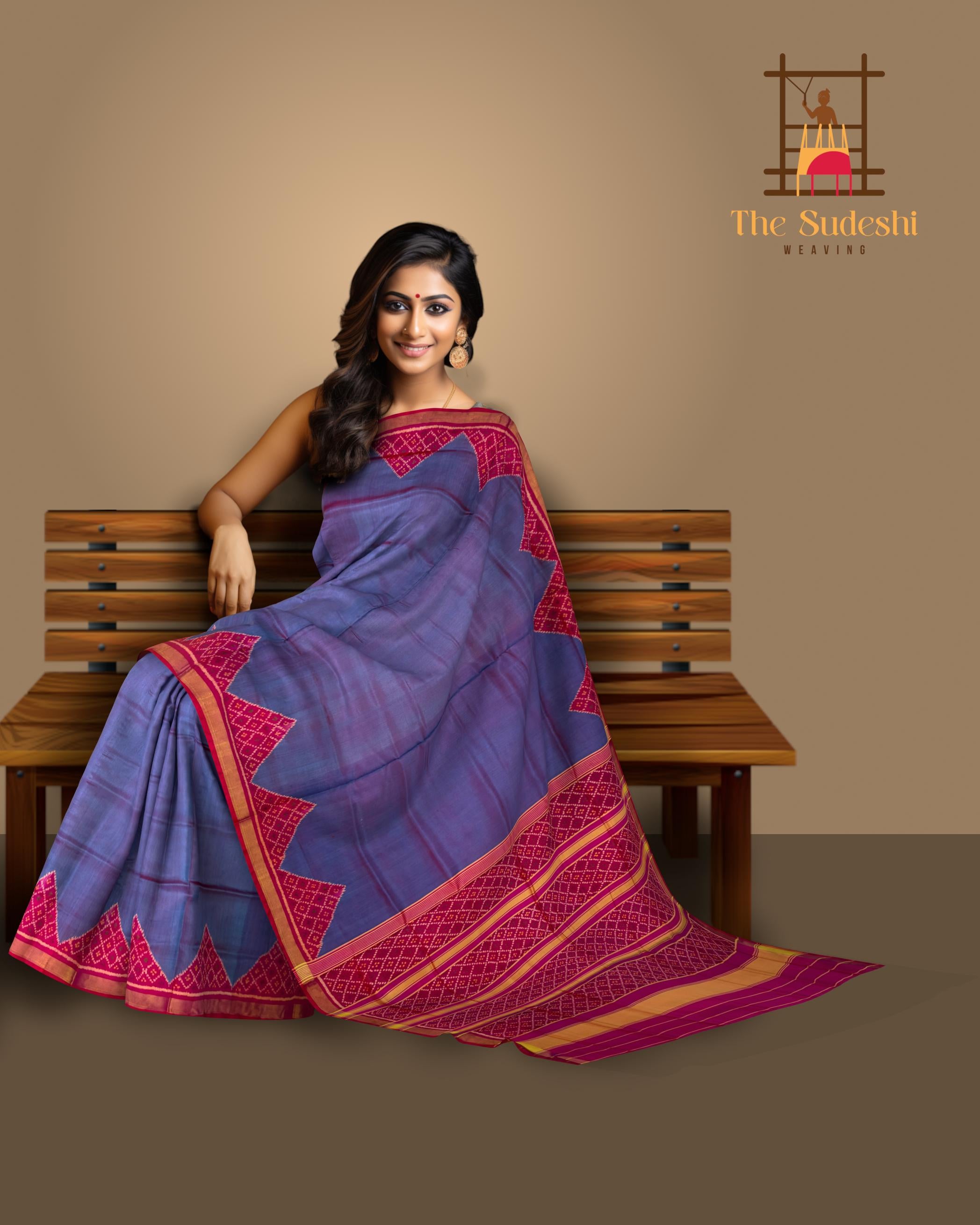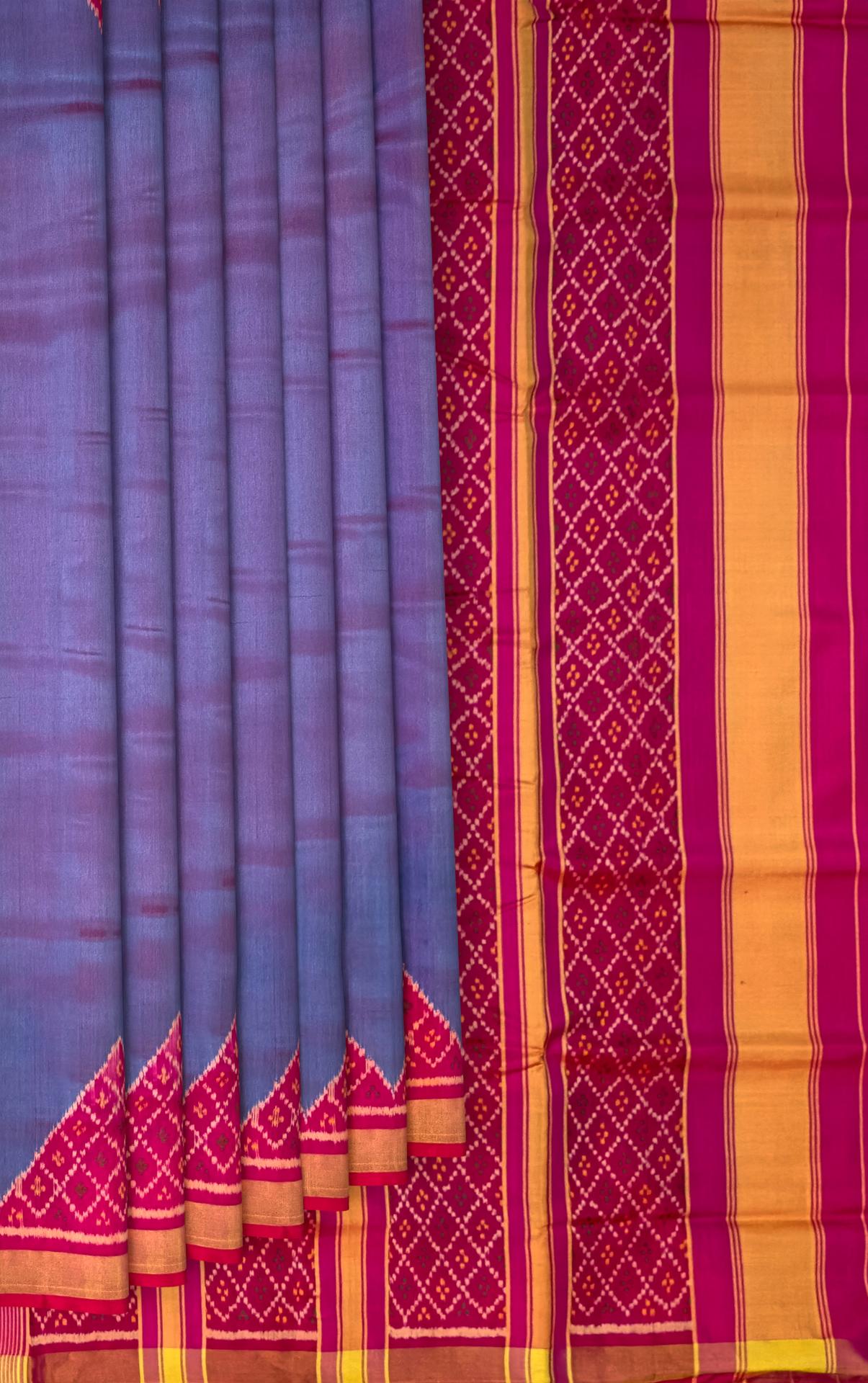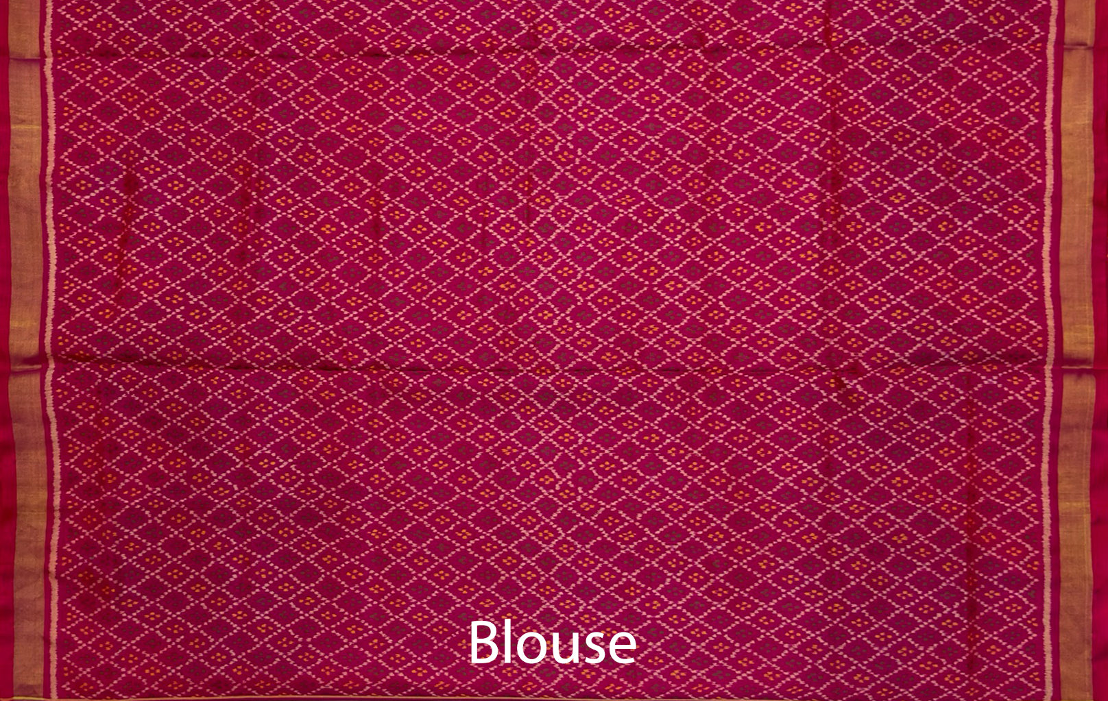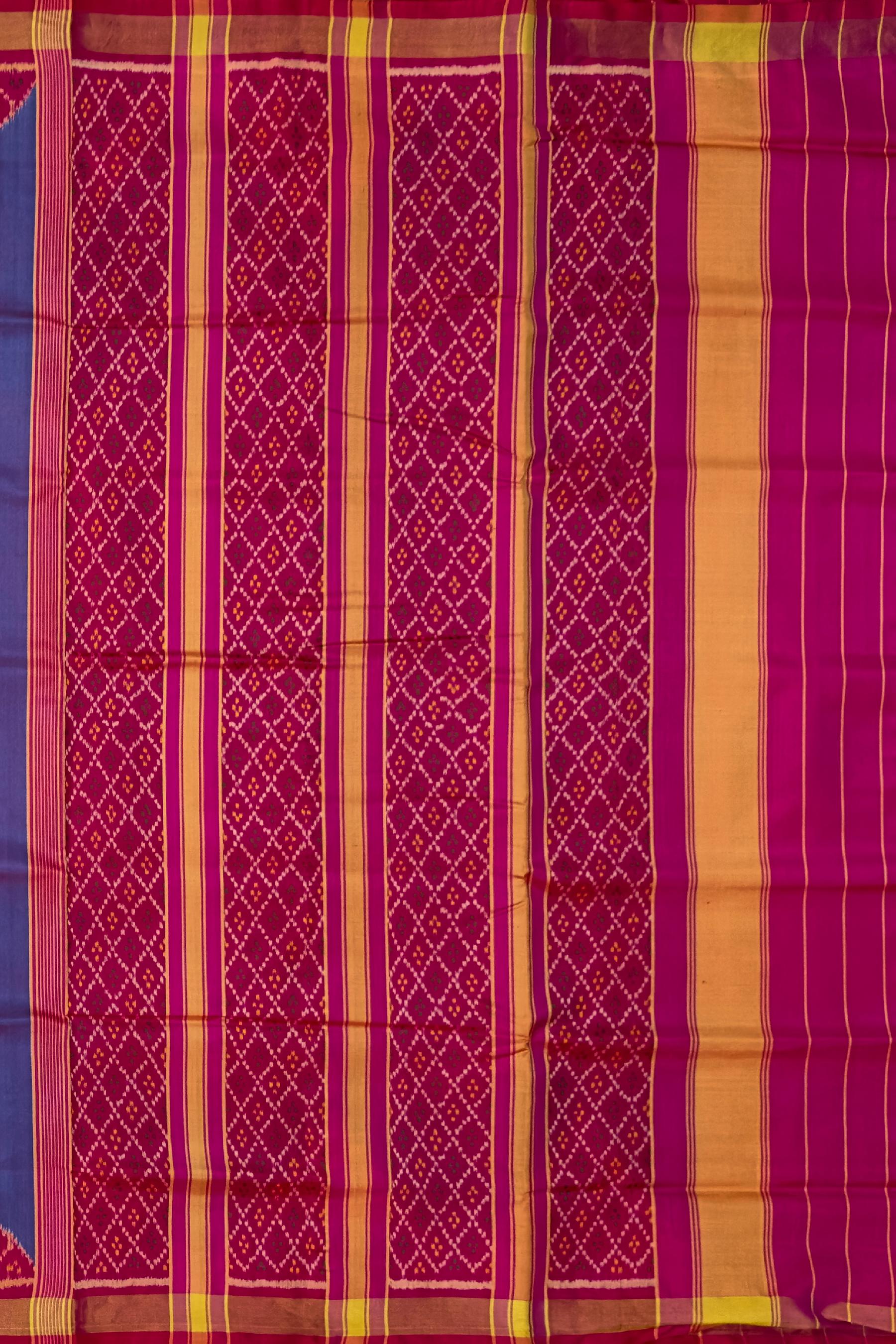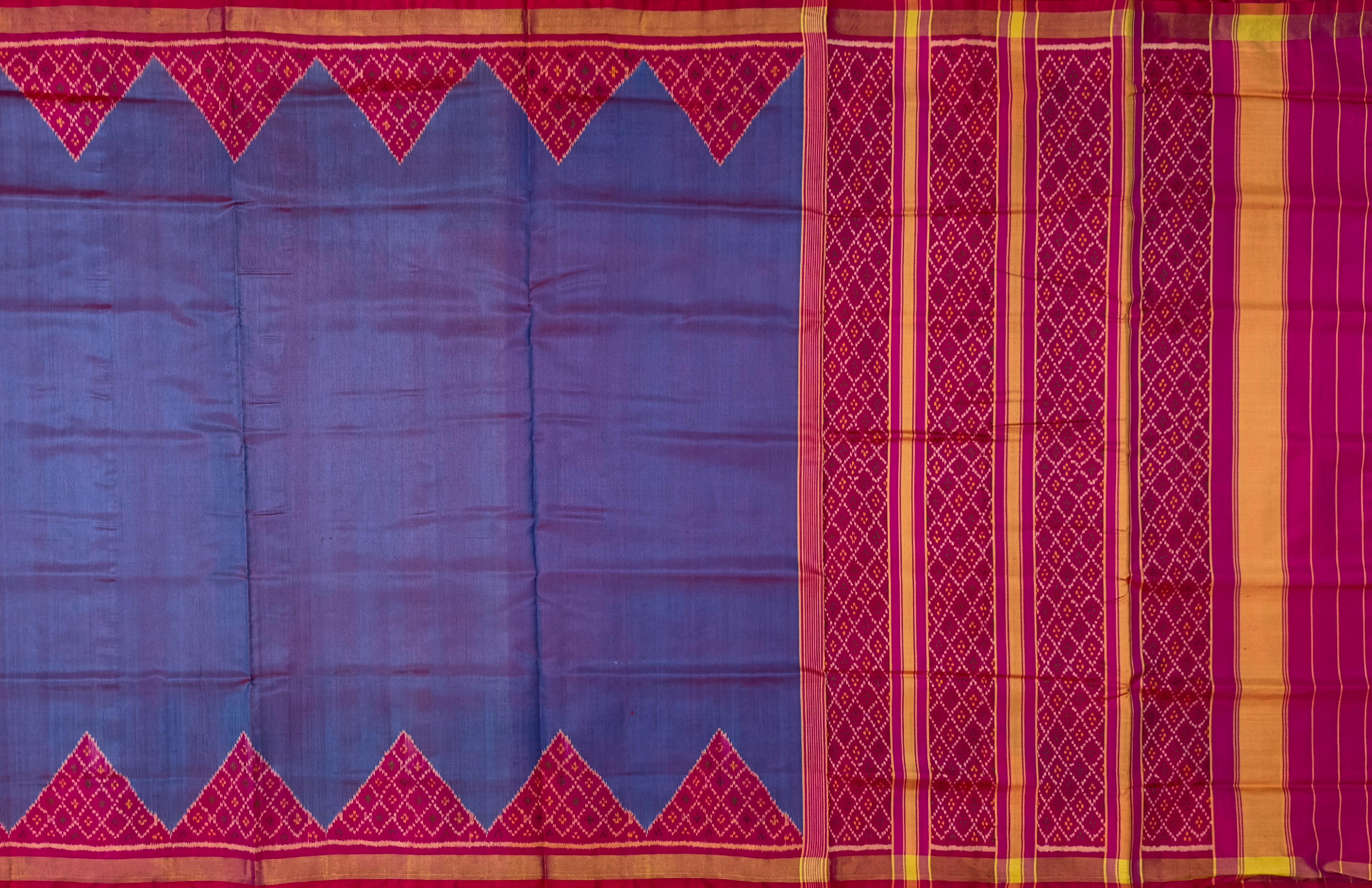 Dazzle in the Sky Blue Galo Temini Patti Jari Regular Rajkot Patola Saree, accented with red and pink borders. This saree is beautifully suited for joyous occasions and celebrations, showcasing exquisite craftsmanship.
