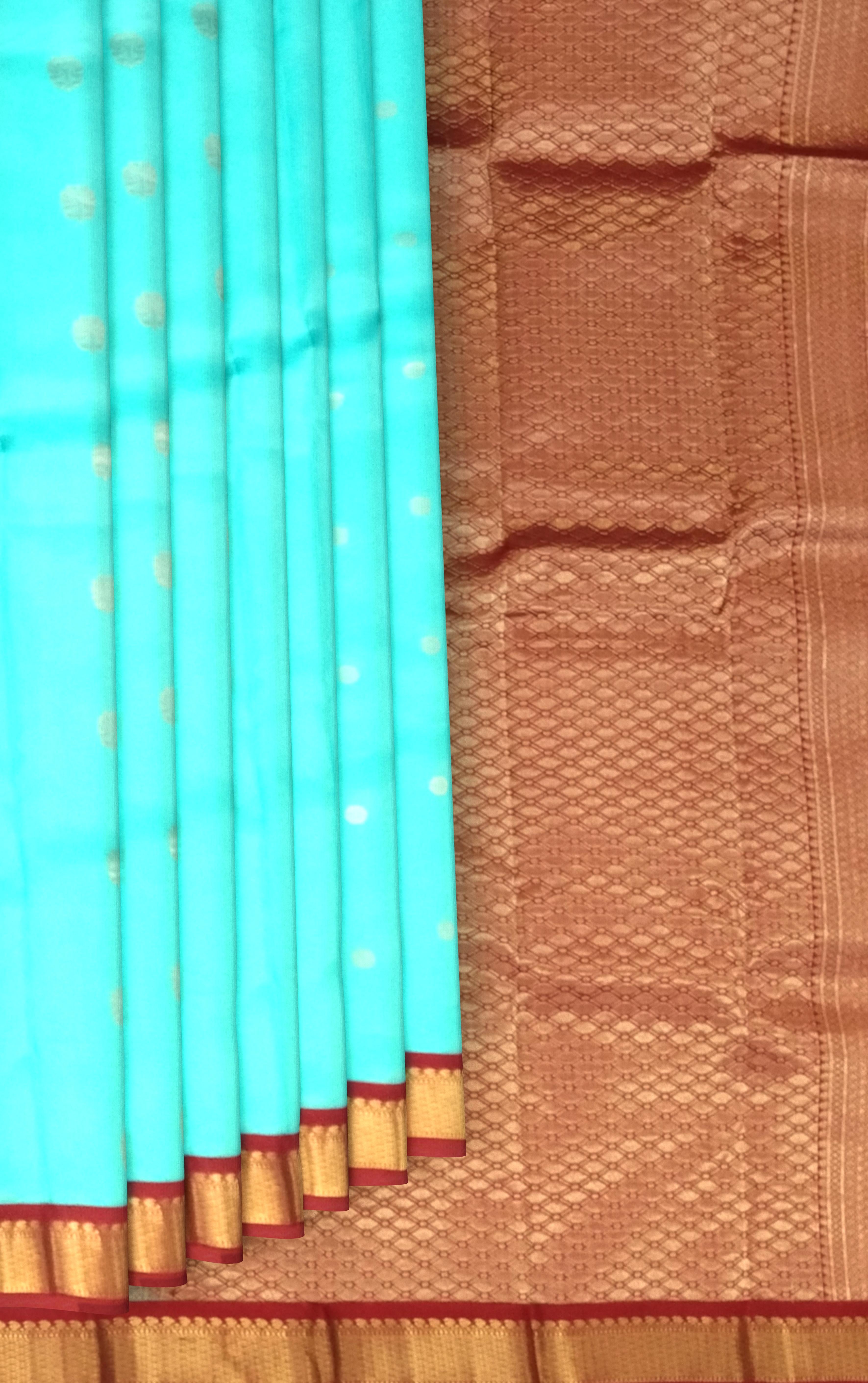 This Sky Blue Kanchipuram Silk Saree brings together serenity and vibrancy through its delicate small flower buttas and contrasting maroon border. The soft blue tone creates a soothing aura, while the rich maroon adds a regal depth to the ensemble. The combination of subtle pattern and lustrous silk makes this saree a true expression of grace. Woven with precision using pure mulberry silk, Kanchipuram sarees are treasured for their rich texture, sheen, and time-honored craftsmanship. Each saree embodies centuries of South Indian weaving tradition, representing heritage and artistry. Perfect for festive occasions, family functions, and social gatherings, this saree pairs beautifully with a maroon blouse. Enhance your look with gold jewellery and minimal makeup to exude effortless sophistication. Note: The appearance of the product’s colors may vary due to lighting conditions or your device’s screen calibration. For further assistance or additional images/videos, feel free to contact us at +91 97897 60367 or email at wecare@thesudeshiweaving.com.