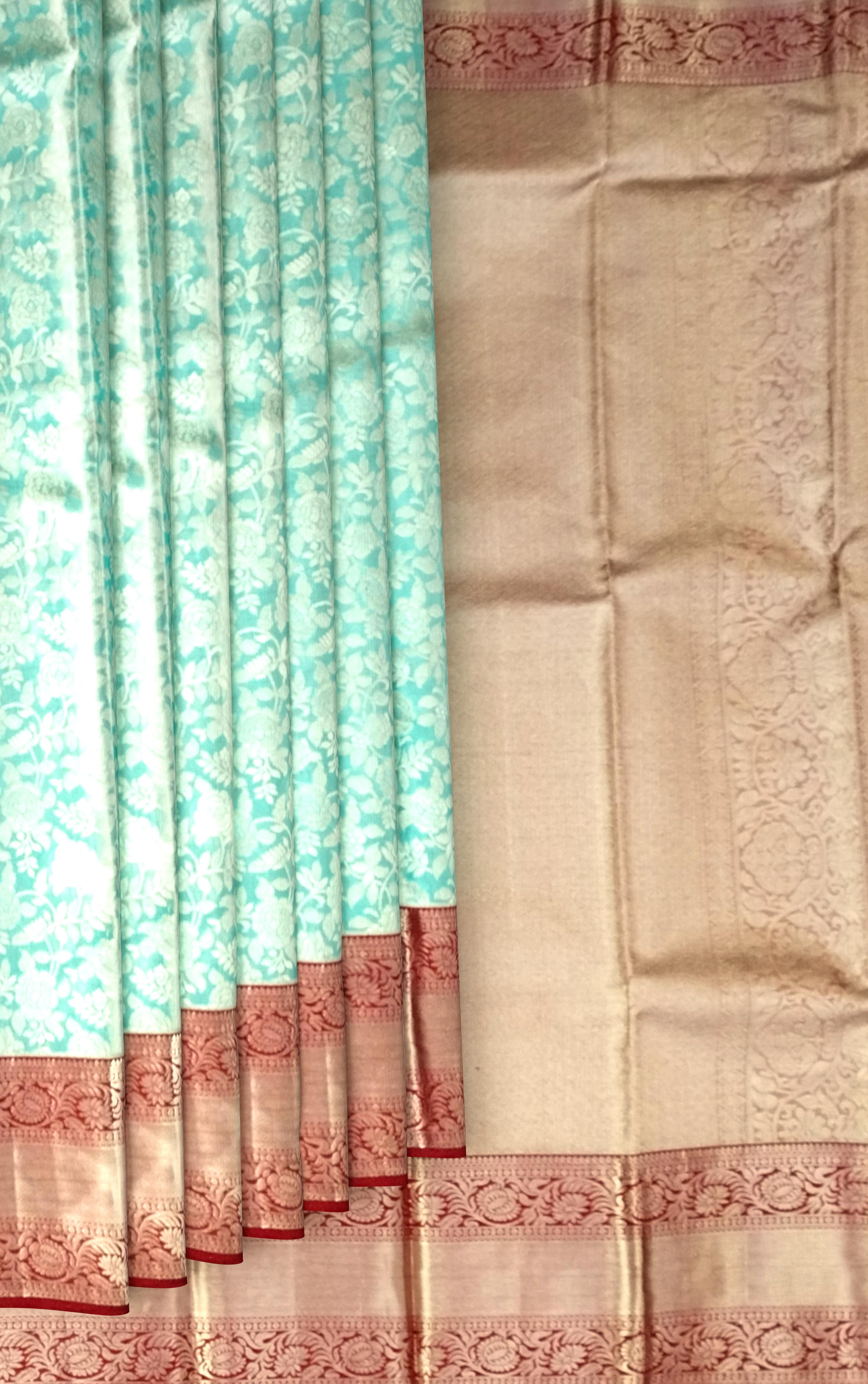A celestial blend of colors, this Sky Blue Kanchipuram Silk Saree with Floral Silver Zari Jacquard weaving evokes serenity and splendor. The maroon border and pallu bring contrast and depth, enhancing the luminous quality of the blue body. Silver zari threads glisten like starlight, turning this saree into a statement of timeless grace. Kanchipuram Pure Silk Sarees are among India’s most revered weaves — an embodiment of divine artistry and cultural pride. Each piece is woven with fine mulberry silk and metallic zari, inspired by ancient temple architecture and sacred motifs. The jacquard technique adds intricacy, texture, and a luxurious finish that stands the test of time. Perfect for festive evenings, family functions, or wedding events, this saree pairs beautifully with a maroon blouse and silver jewelry. Add a bindi and kohl-rimmed eyes to complete your graceful, goddess-like aura. Note: The appearance of the product’s colors may vary due to lighting conditions or your device’s screen calibration. For further assistance or additional images/videos, feel free to contact us at +91 97897 60367 or email at wecare@thesudeshiweaving.com.