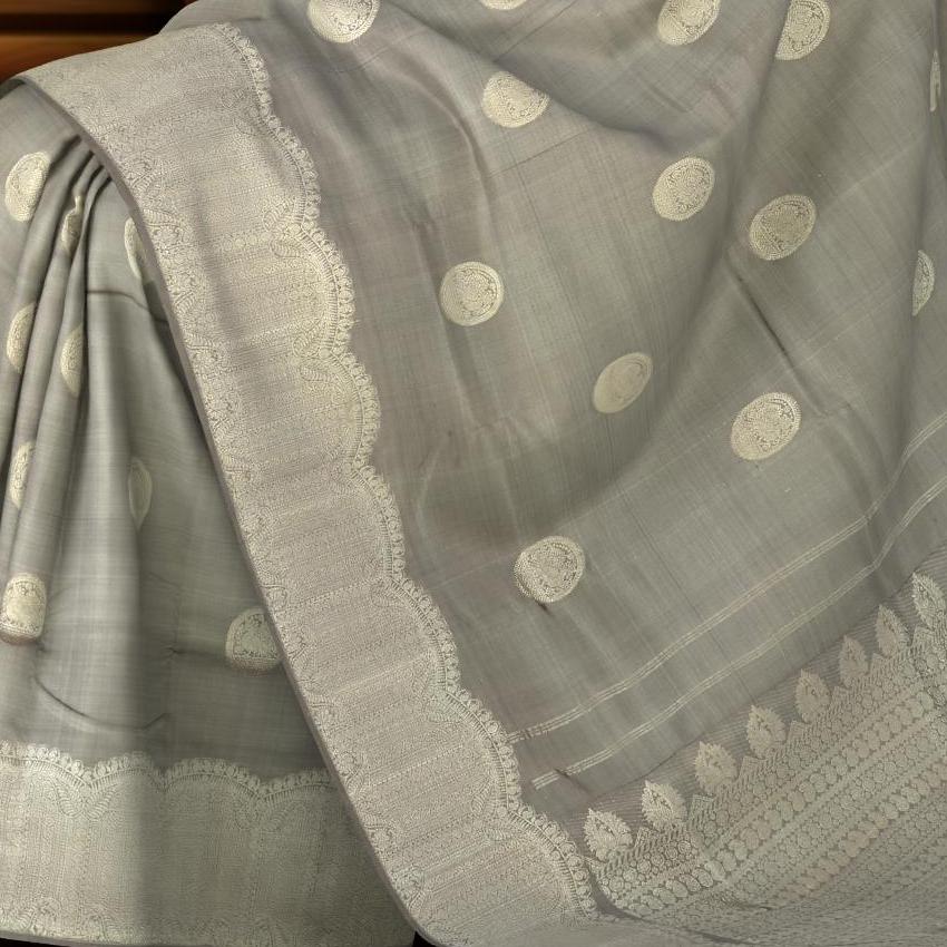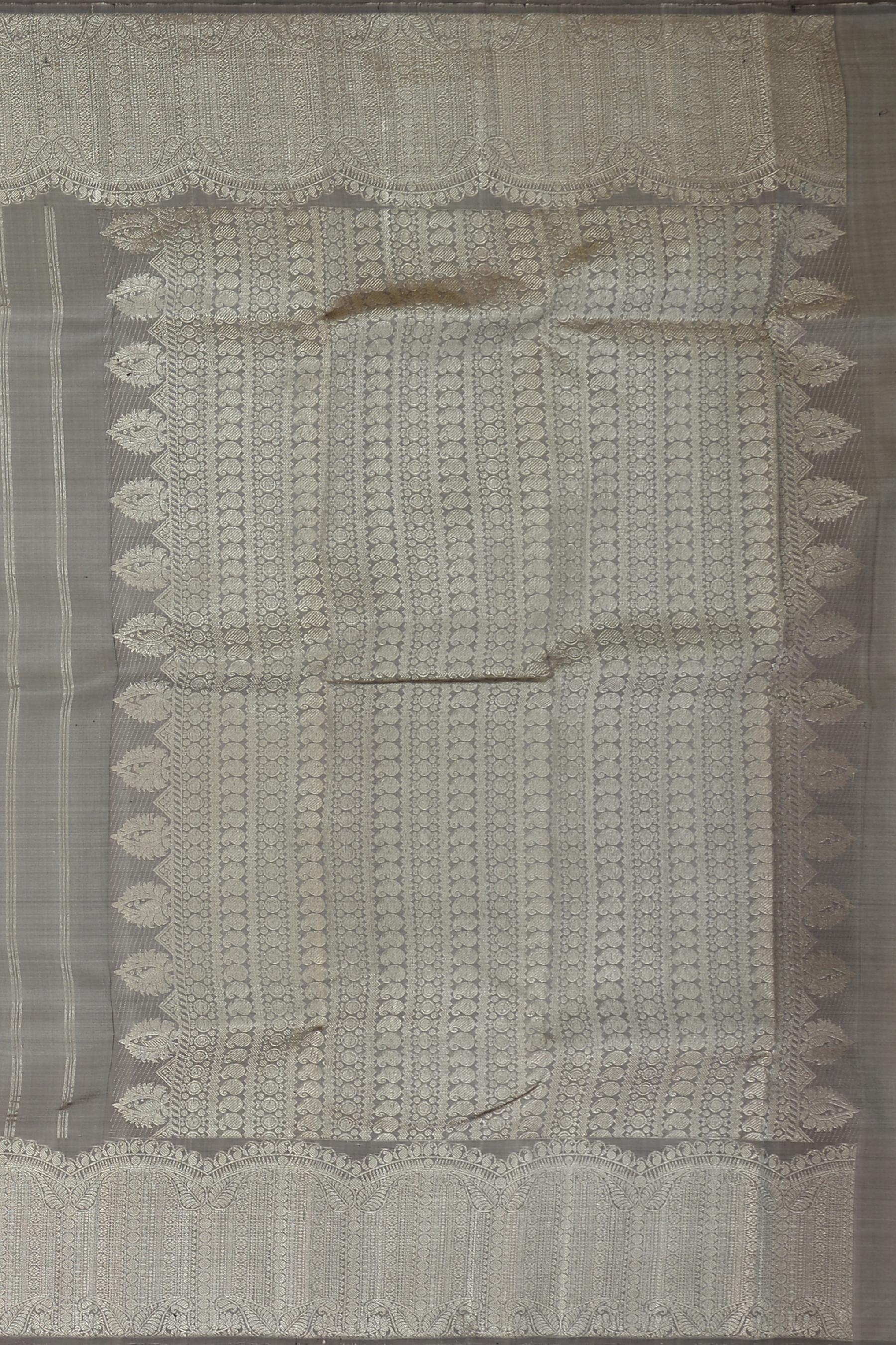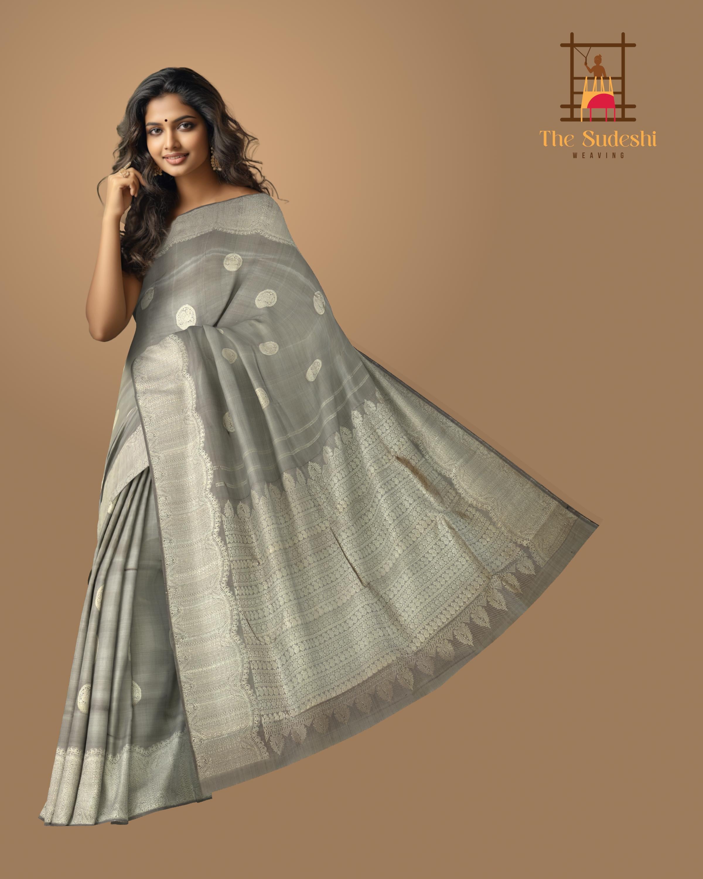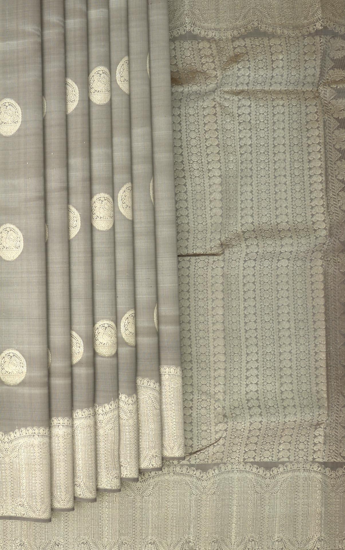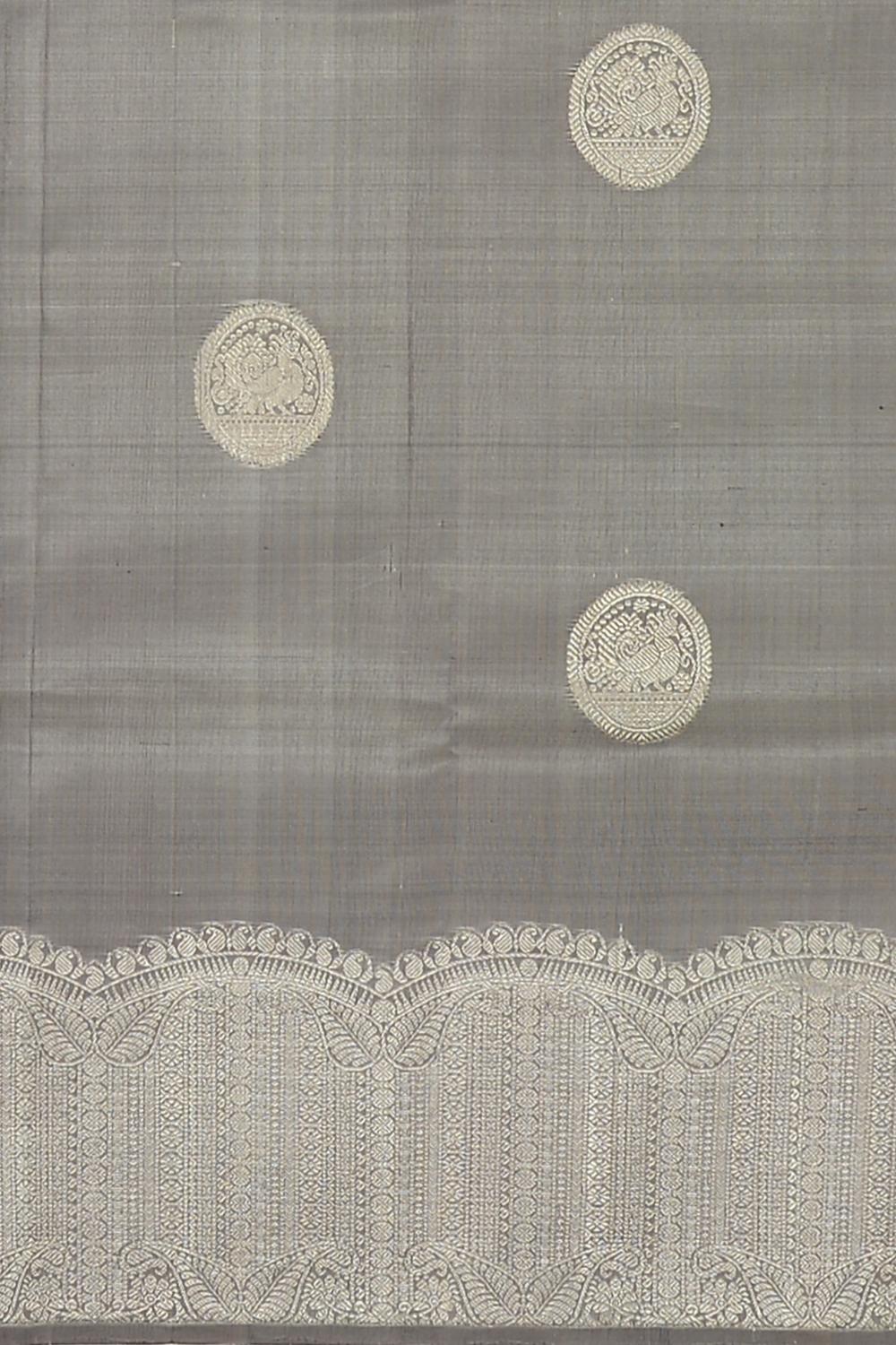 The steel grey Kancheevaram silk saree stands as a monument to understated elegance. With a body featuring plain weave adorned with butta and silver zari, including Chakram with Annam design, this saree reflects a minimalist aesthetic that resonates with sophistication and grace.