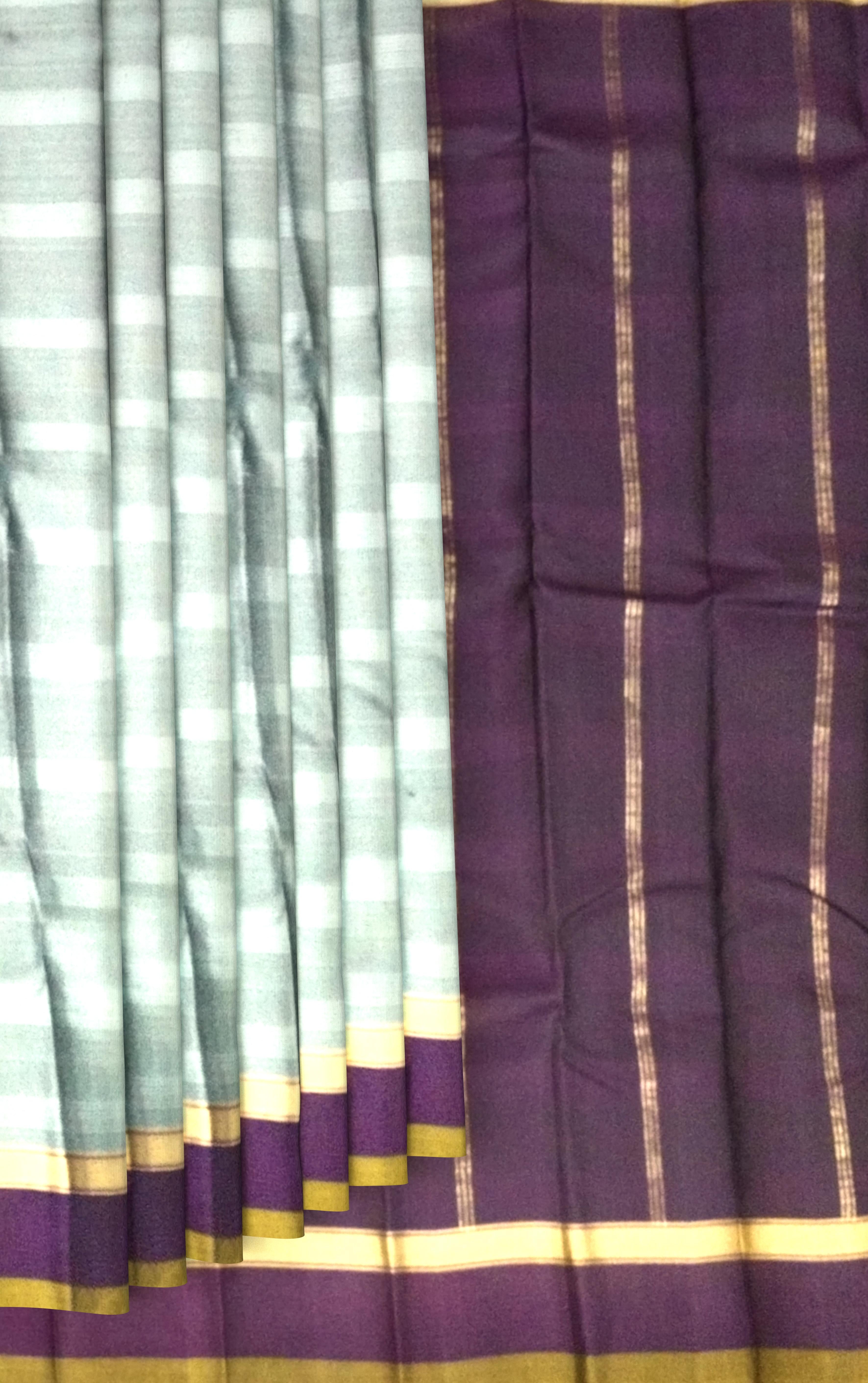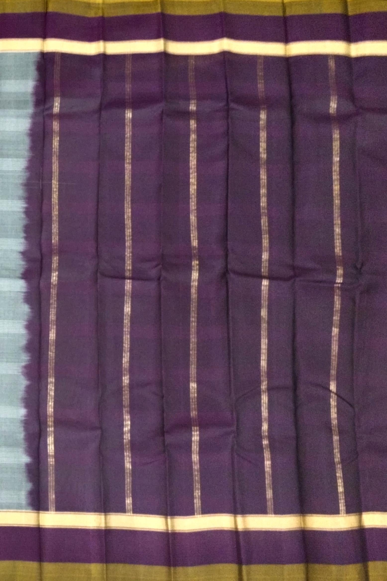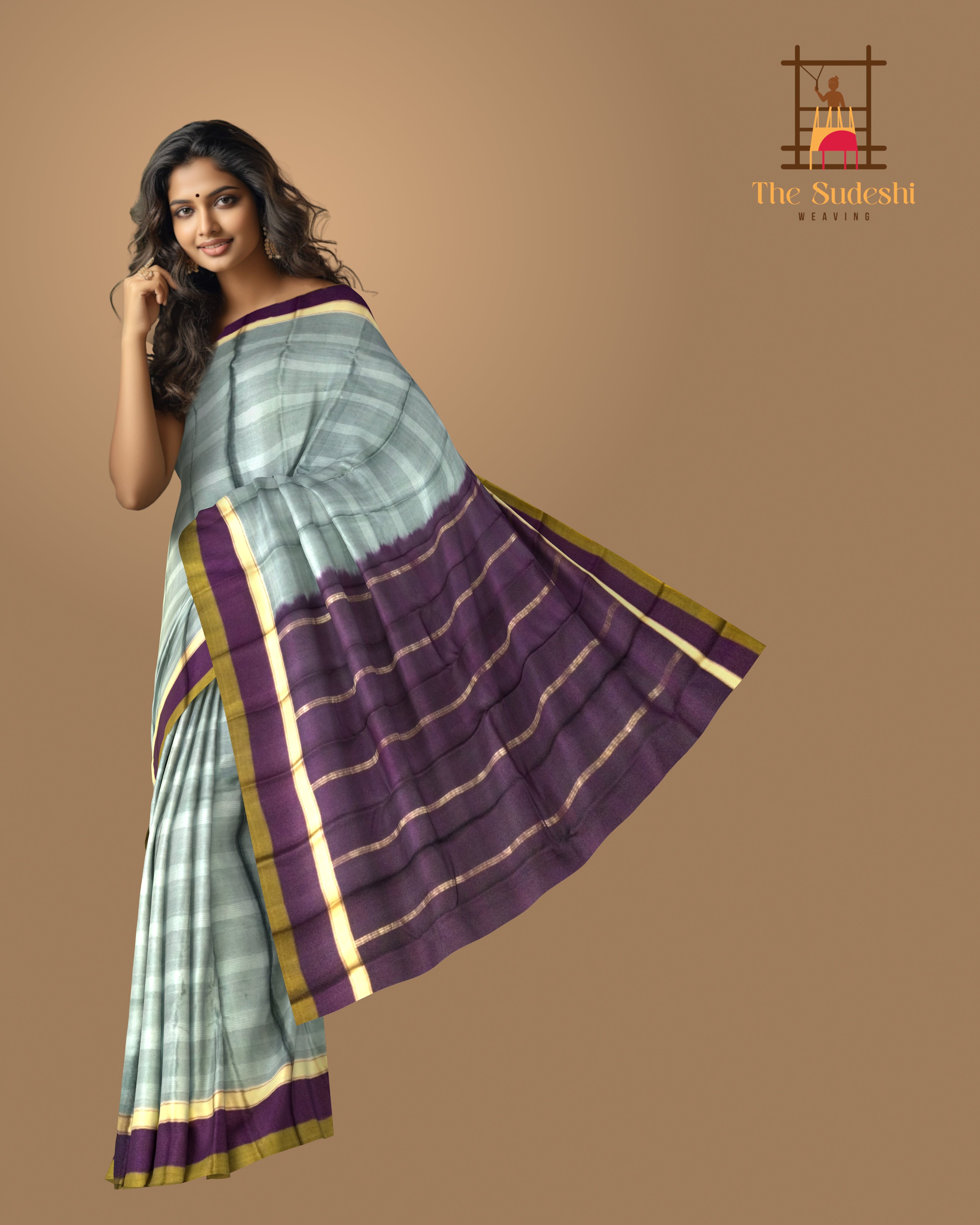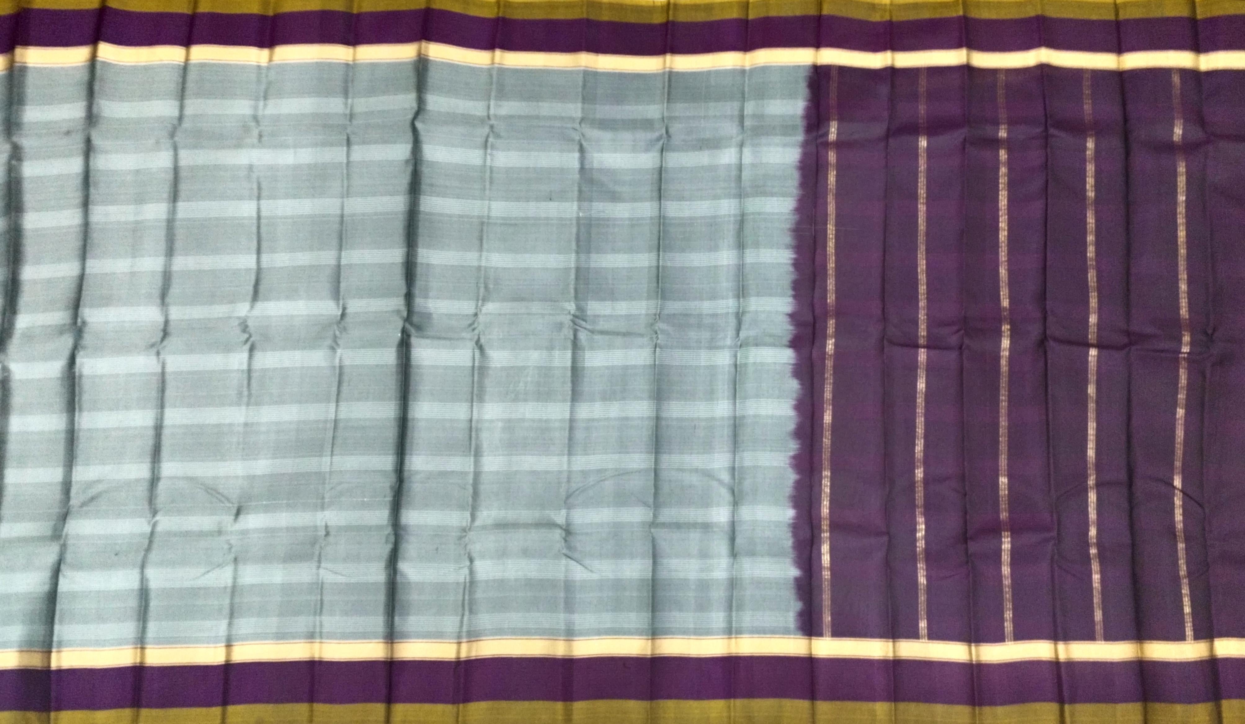 Sophisticated and modern, this Steel Grey Kanchipuram Silk Saree showcases a plum and olive green border and pallu, creating a refined dual-tone effect. The plain silk body glows with a silvery sheen, making the contrasting colors stand out beautifully. It’s a perfect balance of contemporary aesthetics and traditional craftsmanship. Kanchipuram pure silk sarees are prized for their exceptional weaving technique, lustrous texture, and timeless charm. Crafted by artisans using age-old methods, each saree carries forward the grandeur of South Indian textile artistry. Ideal for formal functions, cultural events, or festive gatherings, this saree pairs well with a plum or olive green blouse. Enhance your look with antique jewellery and elegant heels for a graceful and poised appearance. Note: The appearance of the product’s colors may vary due to lighting conditions or your device’s screen calibration. For further assistance or additional images/videos, feel free to contact us at +91 97897 60367 or email at wecare@thesudeshiweaving.com.
