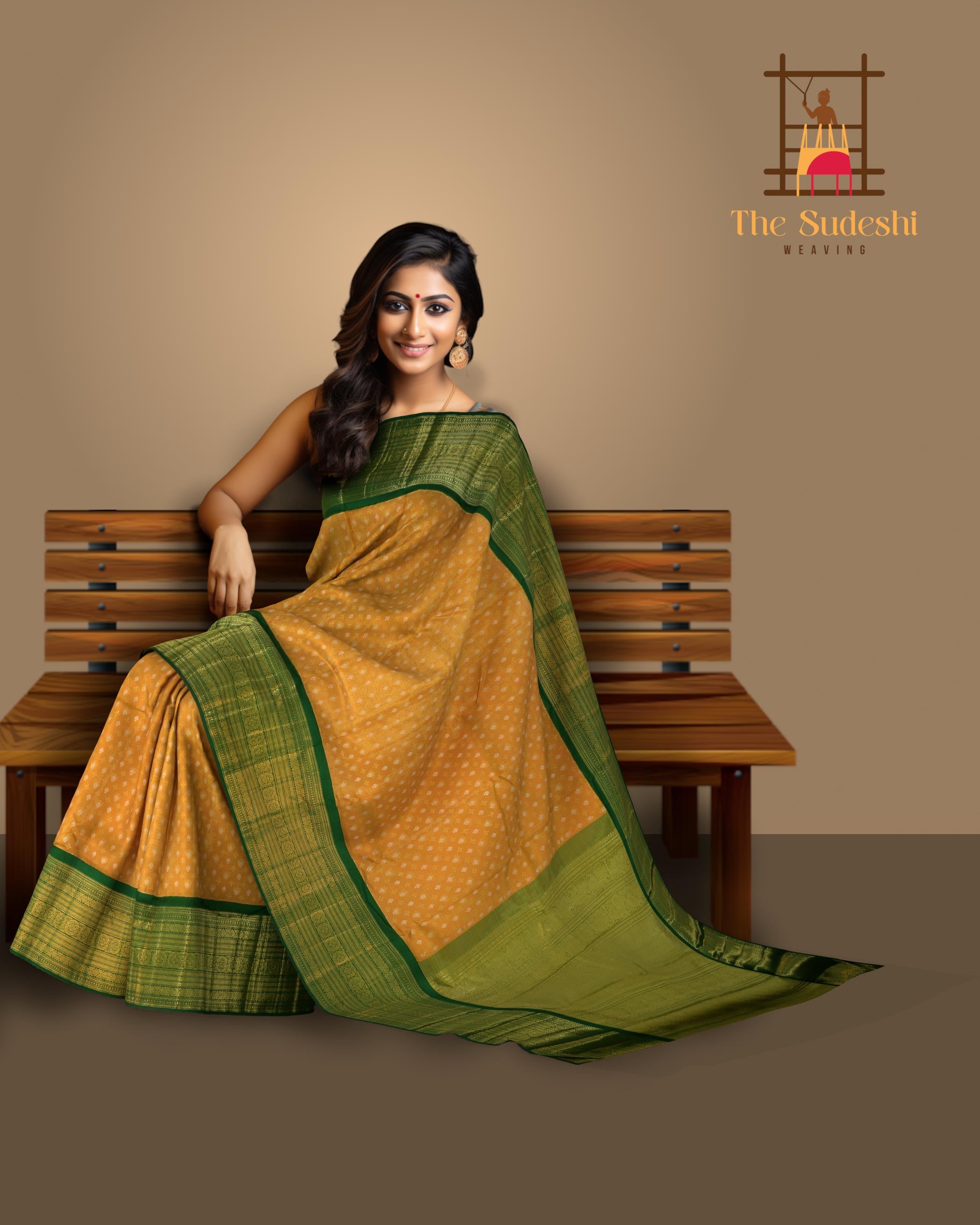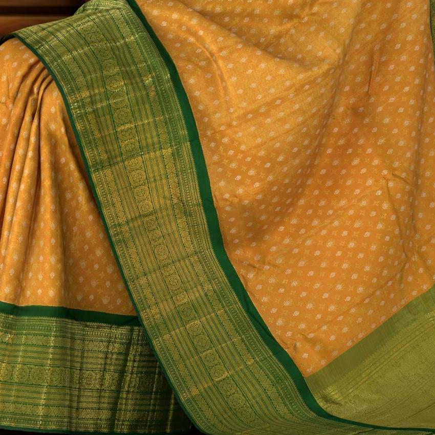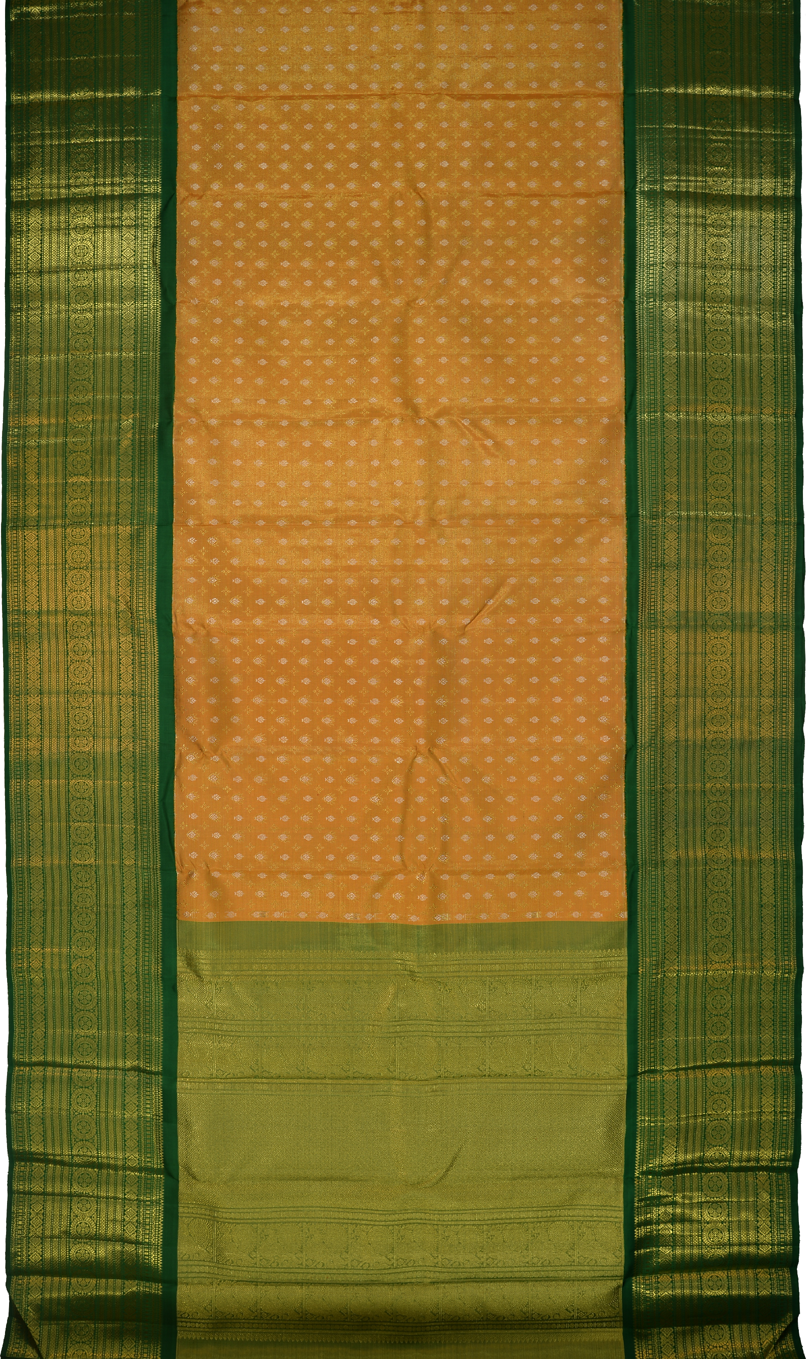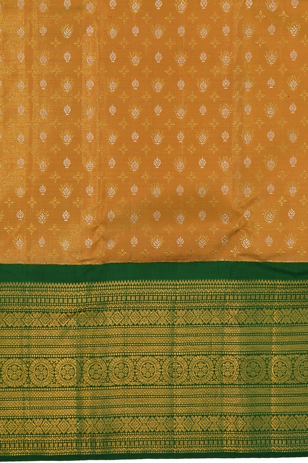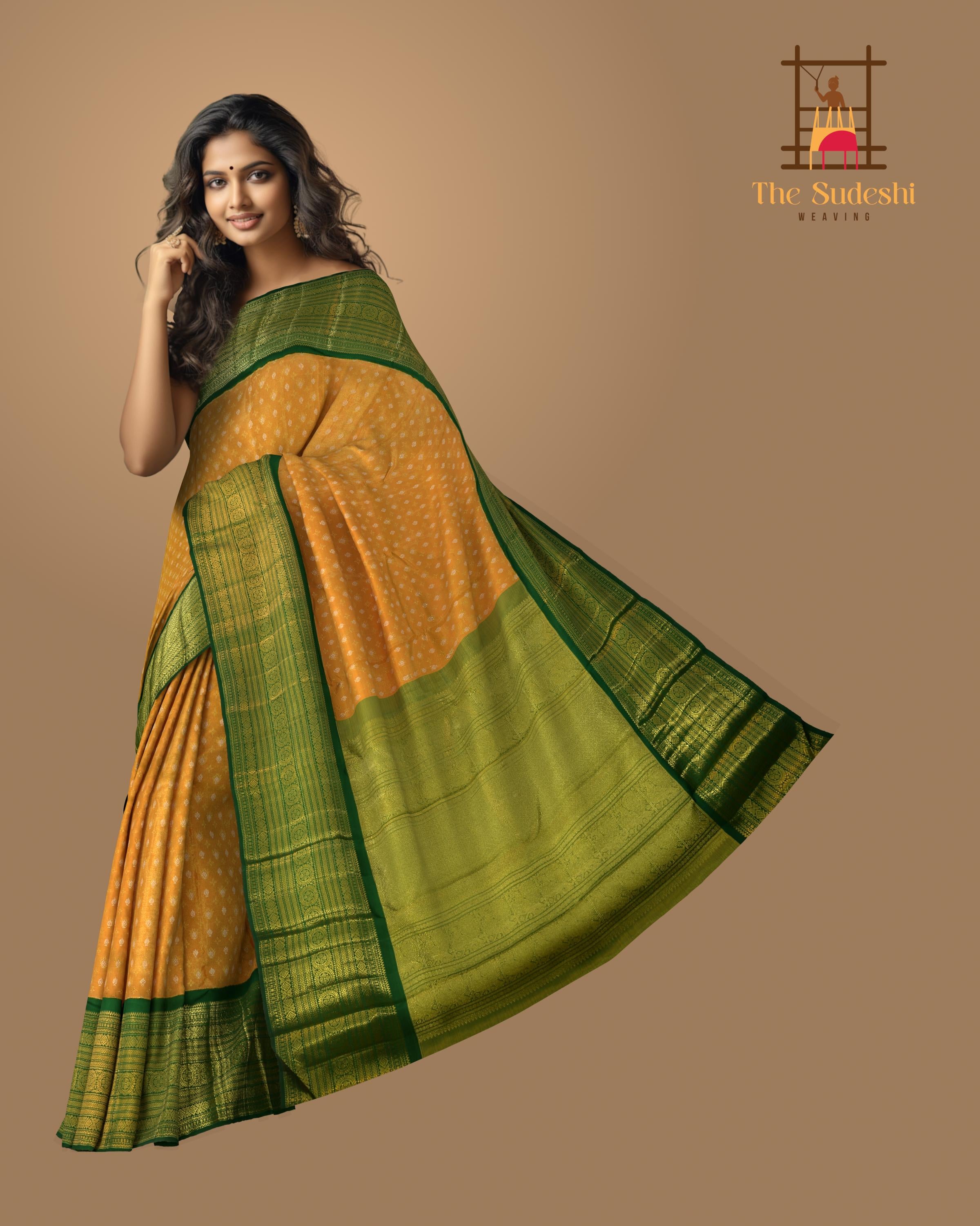 The body, adorned with intricate silver and gold butta designs, is a testament to skilled hands and age-old traditions. The transition to the leaf green border and pallu, decorated with Gatti and Varusai pet designs, brings forth tales of lush forests and nature's wonders.
