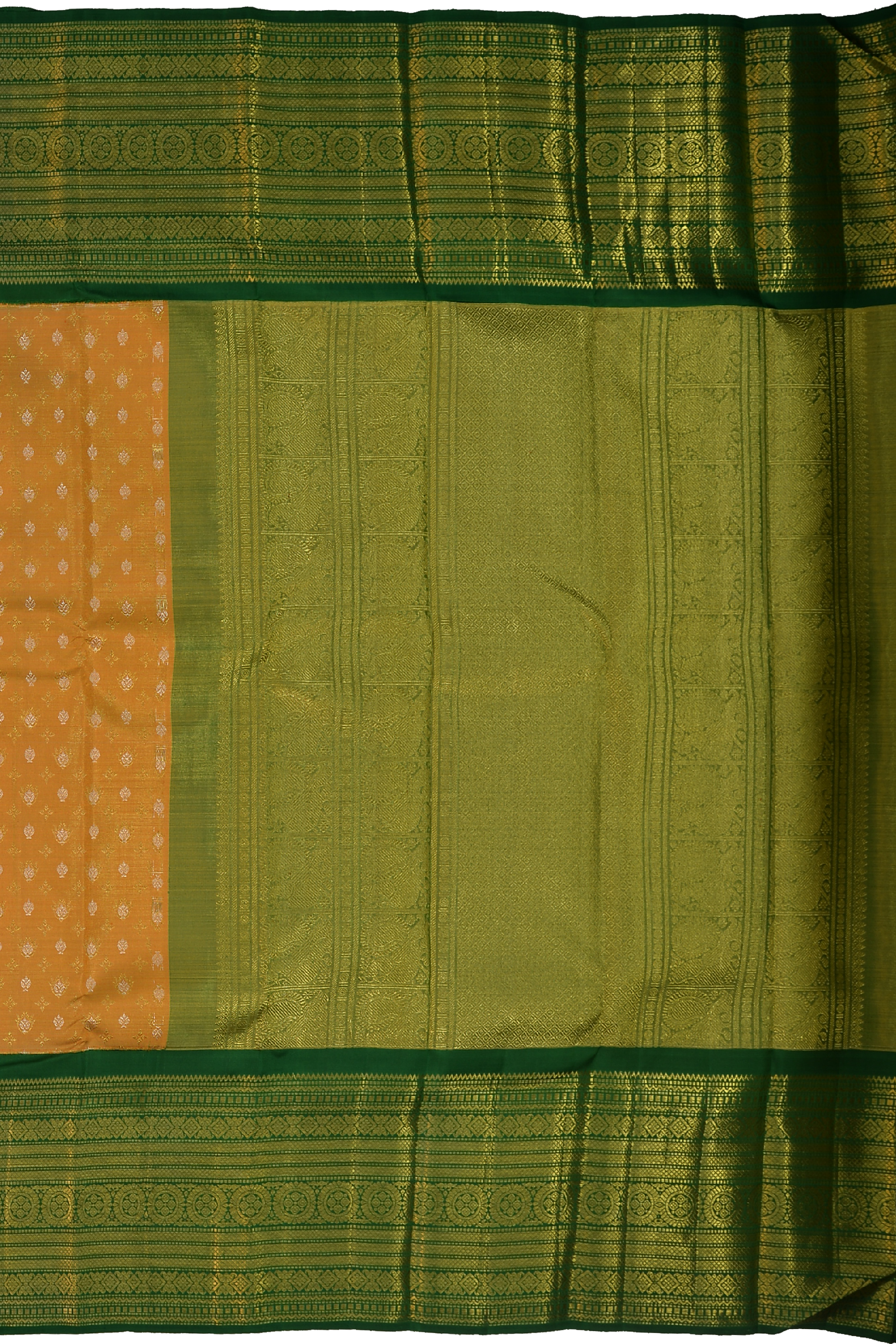 Embrace the warm embrace of dawn with this radiant light orange Kanchipuram silk saree. Every inch is a tapestry of the golden hour, where the world stands still, bathed in a soft, glowing light.