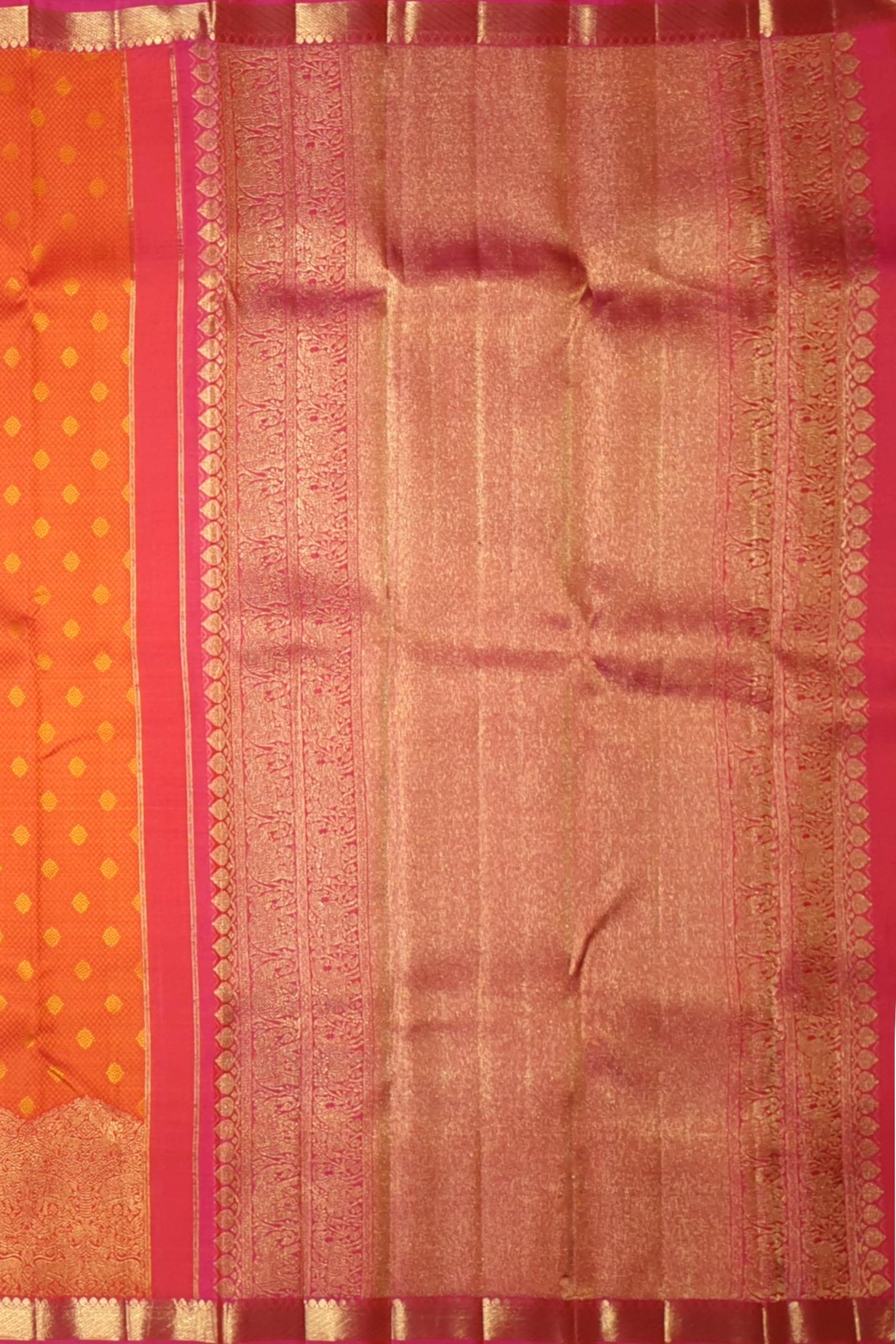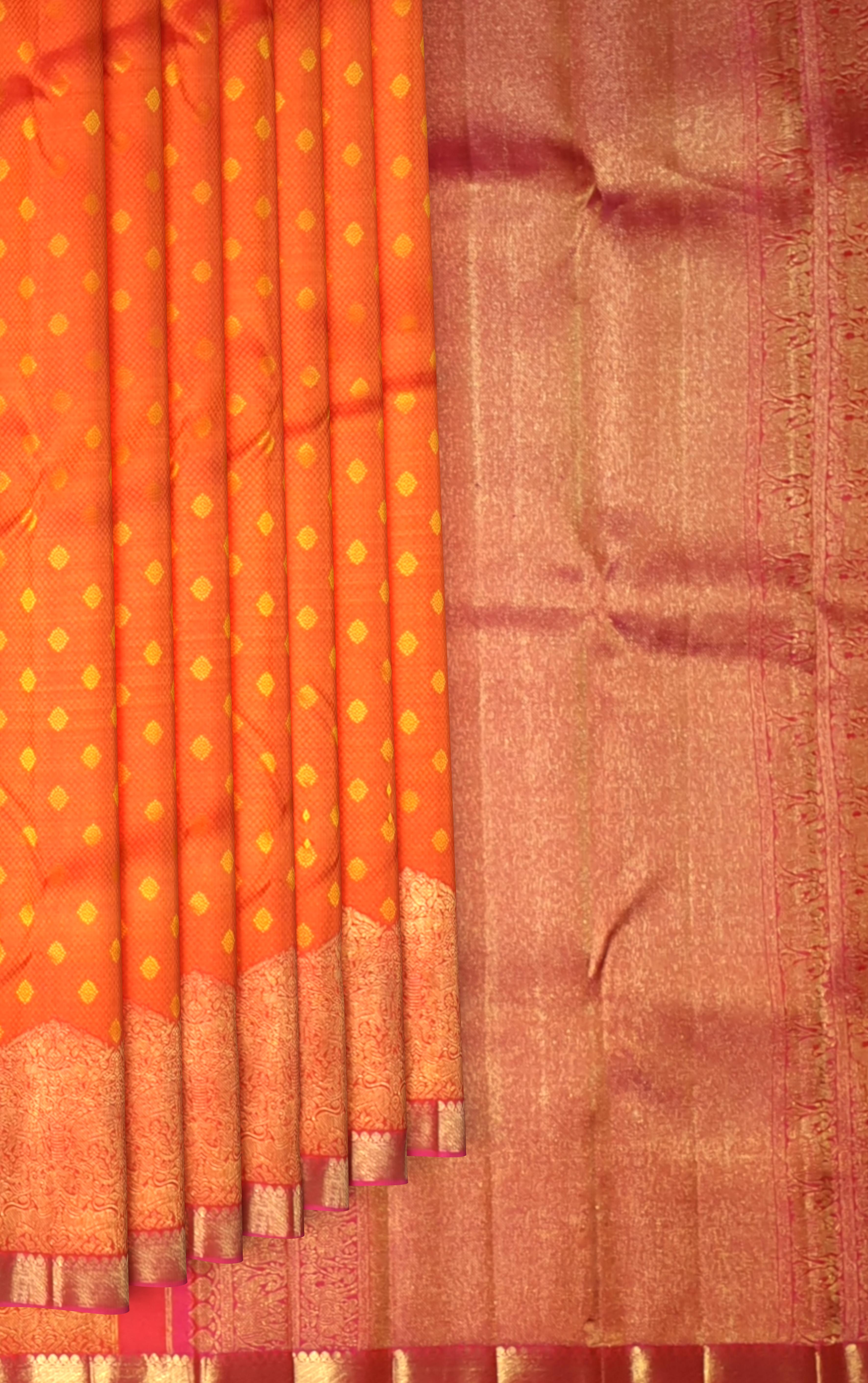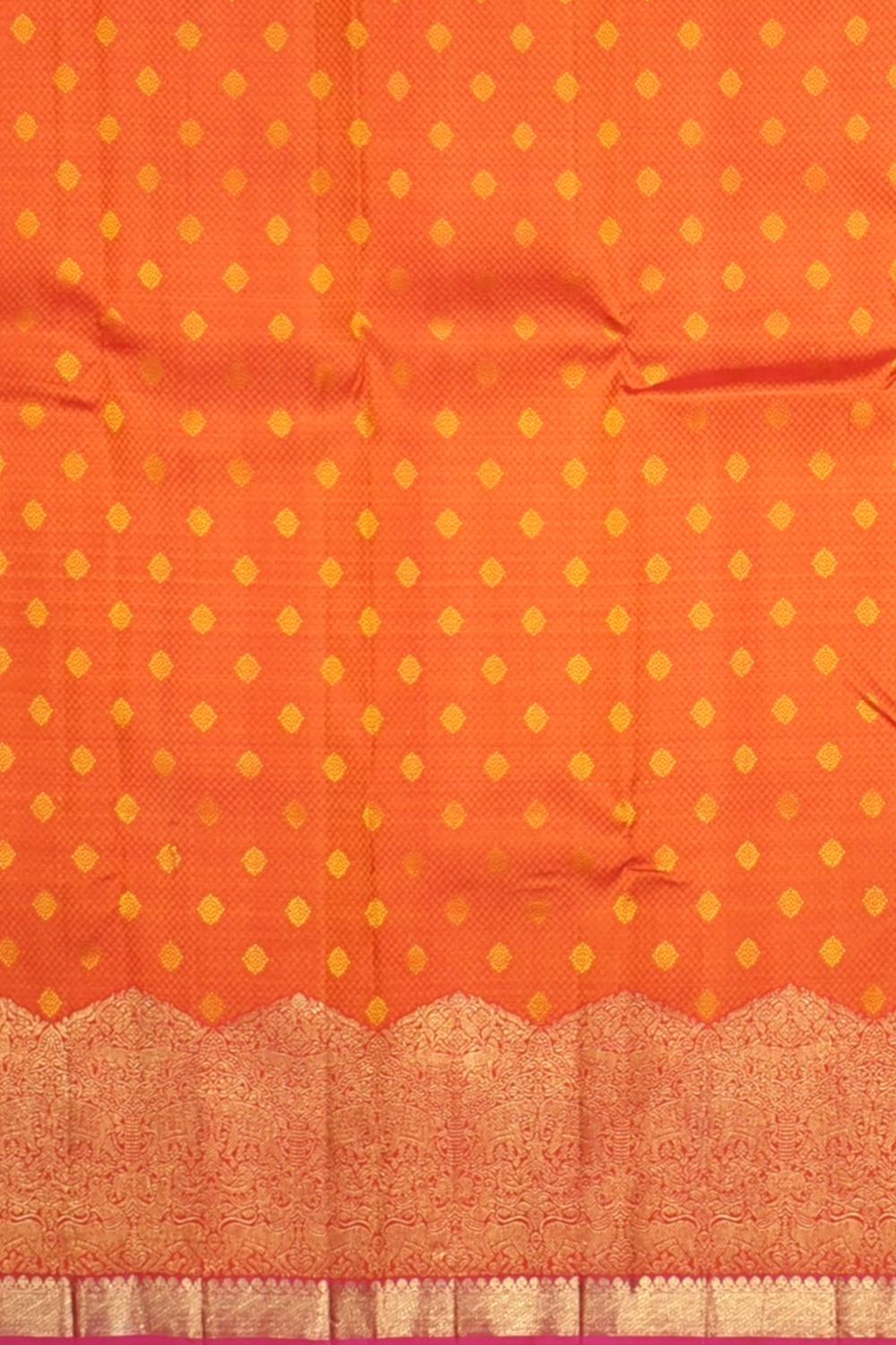 This radiant sunset orange Kanchipuram silk saree is a celebration of color and craftsmanship. Adorned with delicate bhutta motifs spread across the body, each design adds texture and subtle sparkle to the glowing silk. The wave-patterned border in a gentle coral pink adds a rhythmic elegance, echoing the graceful movement of traditional South Indian motifs. A matching coral pink pallu and blouse complete this harmonious look, making it a saree that’s both soothing and striking.