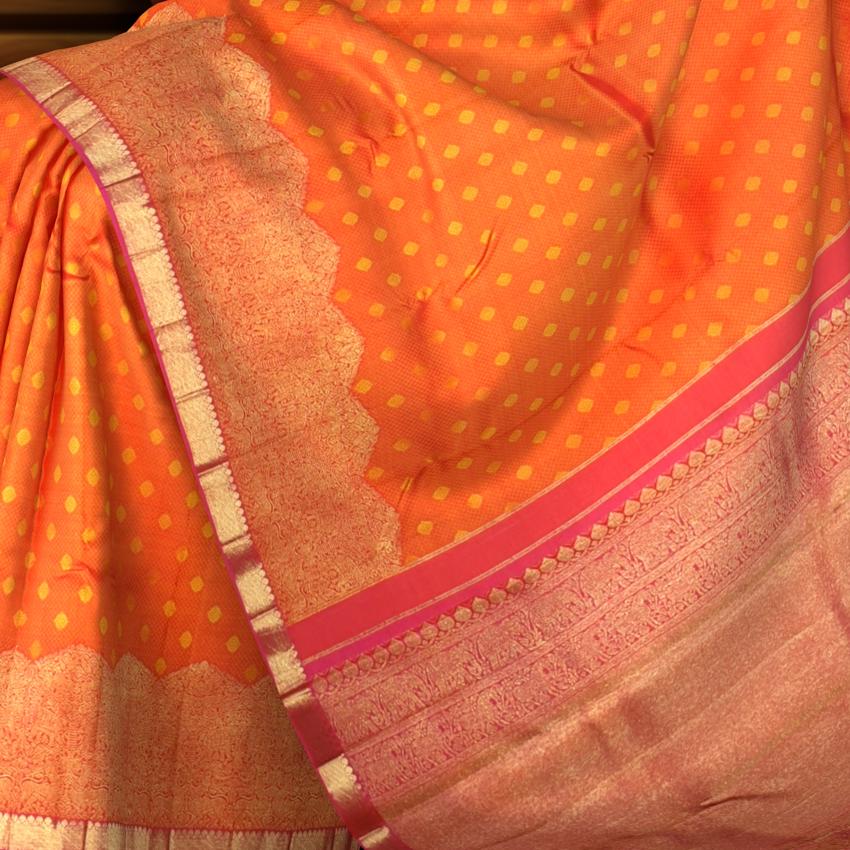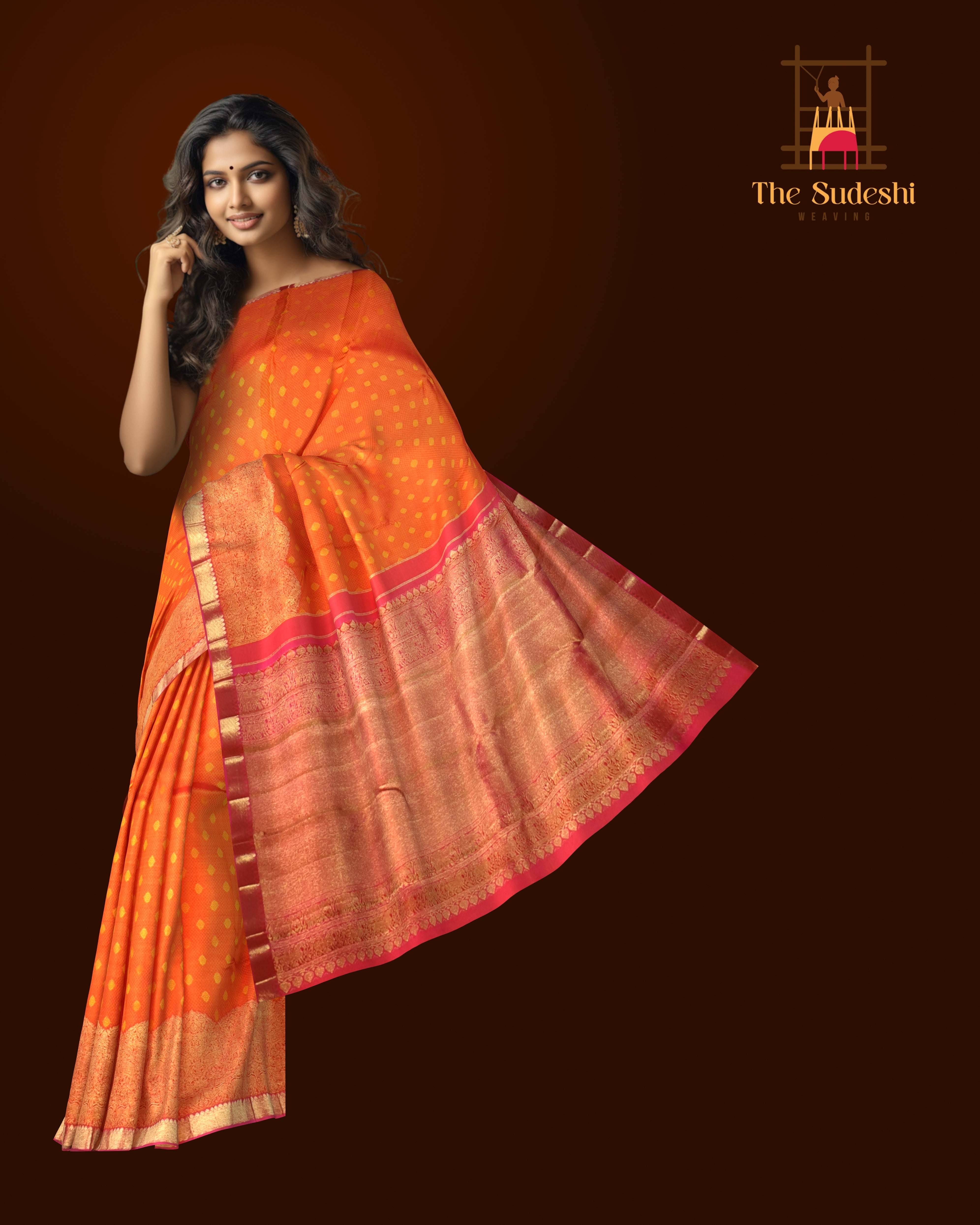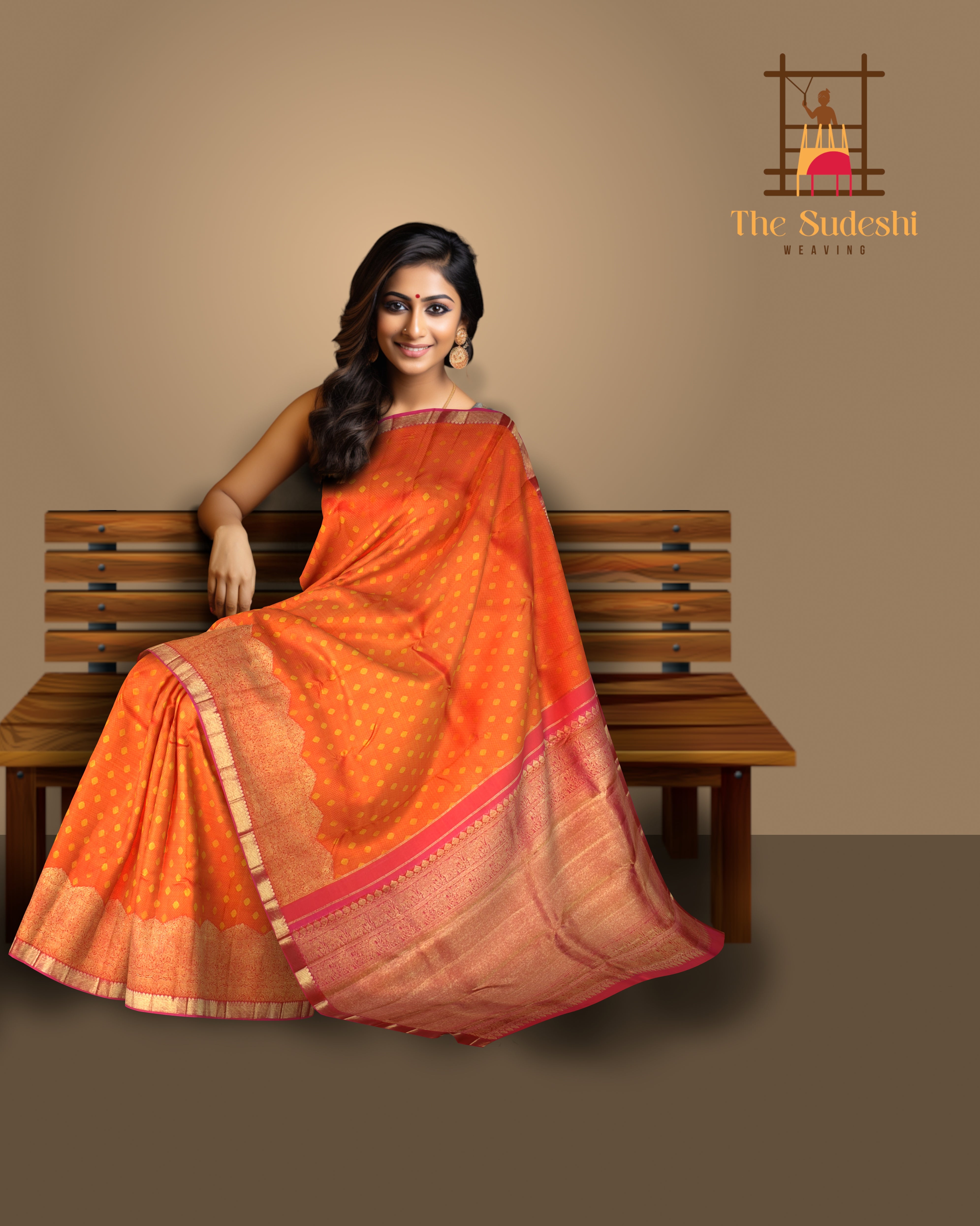 This radiant sunset orange Kanchipuram silk saree is a celebration of color and craftsmanship. Adorned with delicate bhutta motifs spread across the body, each design adds texture and subtle sparkle to the glowing silk. The wave-patterned border in a gentle coral pink adds a rhythmic elegance, echoing the graceful movement of traditional South Indian motifs. A matching coral pink pallu and blouse complete this harmonious look, making it a saree that’s both soothing and striking.