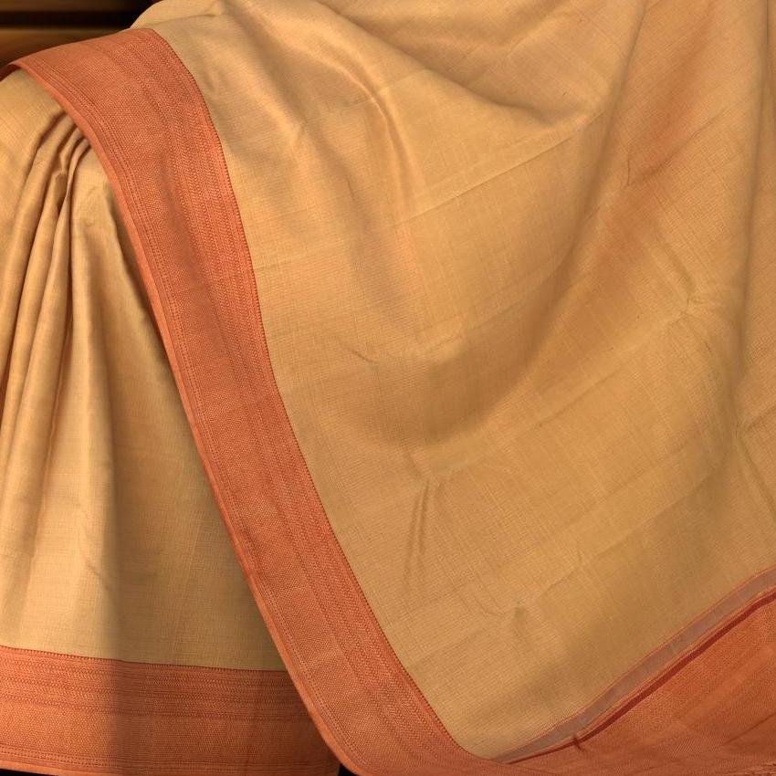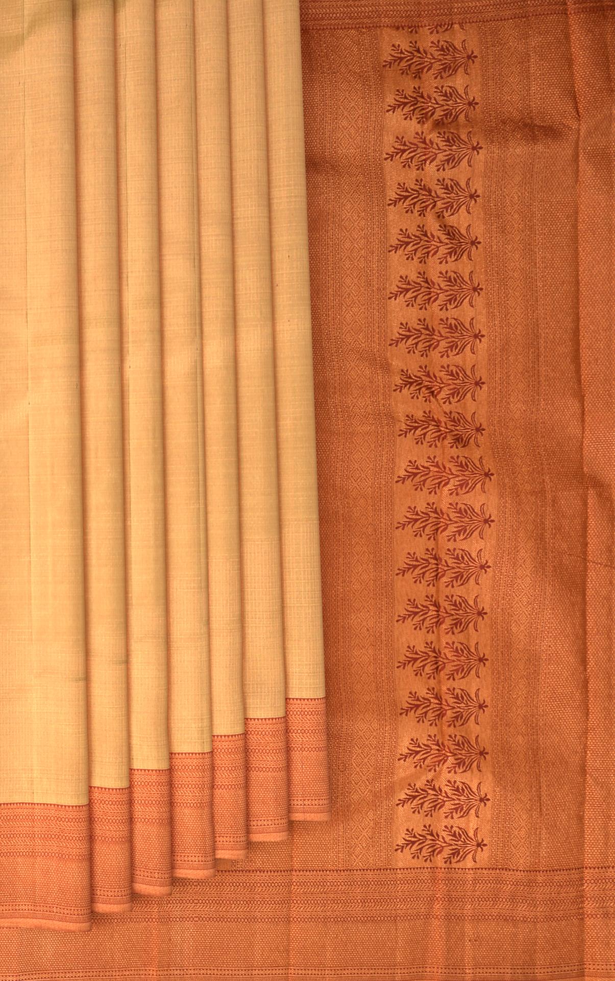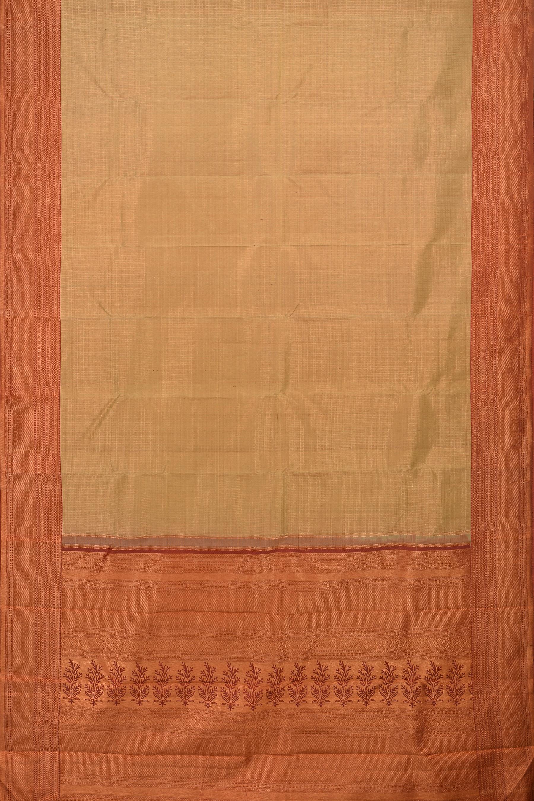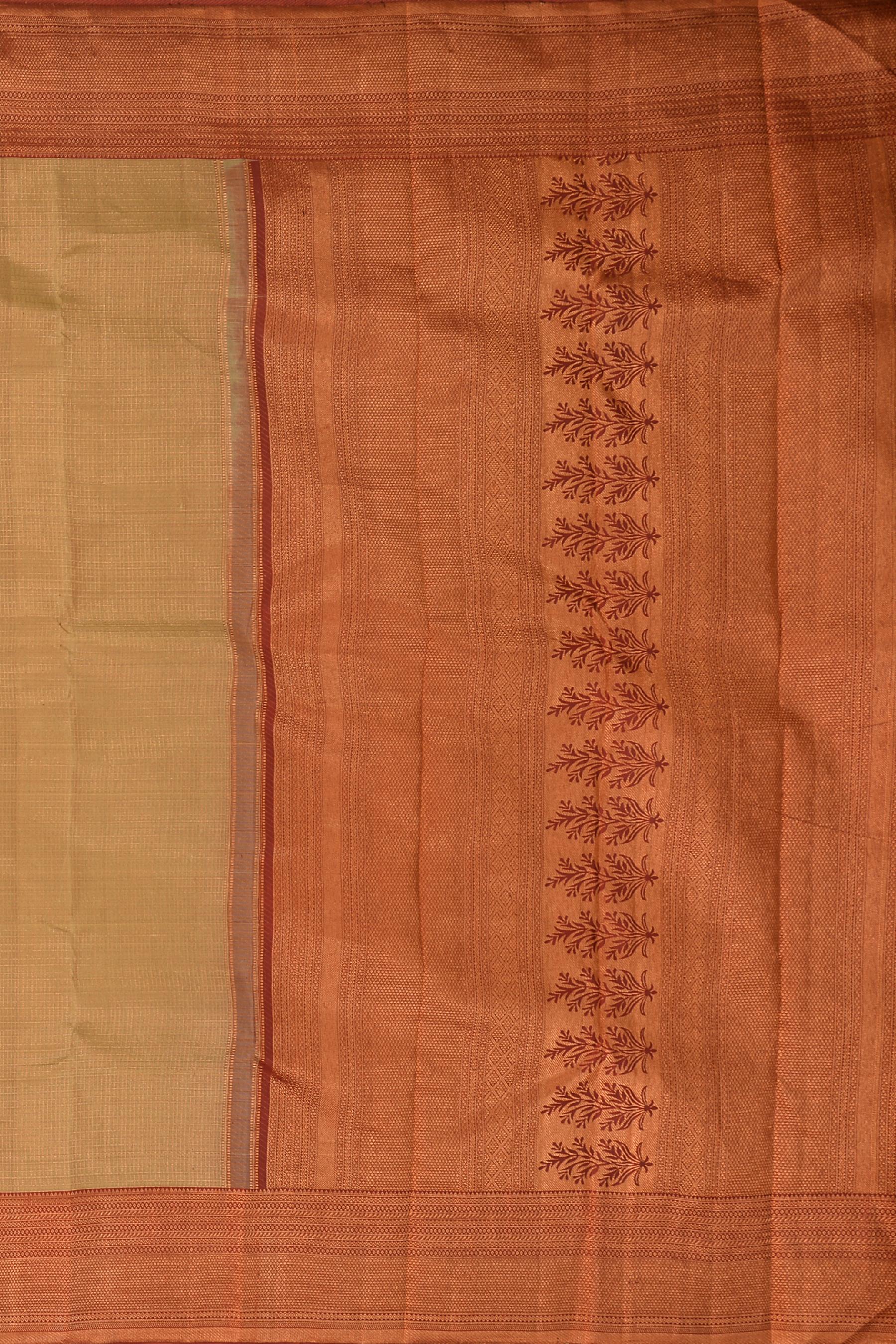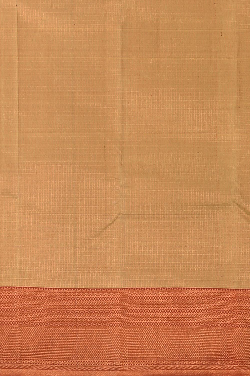 Step into a world where tradition is woven with threads of contemporary elegance with this beige Kanchipuram silk saree. Featuring fine Kota checks and a sumptuous contrast rust brown border, this piece is accentuated with the glow of copper zari. The pallu, grand in its intricacy, weaves a story of the artisan's finesse with copper zari, making this saree a testament to the splendor of Indian heritage.