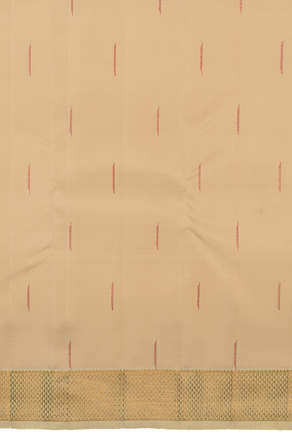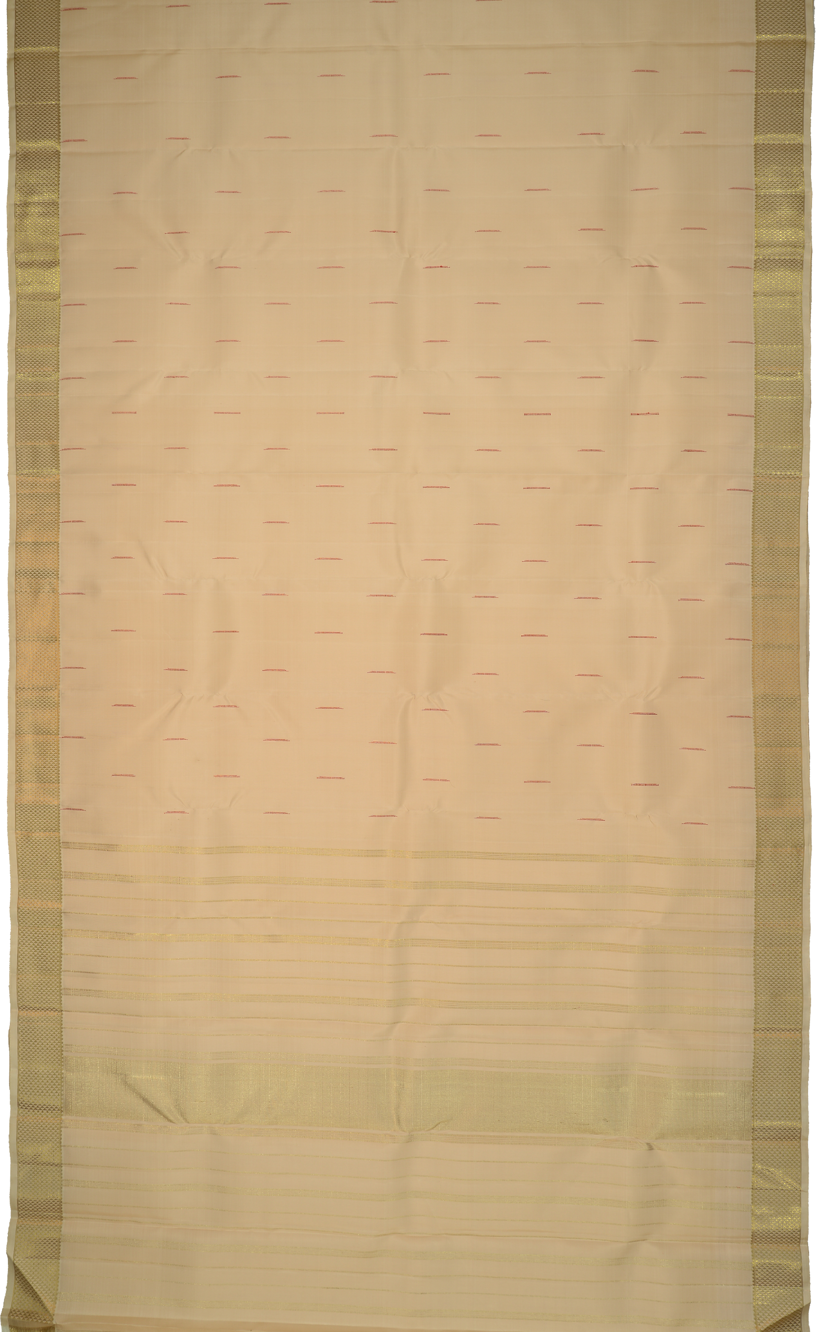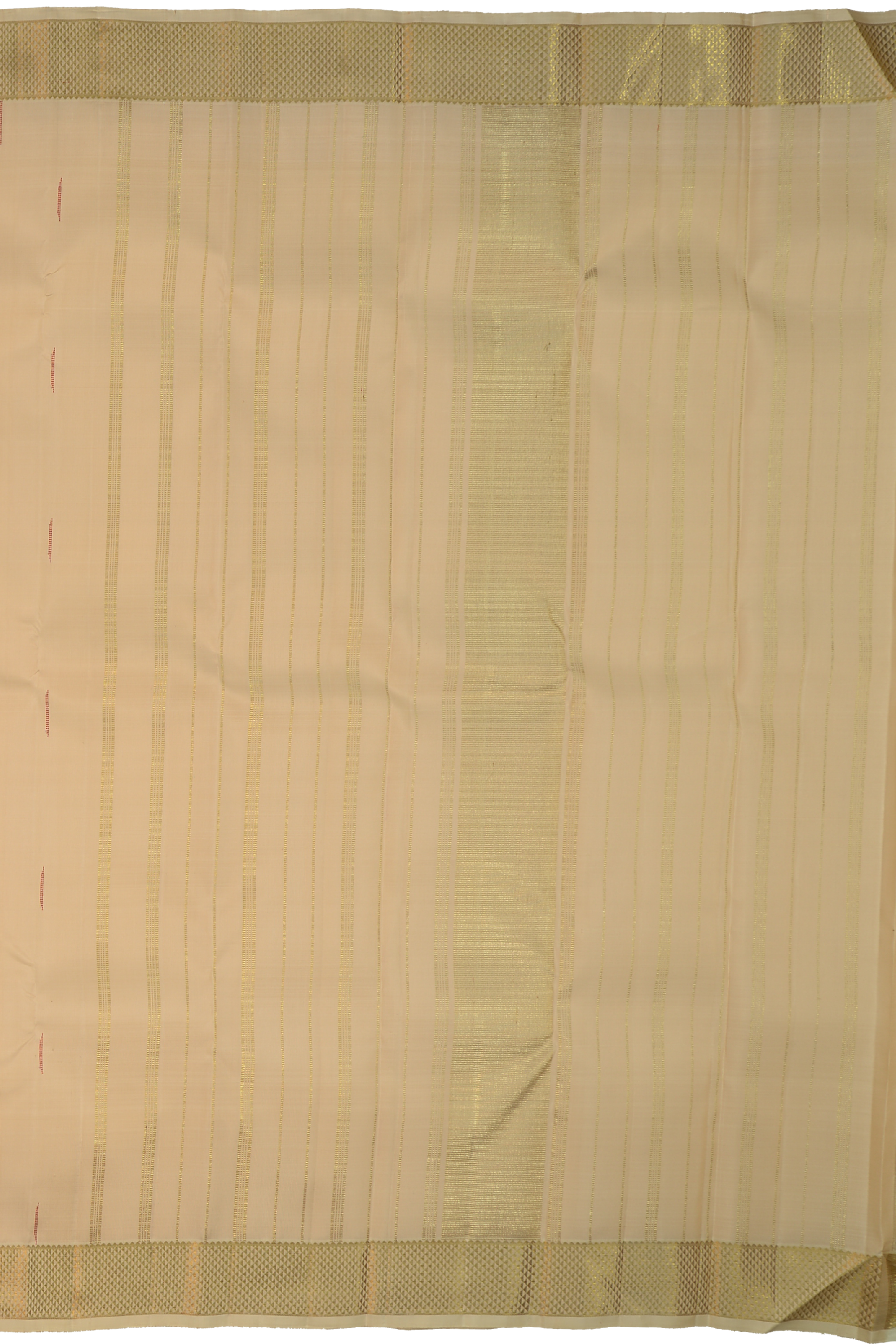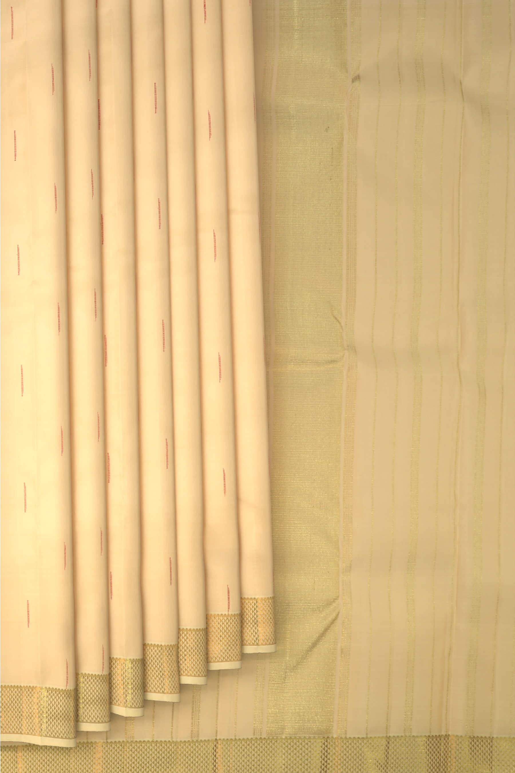 The self-border holds within its folds the rain drop butta in red, leading to a harmonious Gatti Border and the iconic Mayil Kann design. The pallu mirrors the saree's story, its Seer Mundhi pattern a testament to timeless elegance and meticulous detailing.
