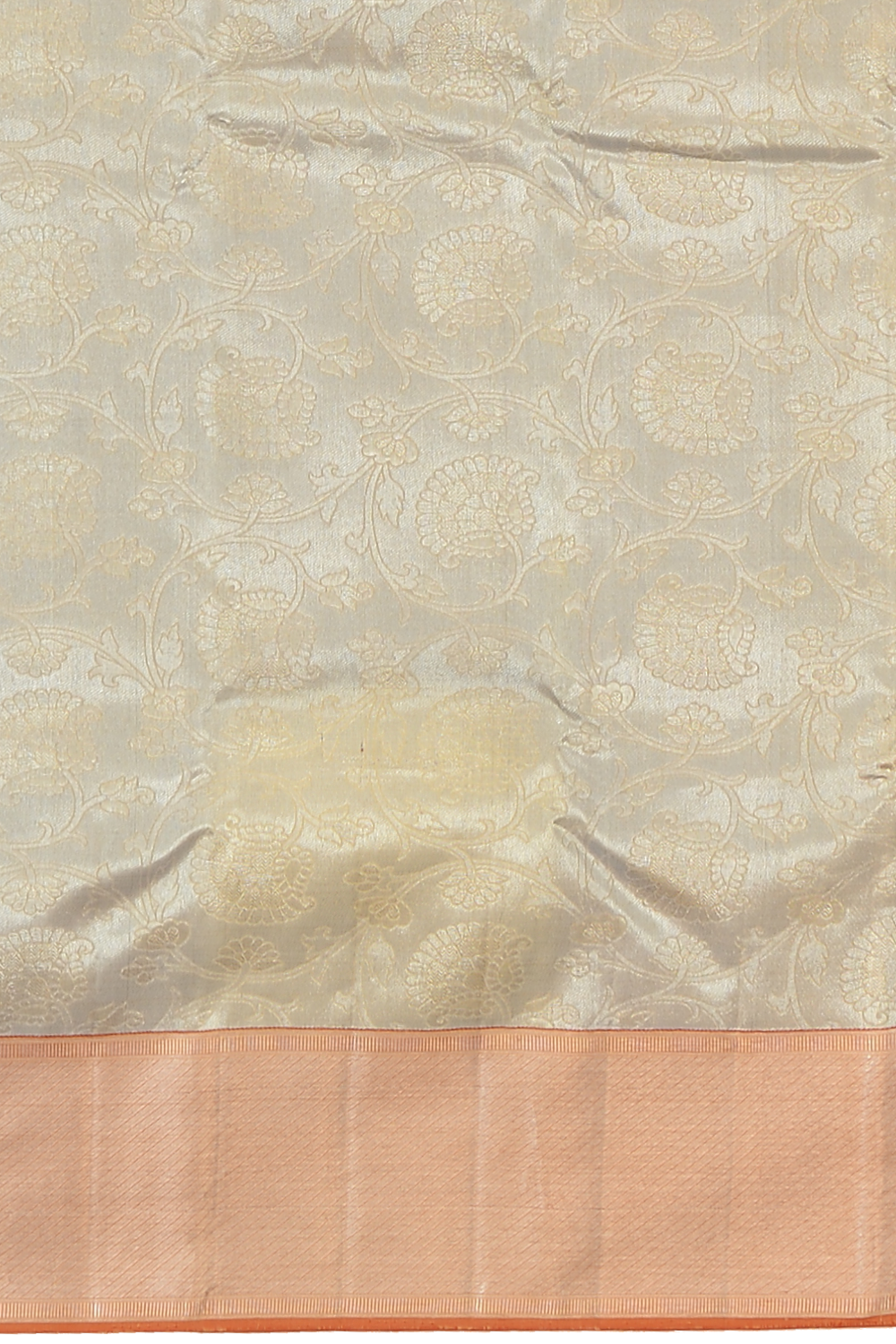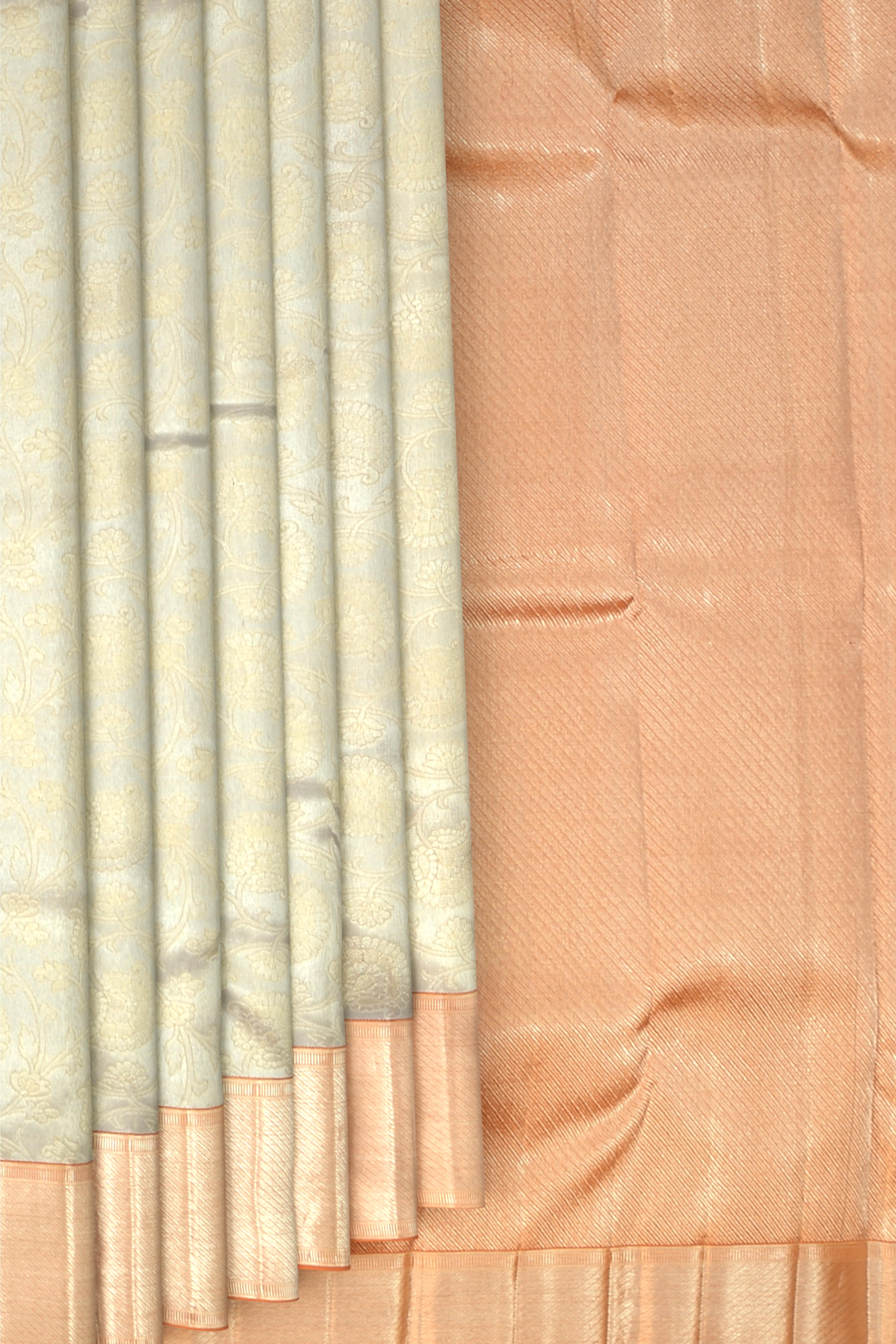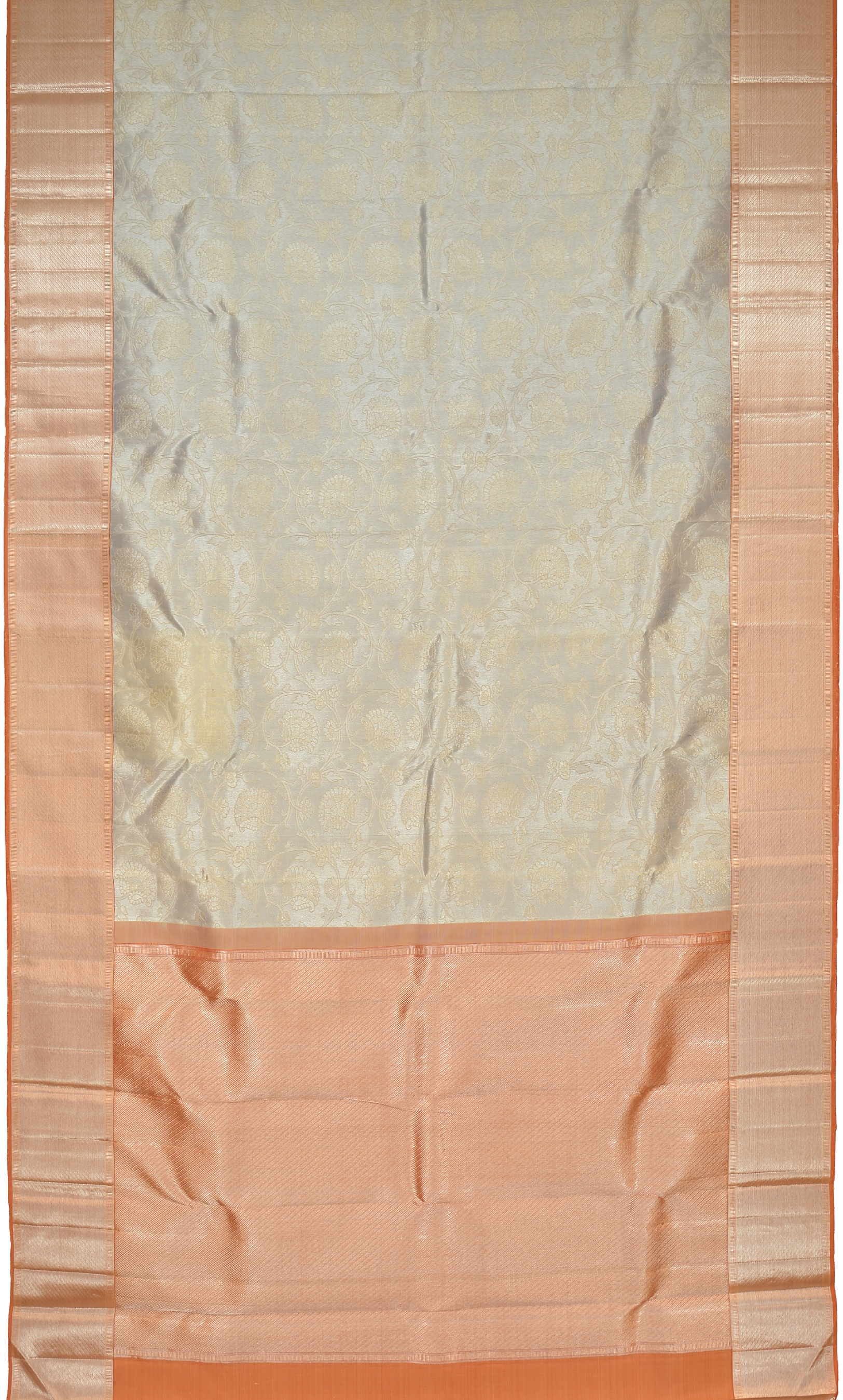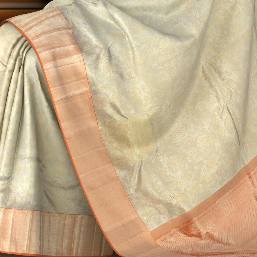 Bask in the luminescence of this finely crafted Kanchipuram silk saree. The soft gray, combined with the silver tissue fabric, paints a picture of moonlit nights and silver streams. The saree is a harmonious blend of the old and the new, symbolizing timeless beauty.