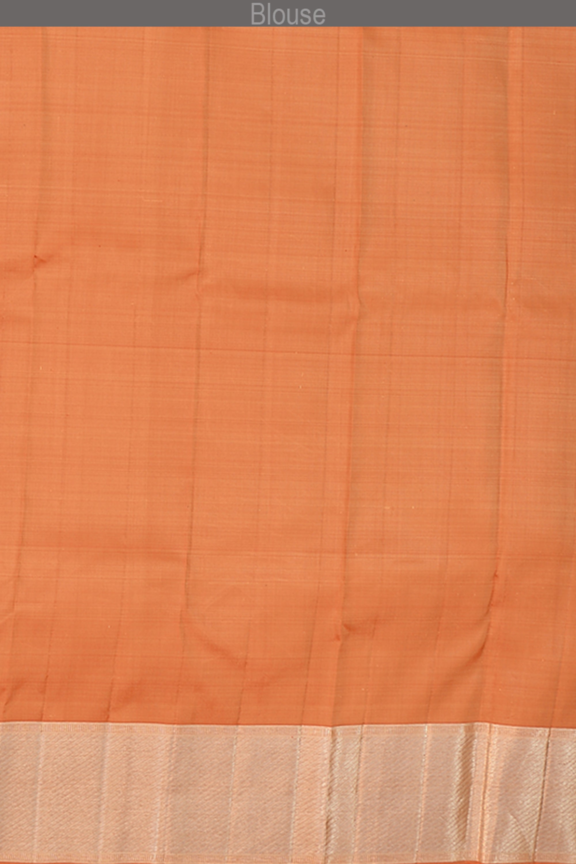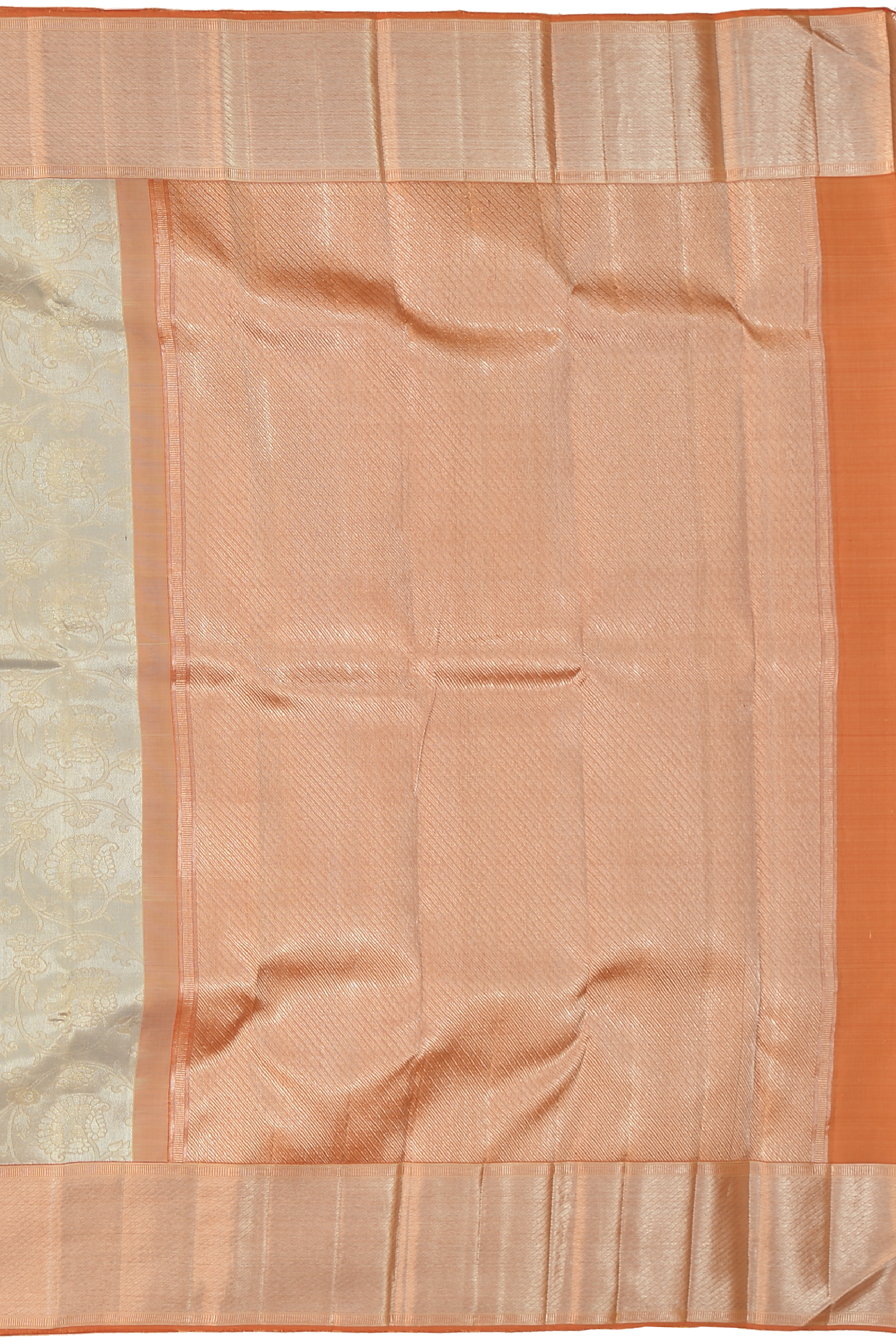 The diagonal stripes on the border add a touch of dynamism, leading to an ornate orange pallu adorned with diagonal silver zari lines. Its very grandeur whispers tales of the past, intricately woven into every thread.