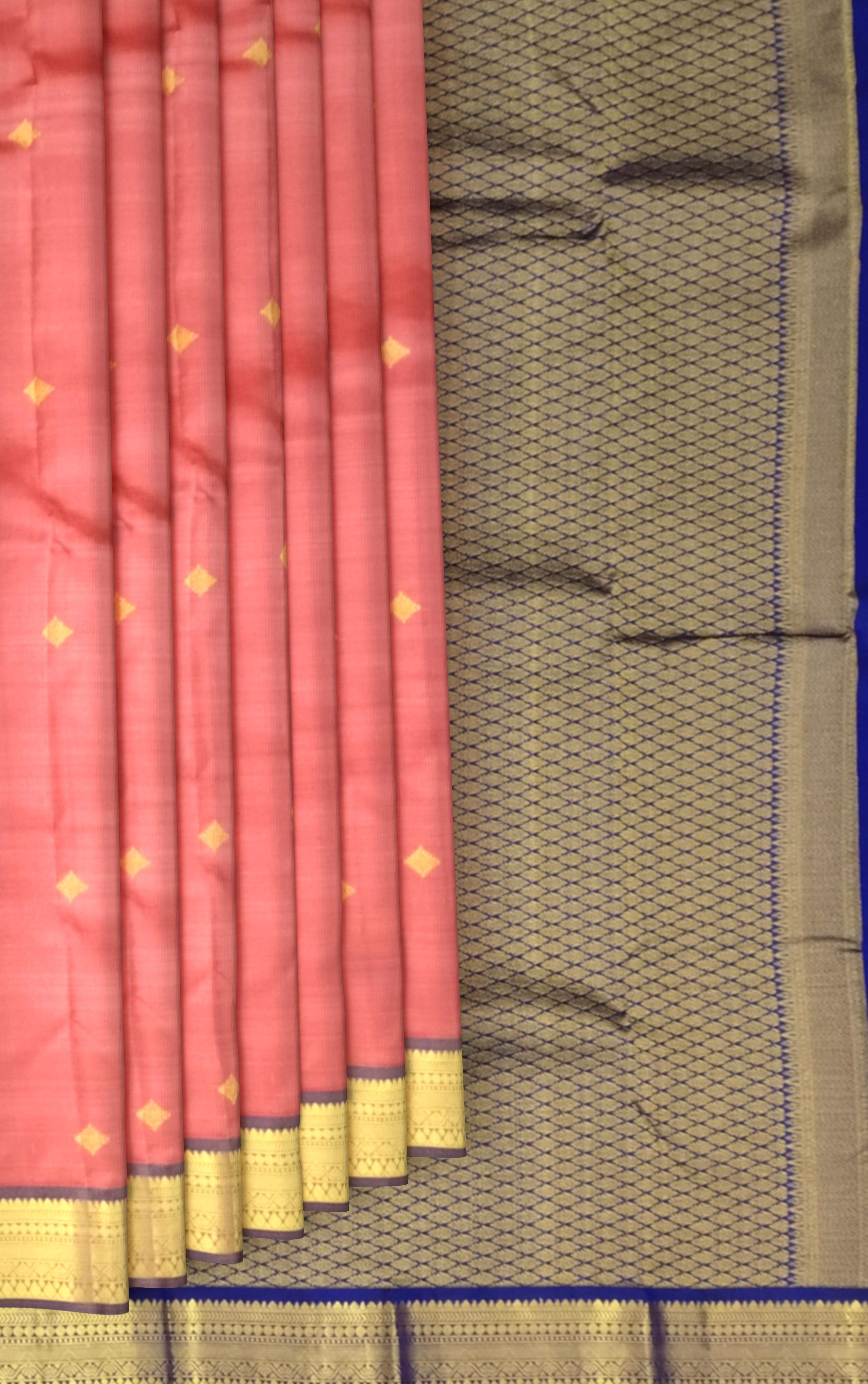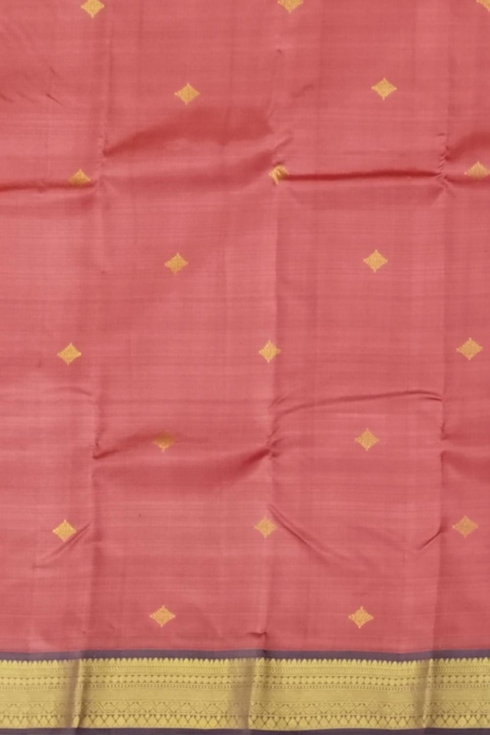 Adorn yourself in the radiant glow of this Tomato Pink Kanchipuram Silk Saree, magnificently embellished with diamond bhuttas. The vibrant tomato pink body exudes a joyful and festive spirit, while the intricate diamond-shaped motifs, meticulously woven in zari, add a touch of geometric precision and luxurious sparkle. This saree is a celebration of bold color and classic design, perfect for making a memorable statement.