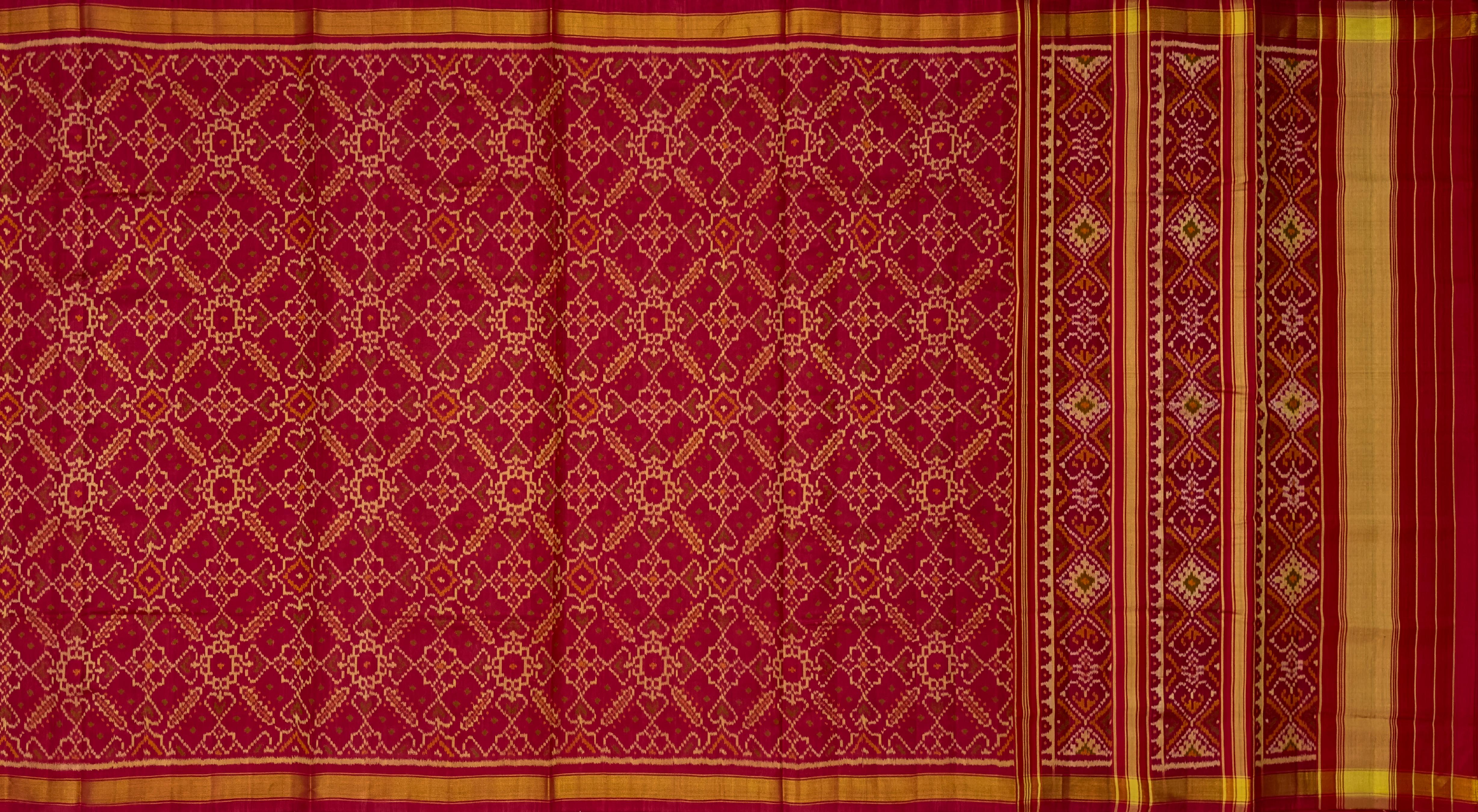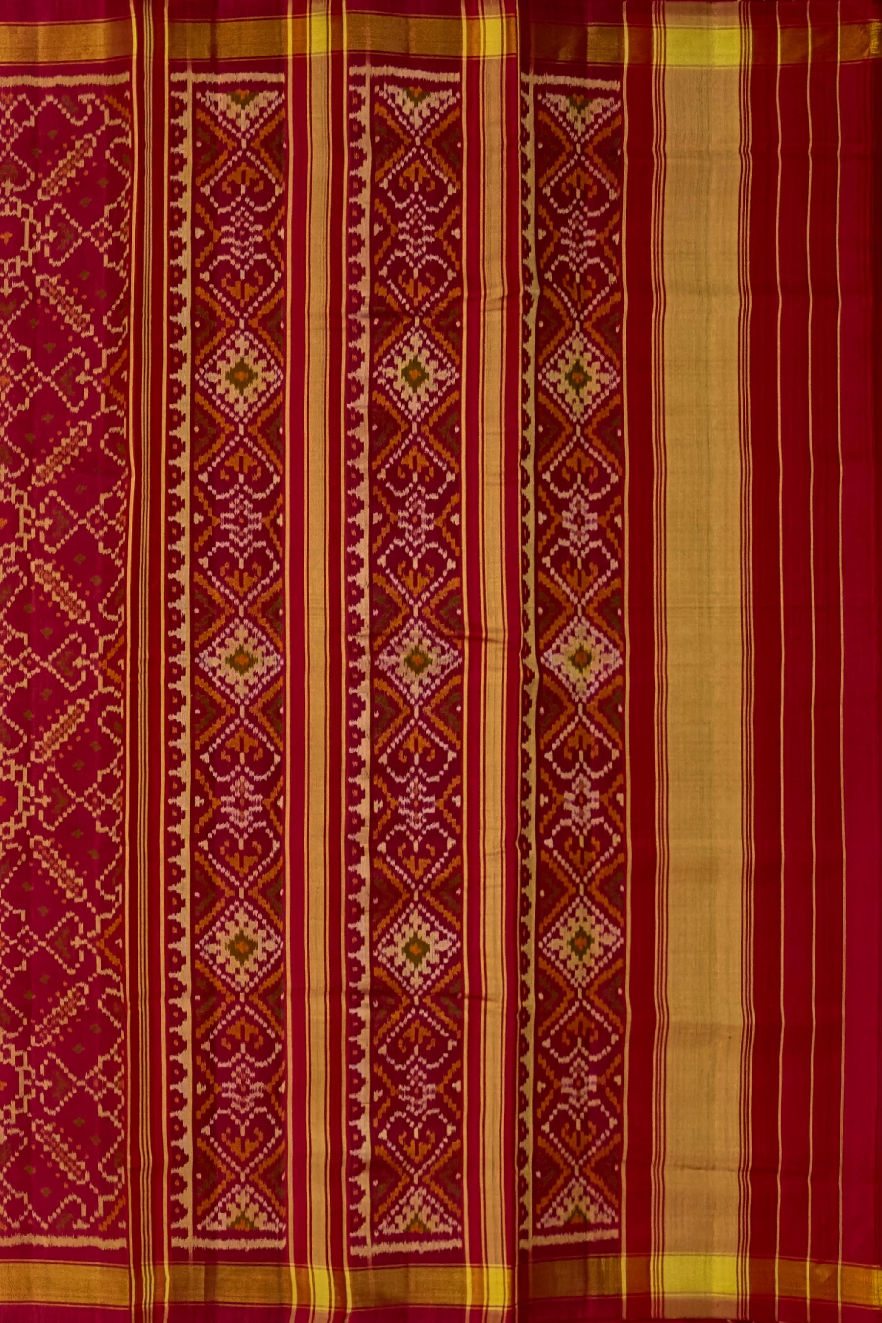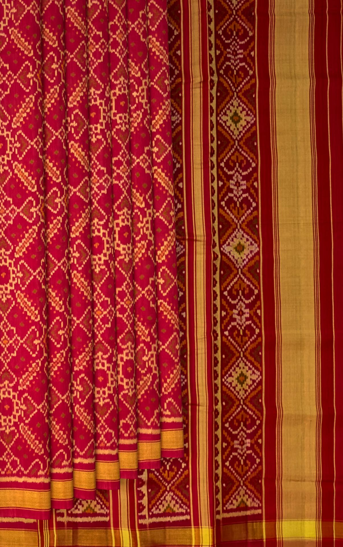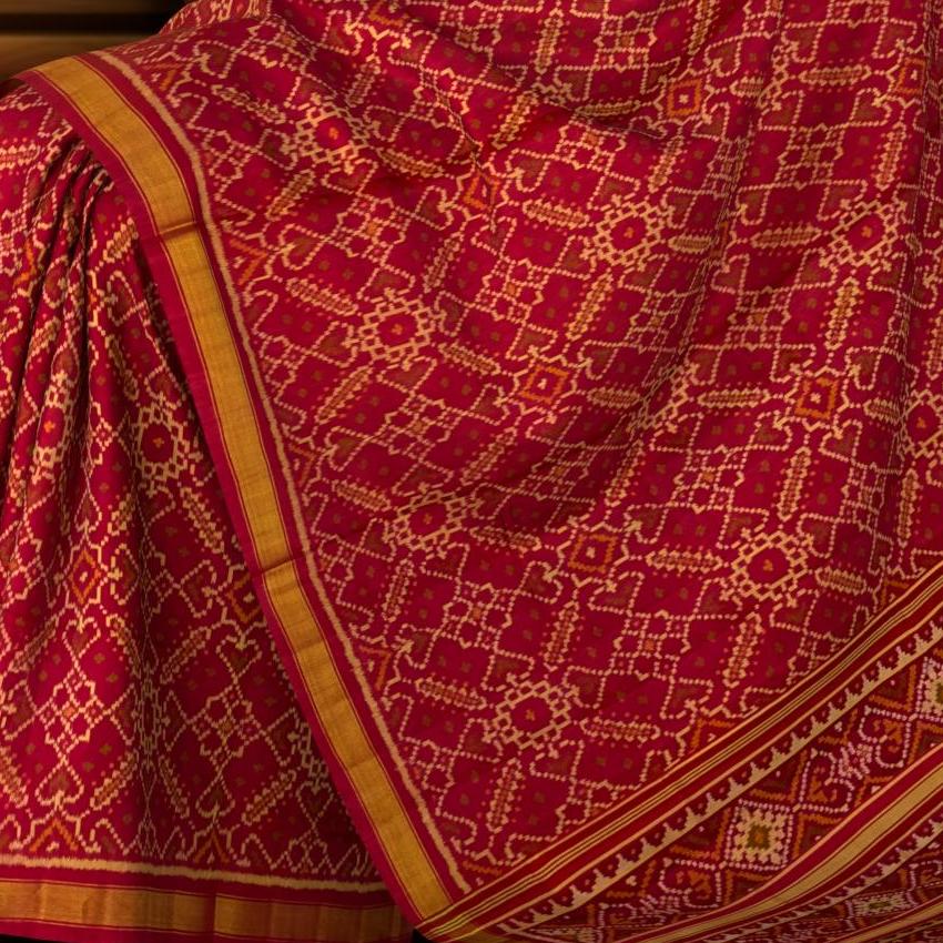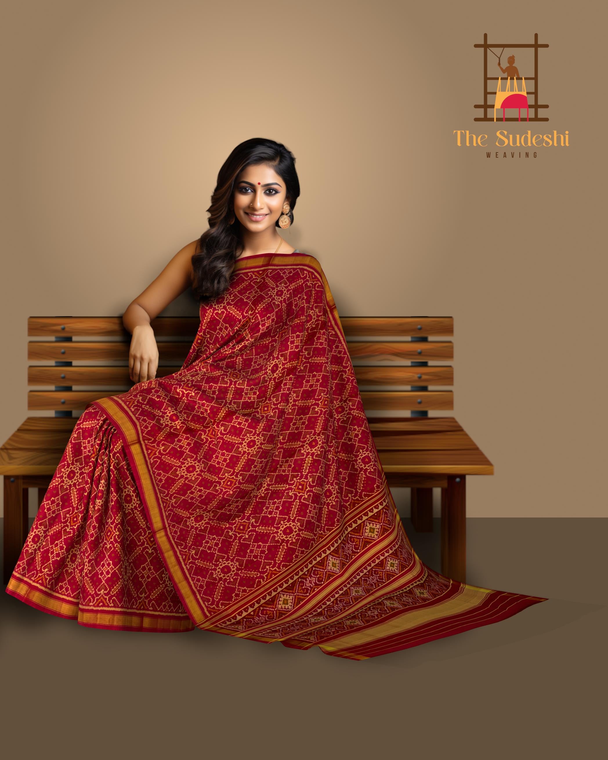 Step into timeless elegance with the Traditional Maroon Manekchowk Patola Saree, a masterpiece of Indian heritage. This exquisite saree showcases the meticulous single ikat technique, where each thread is dyed and woven with precision to create unique, soft-edged patterns that are synonymous with Rajkot Patola artistry. The saree features the intricate Manekchowk design, a luxurious spread of motifs that flow seamlessly from the body to the pallu, capturing the essence of traditional craftsmanship. The rich maroon hue exudes sophistication, making it a versatile choice for various occasions. Perfect for grand weddings, elegant social gatherings, or cultural events, this saree is designed for the modern NRI woman who cherishes her Indian heritage. It embodies centuries of artisan tradition, making each piece a unique narrative of cultural pride. Embrace this Maroon Manekchowk Patola Saree as a symbol of beauty and tradition, a timeless addition to your wardrobe that celebrates your roots with every wear.