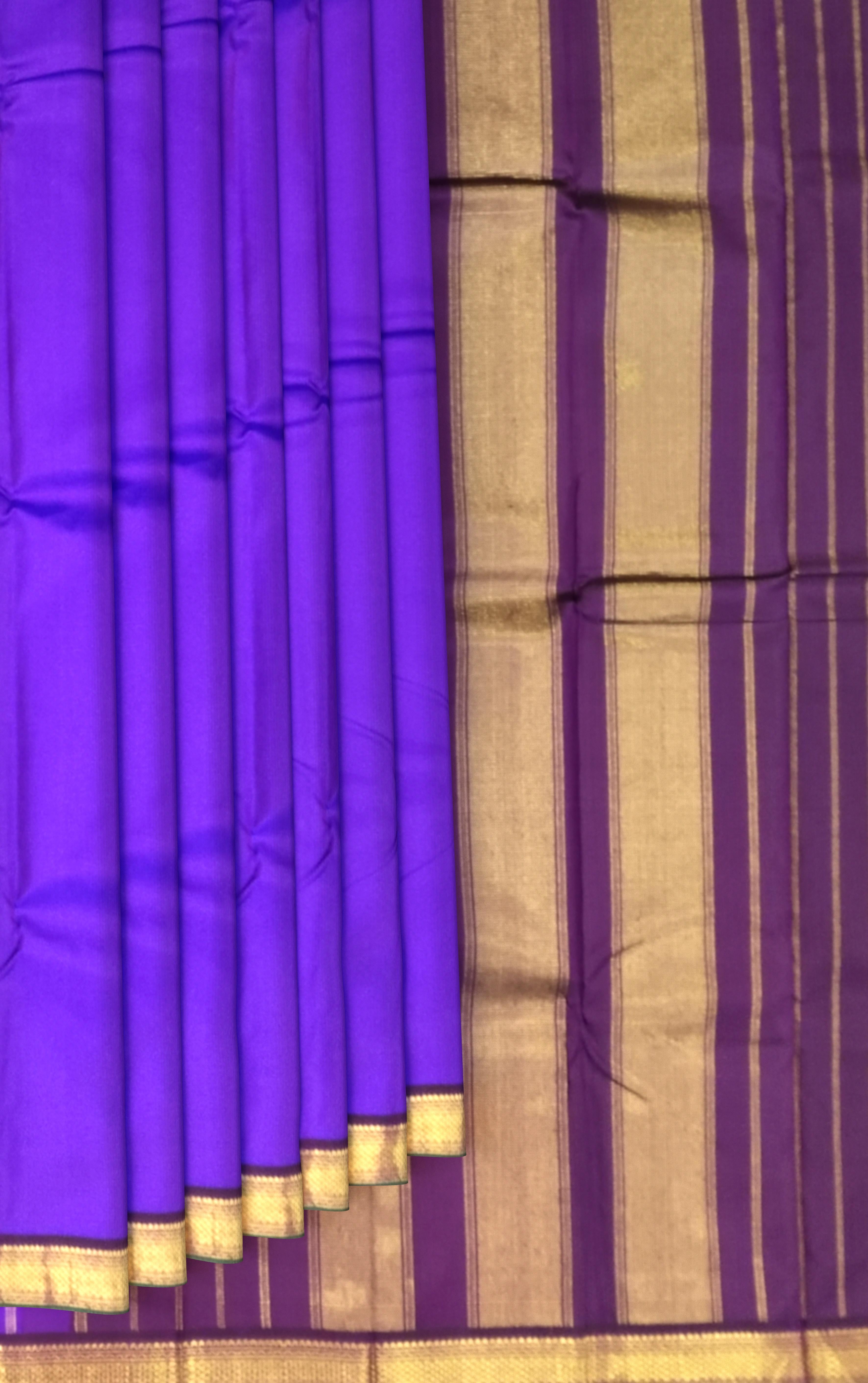 Understated elegance meets refined tradition in this violet Kanchipuram silk saree, highlighted by a deep brown border and a subtle green selvedge. The plain body lets the natural luster of pure silk speak for itself, while the contrasting borders add a layered depth that’s both graceful and grounded.