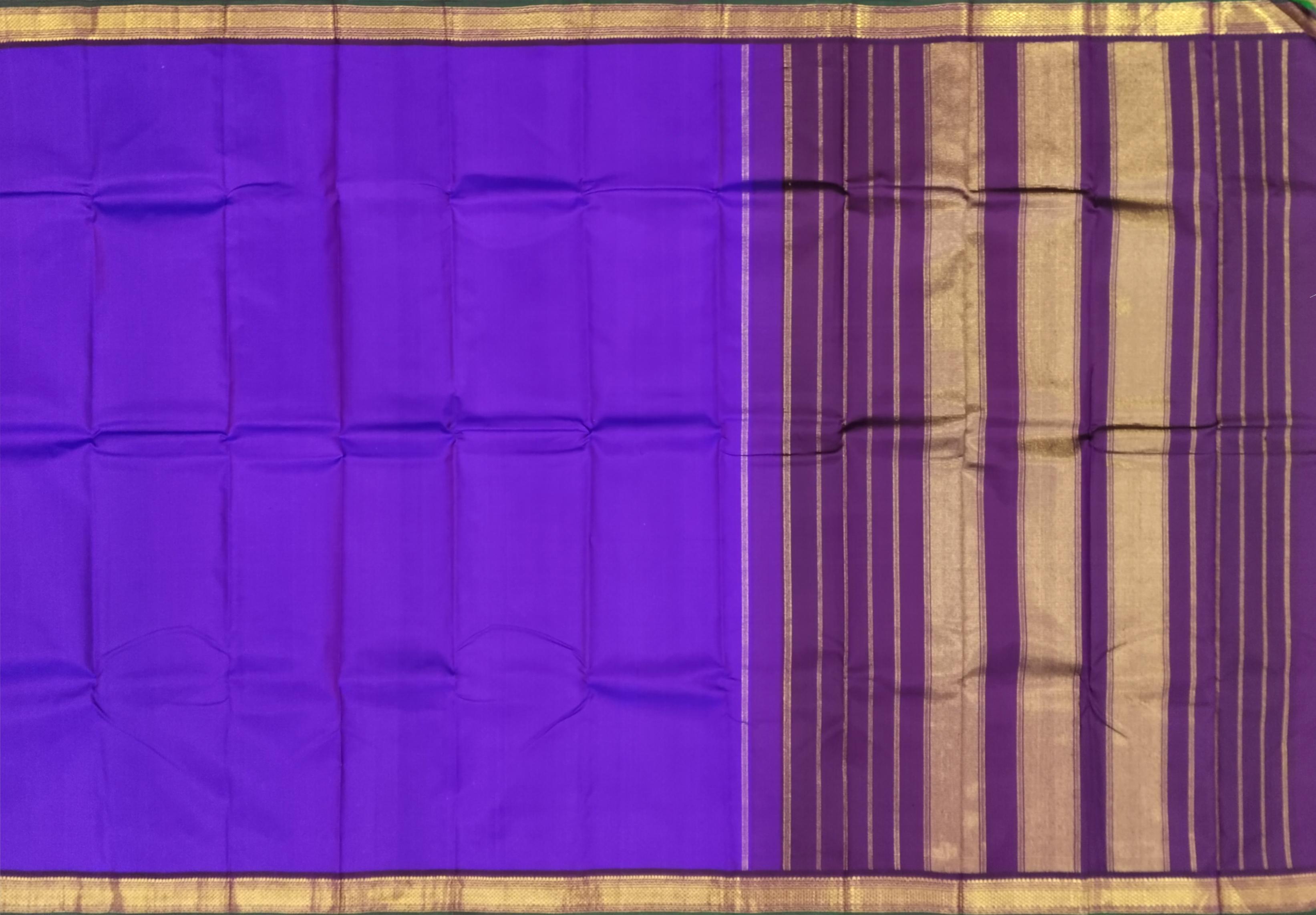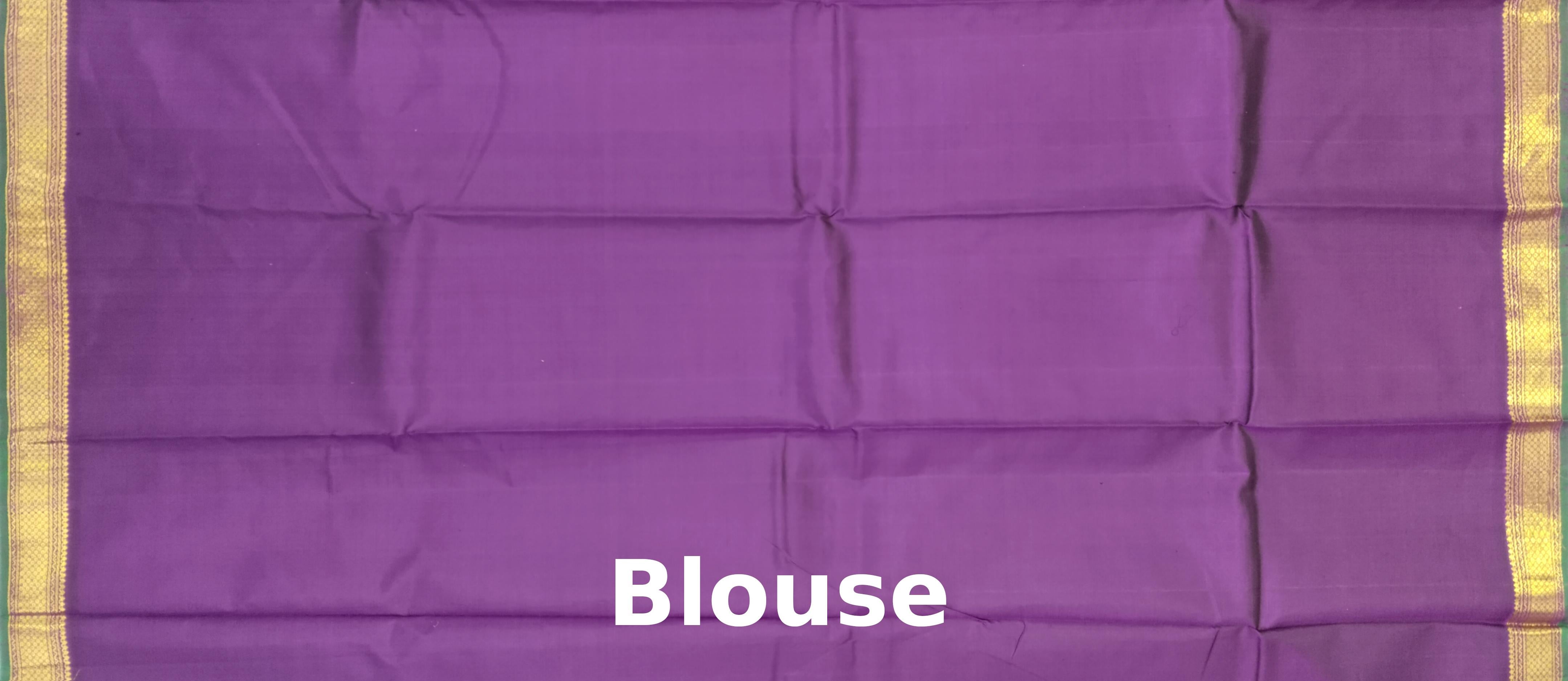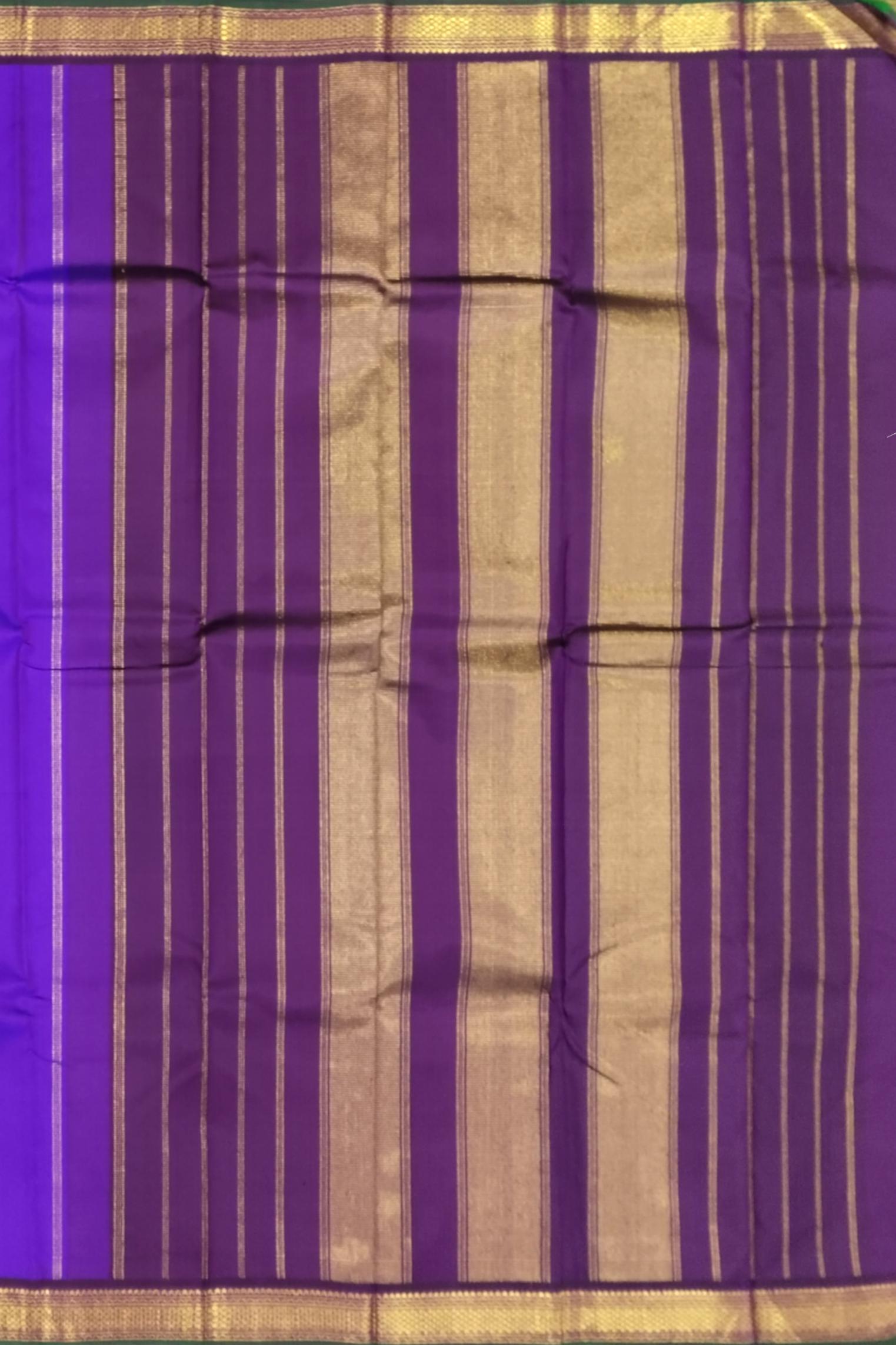 Woven in the iconic handlooms of Kanchipuram, this saree is a testament to master craftsmanship. The violet shade signifies creativity and wisdom in Indian culture, while the green selvedge subtly symbolizes freshness and growth. The simplicity of the weave, combined with the richness of silk, makes this saree a versatile and timeless classic.