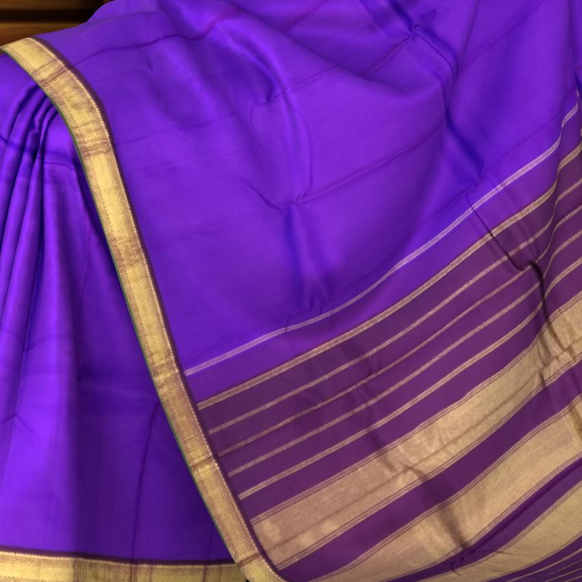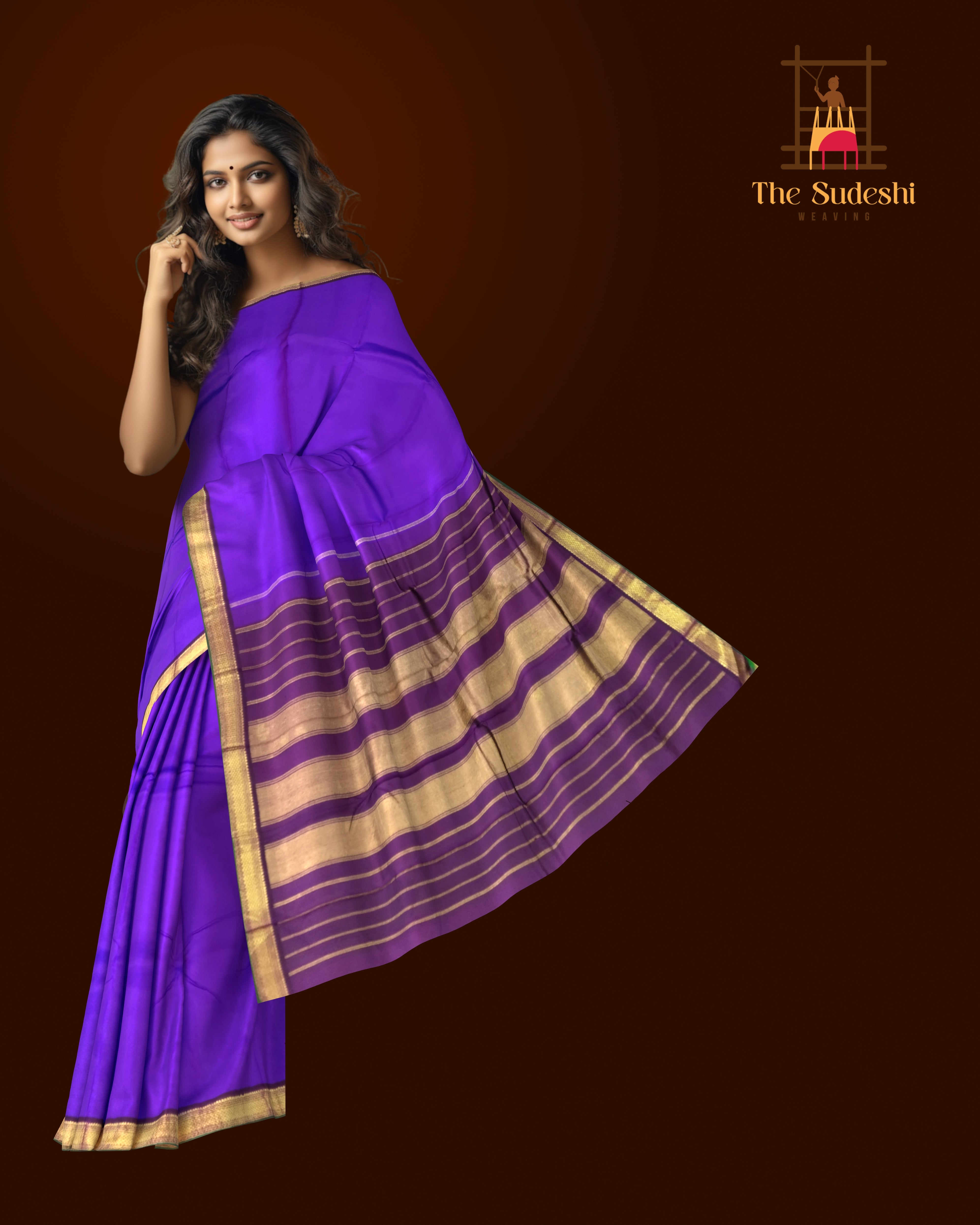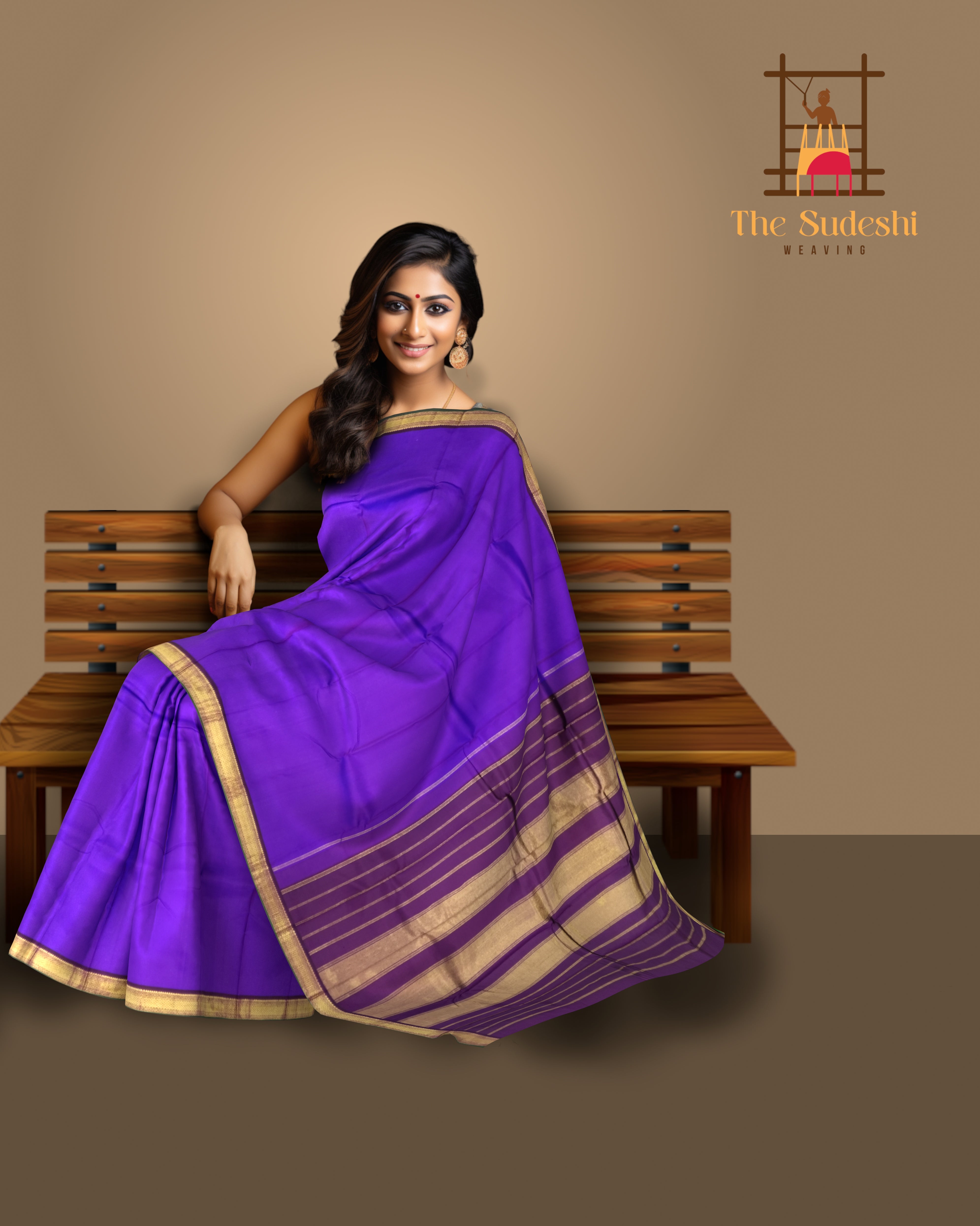 Woven in the iconic handlooms of Kanchipuram, this saree is a testament to master craftsmanship. The violet shade signifies creativity and wisdom in Indian culture, while the green selvedge subtly symbolizes freshness and growth. The simplicity of the weave, combined with the richness of silk, makes this saree a versatile and timeless classic.
