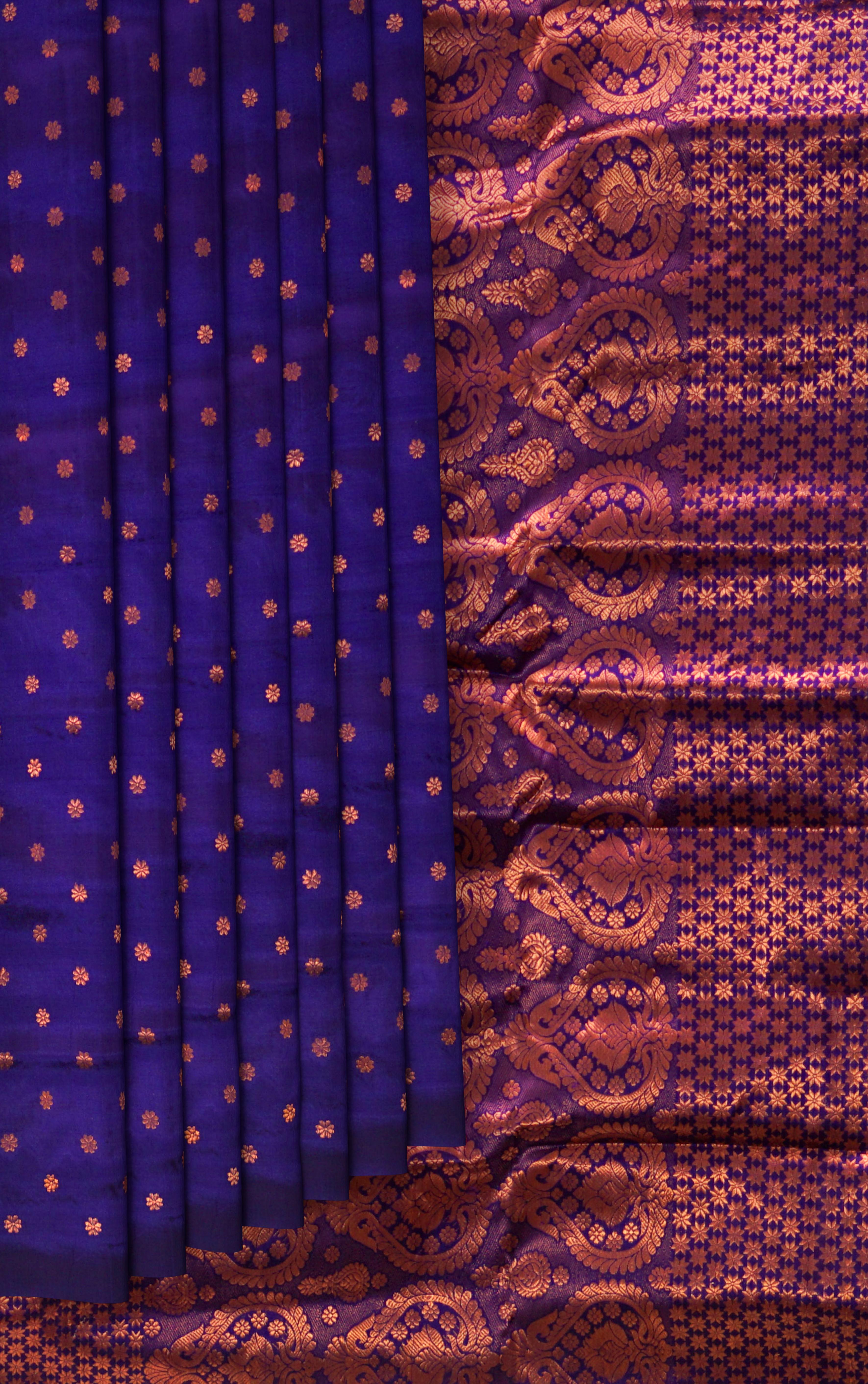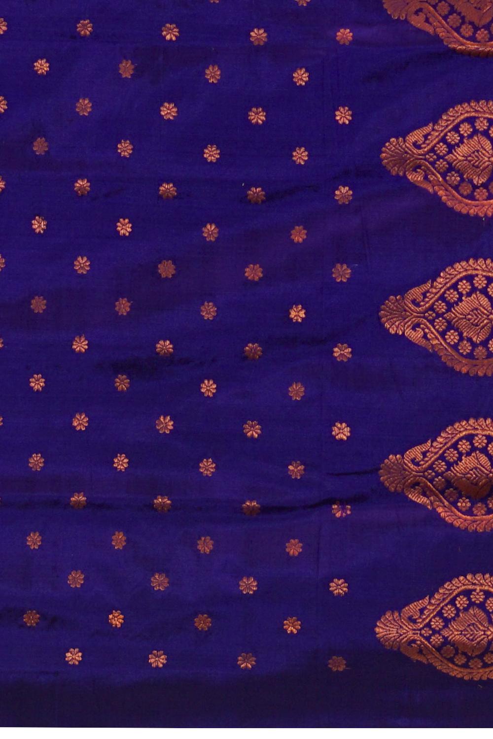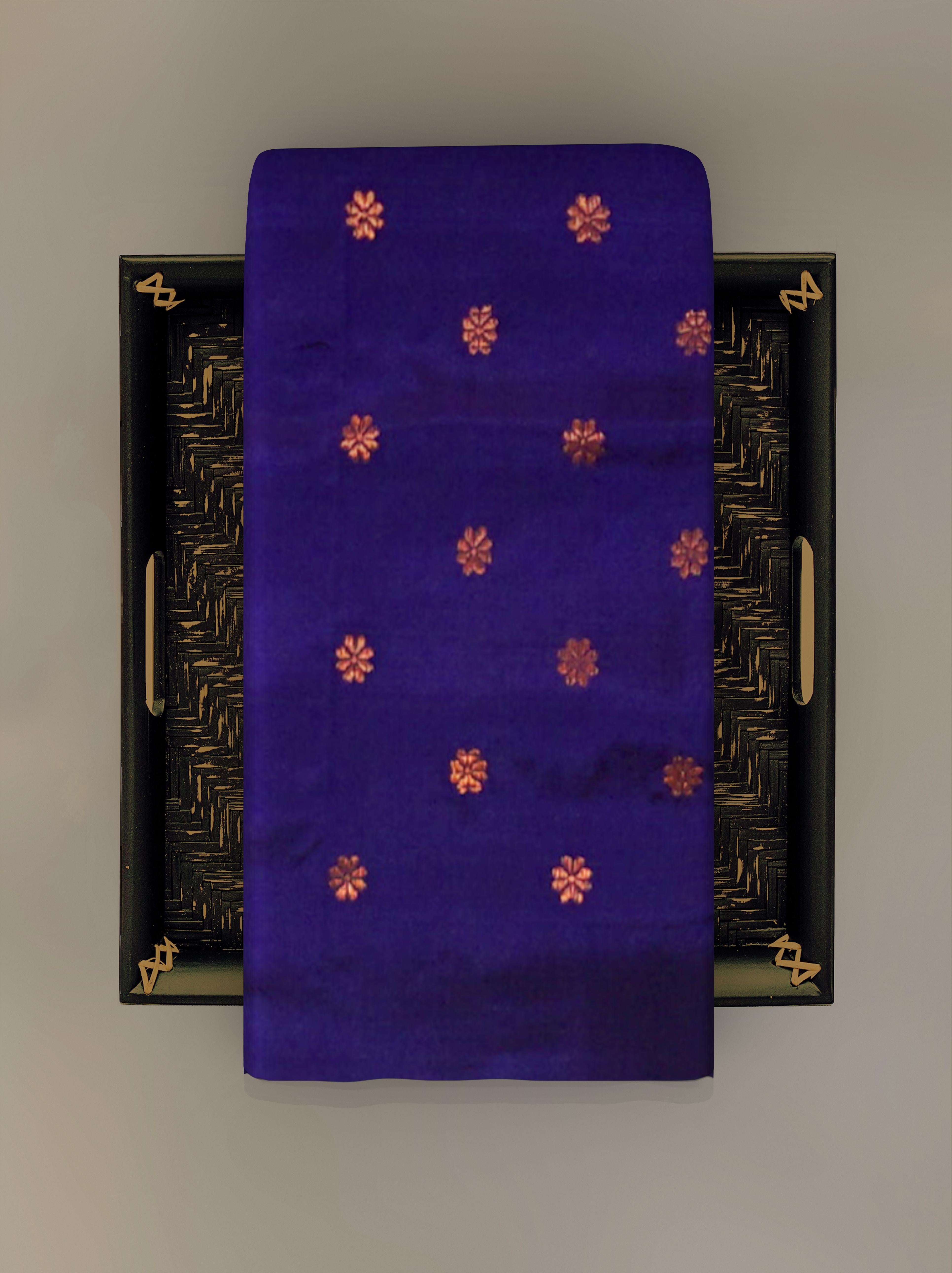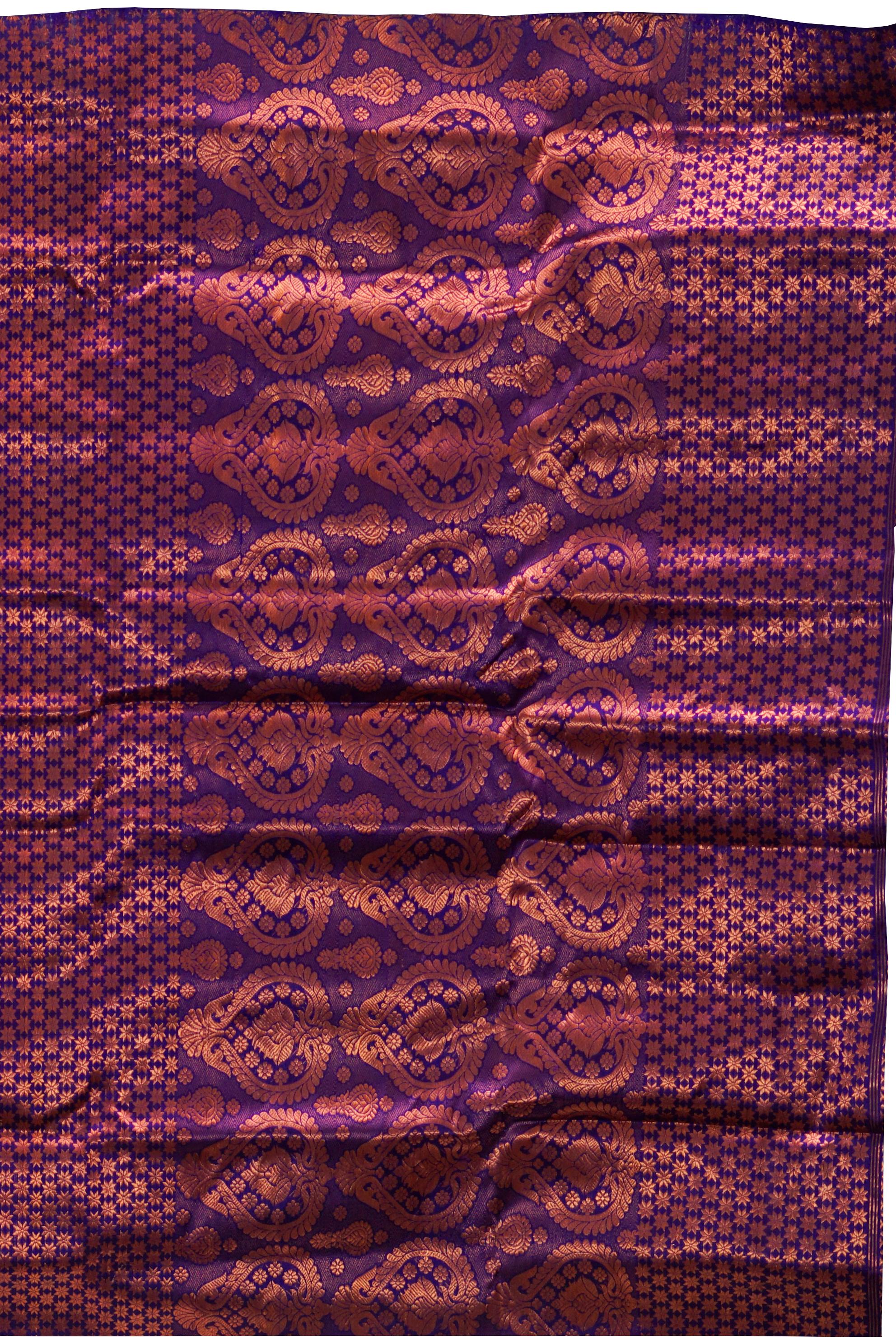 The motifs on this saree are inspired by Assamese culture and nature, featuring geometric and stylized patterns that symbolize flowers, plants, and traditional artifacts. These motifs, woven using the extra-weft technique and local zari, add a raised, embossed effect that enhances the saree's texture and depth. The combination of violet and brown is both regal and timeless, appealing to women of all ages.