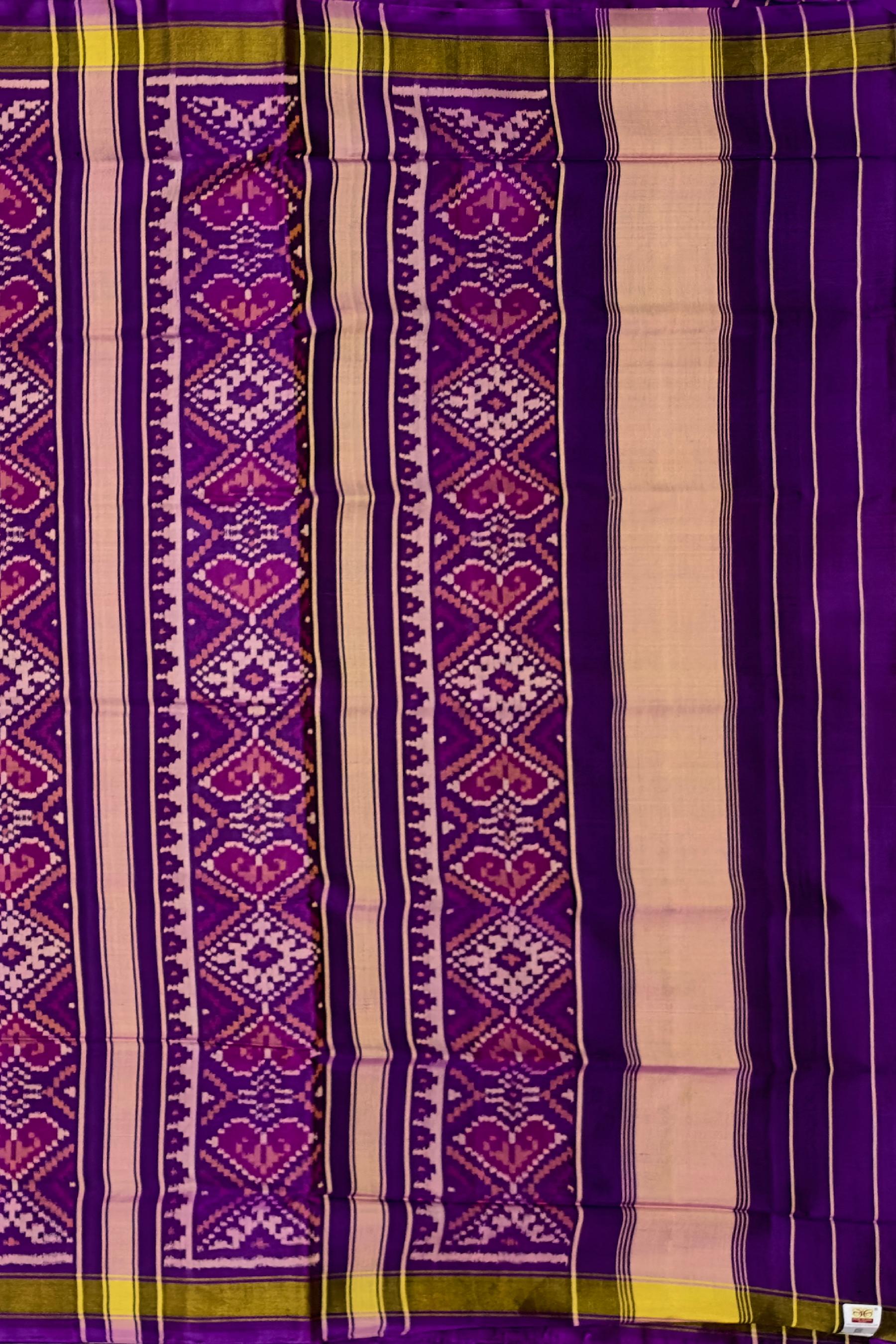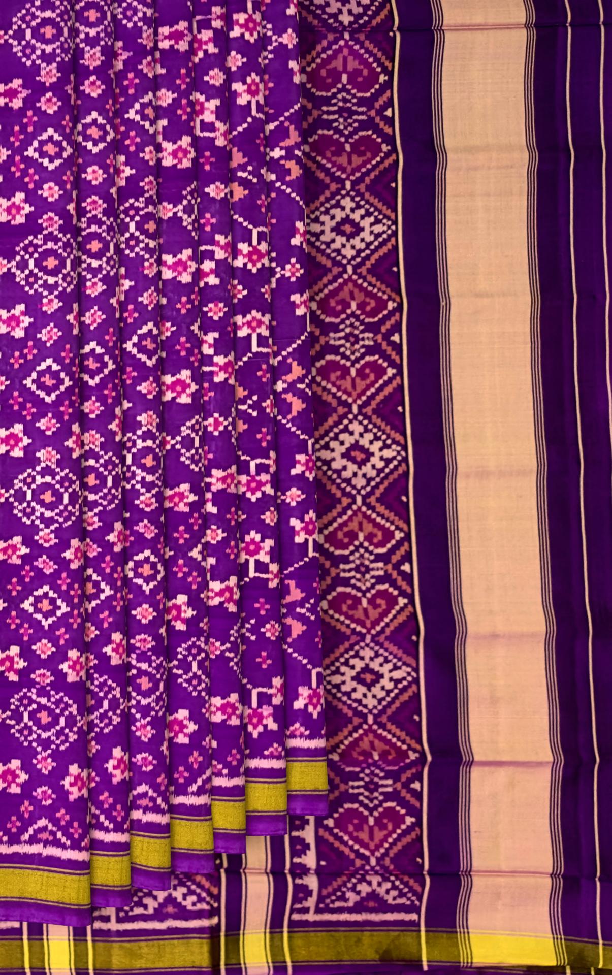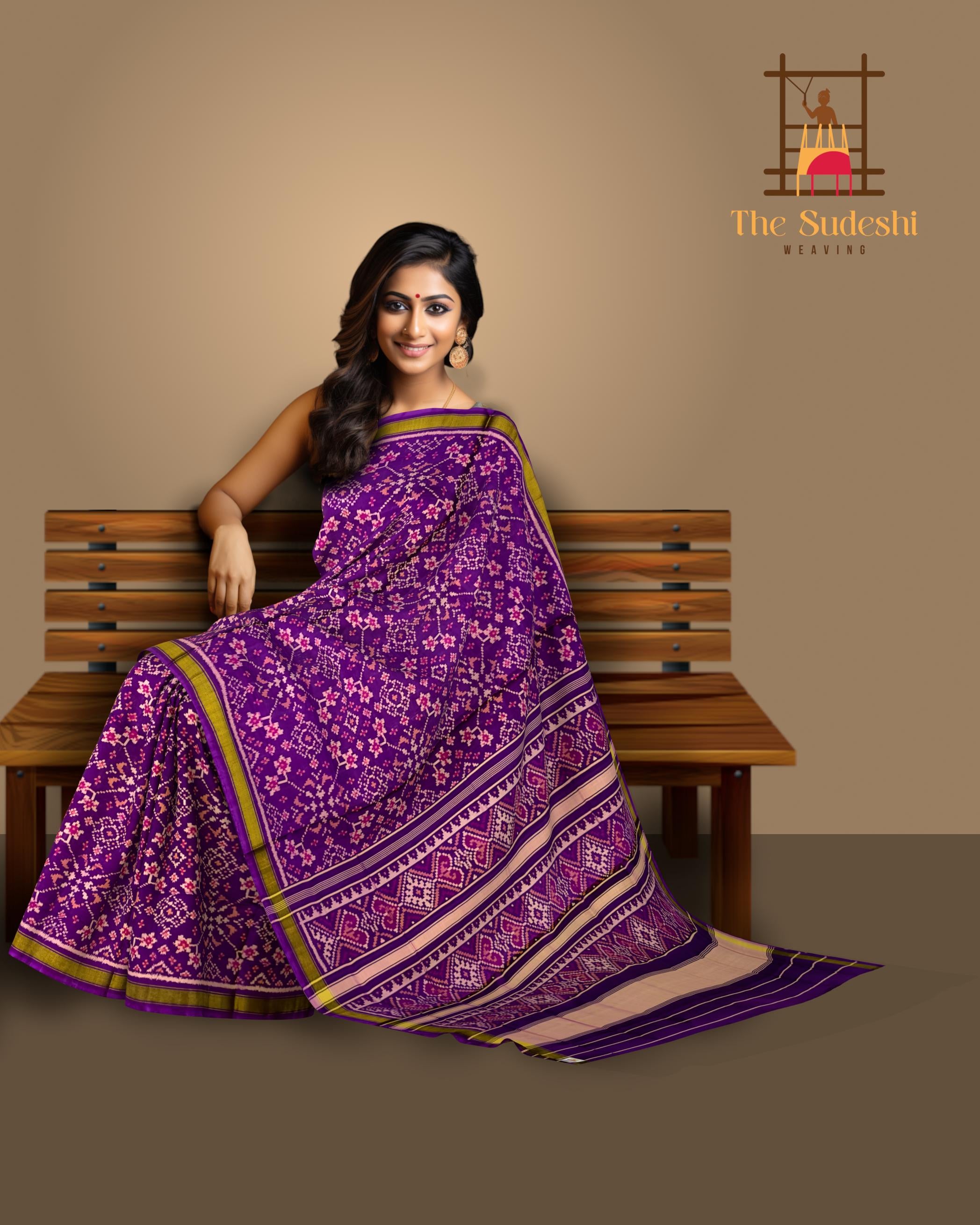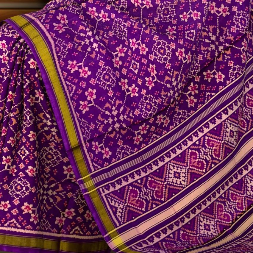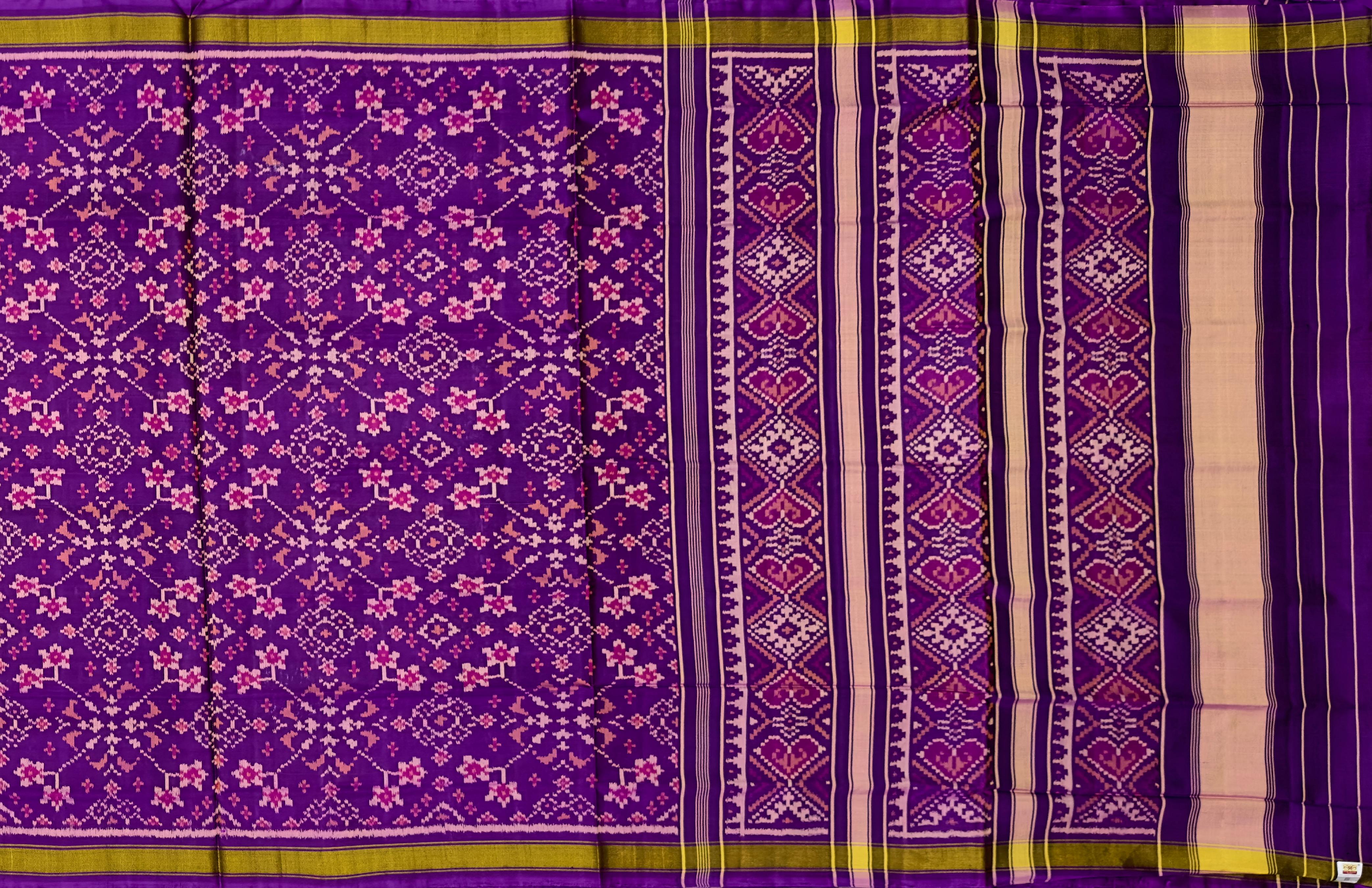 In the Violet Rajkot Patola Saree, traditional motifs meet contemporary hues. The 'Navratna' design spans the saree, offering a majestic look perfect for any grand event. This saree combines heritage with luxury, ensuring that each wear is a statement of elegance and cultural pride.