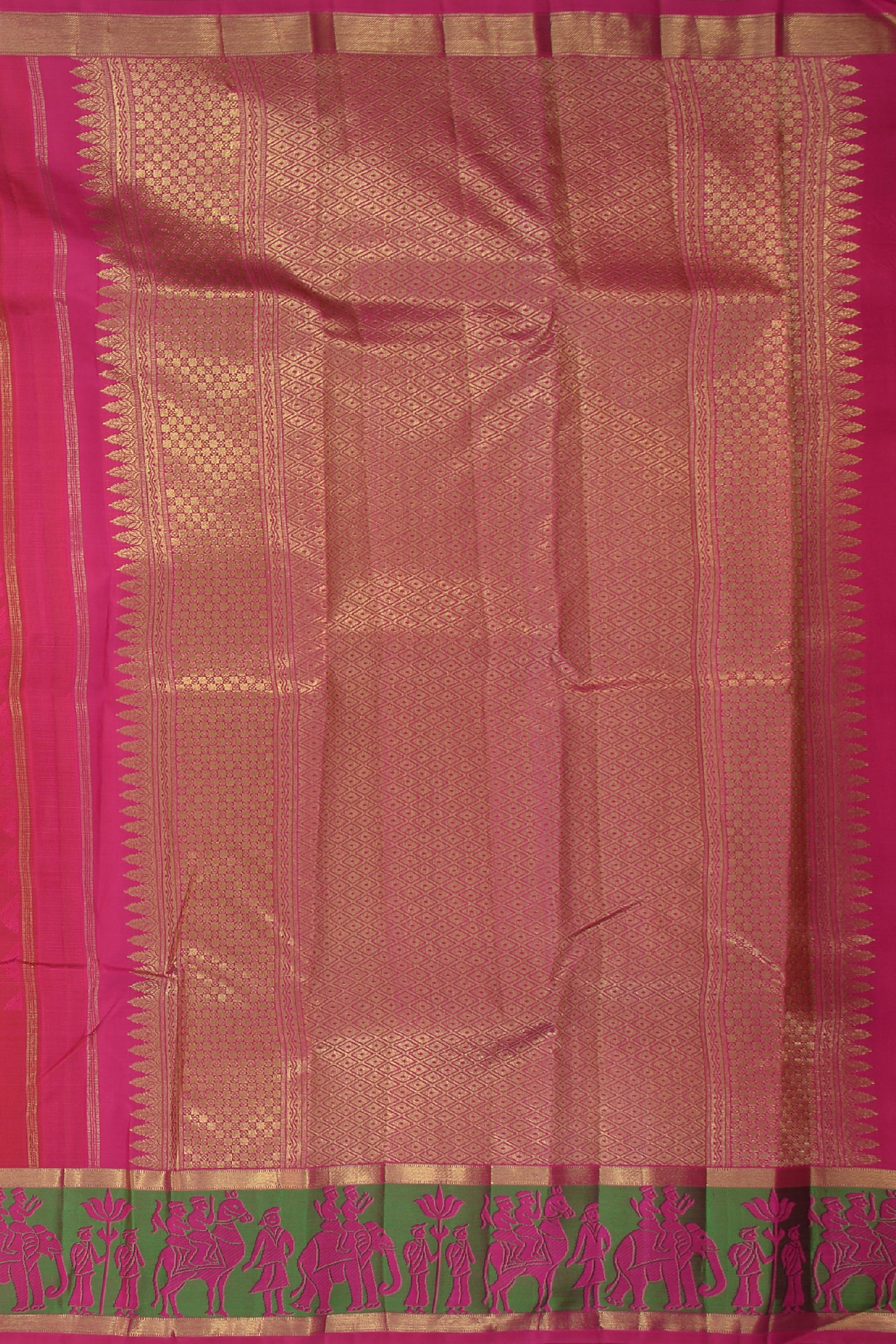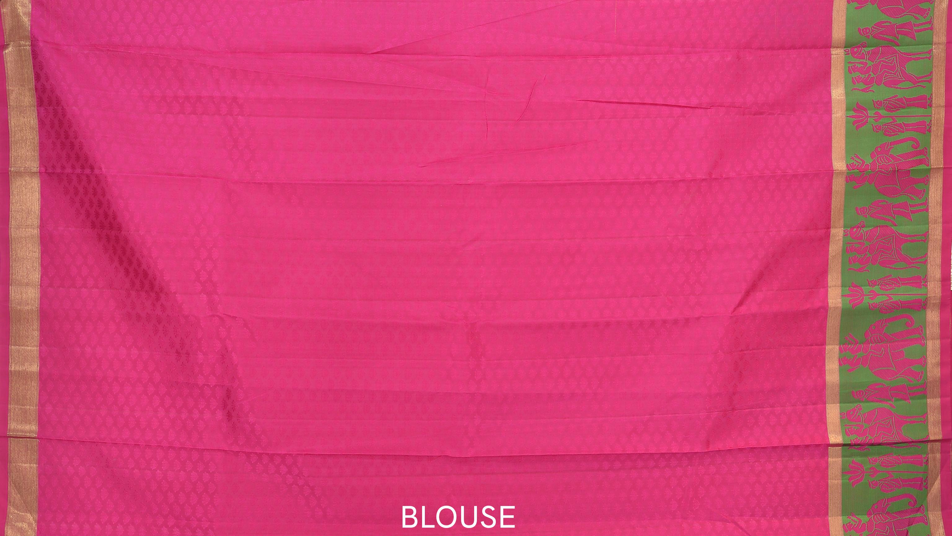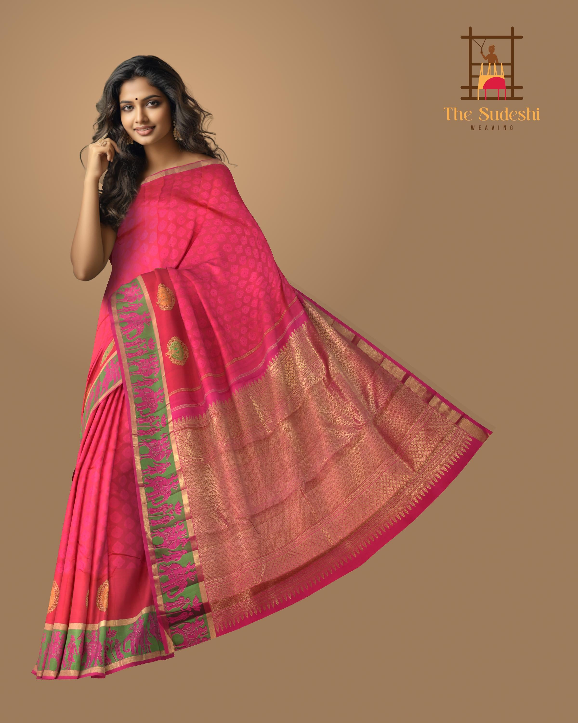 The threadwork border is a craft masterpiece, weaving together motifs of camels, elephants, and ceremonial scenes, creating a tapestry that celebrates the rich tapestry of Indian culture. The self-colored pallu, intricately woven with a diamond design, adds a touch of grandeur and sophistication, making it a perfect choice for festive occasions and celebrations.