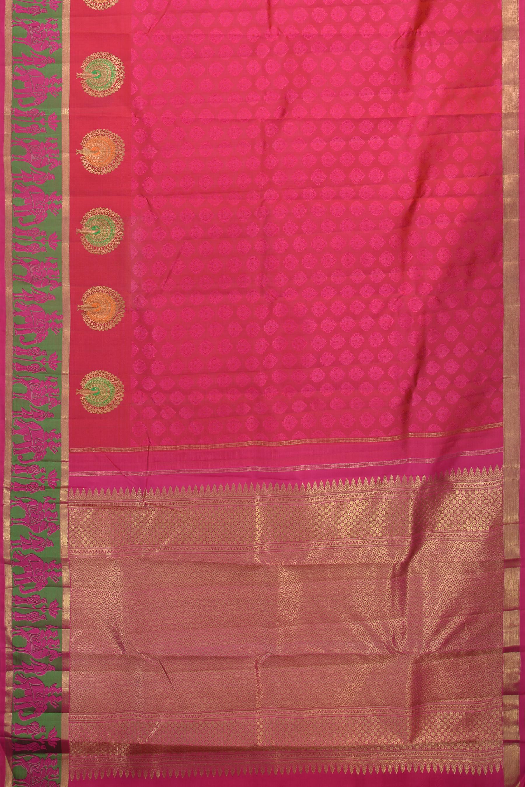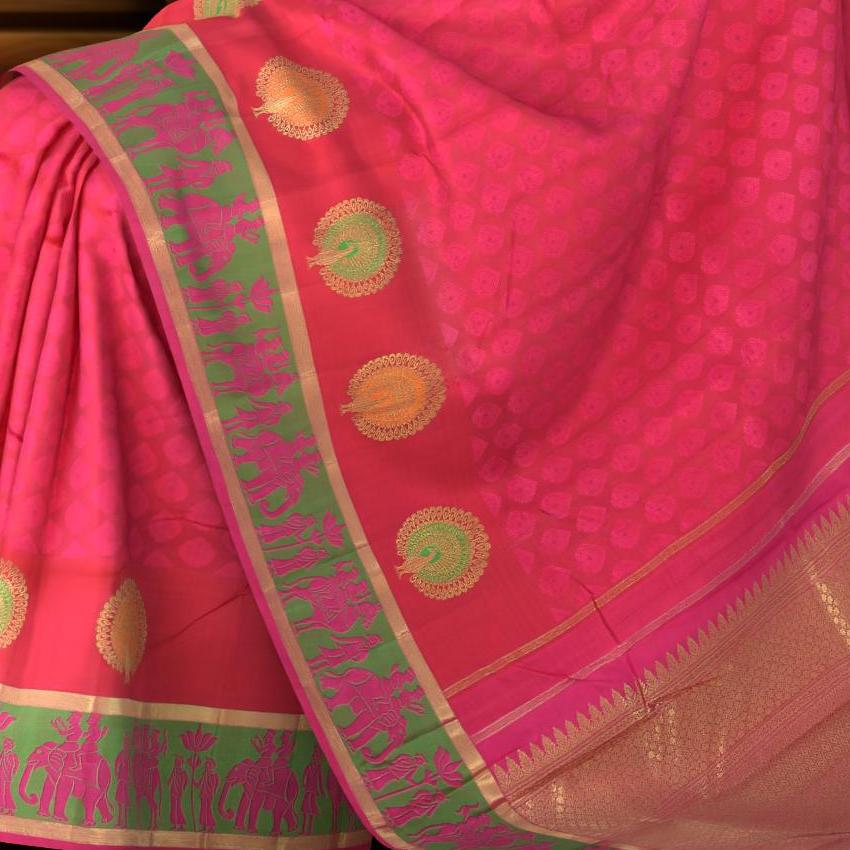 Drape yourself in the vibrant hues of watermelon pink with this Kancheevaram silk saree, a piece that exudes joy and vibrancy. The saree features an intricate jacquard weave of meenakari peacocks, each detail bursting with life and color, symbolizing beauty, grace, and the dance of life.